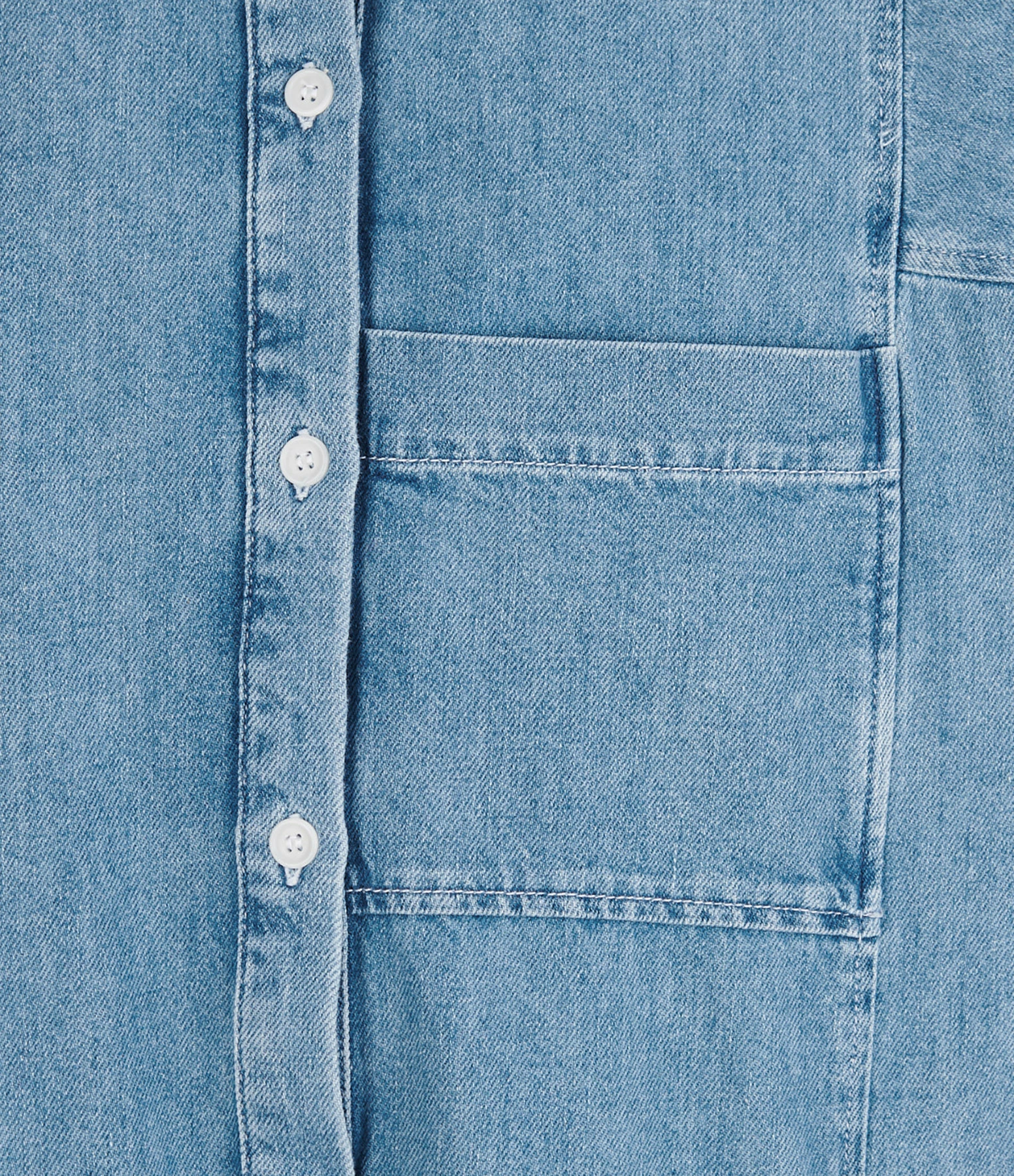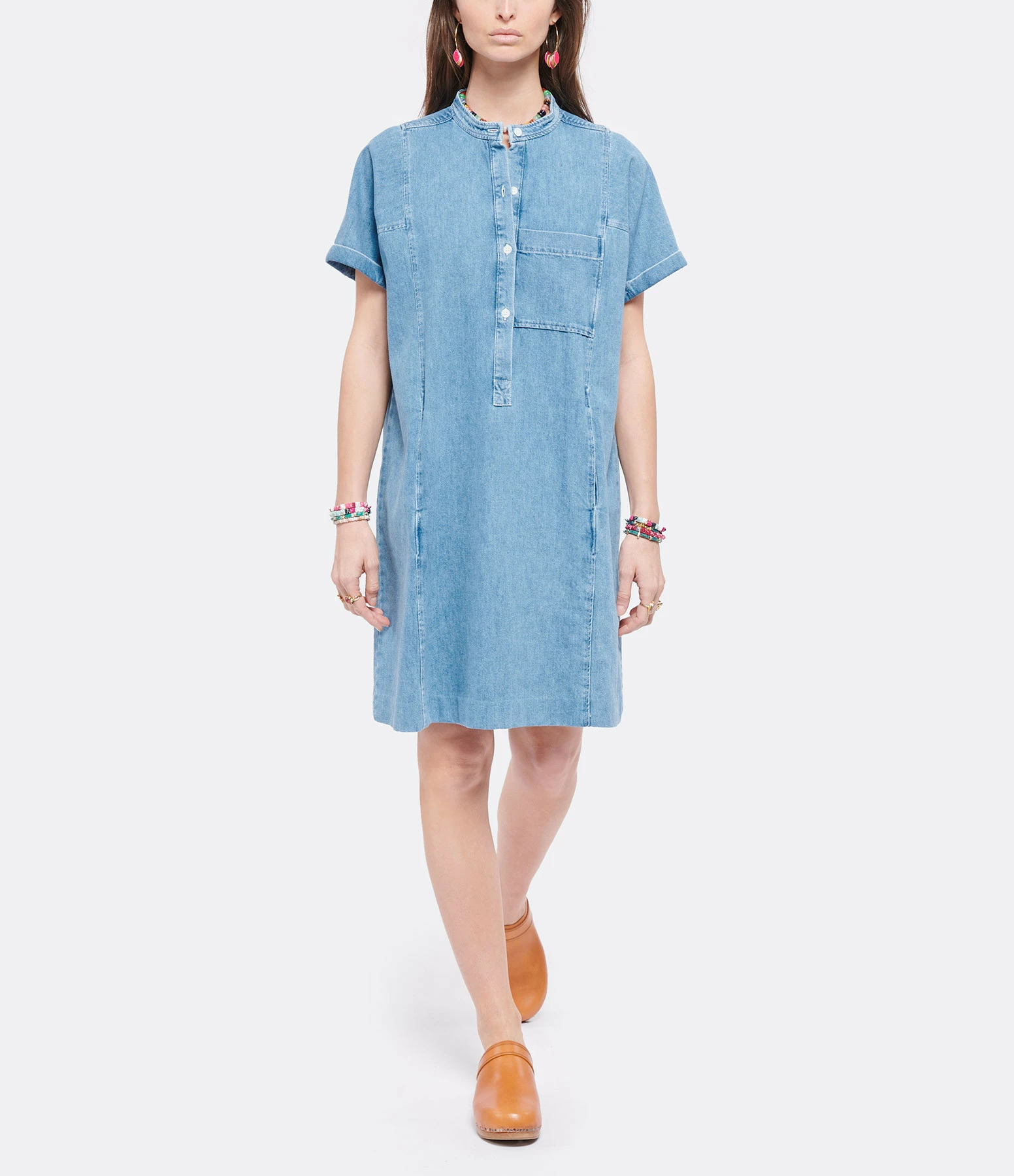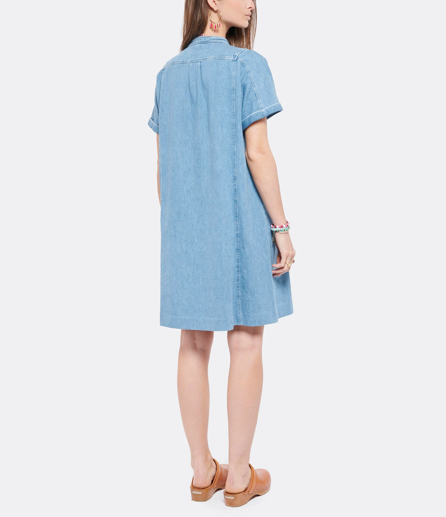 Robe courte en denim bleu. Manches courtes retroussées. Col arrondi. Fermeture par boutons. Poche plaquée. Deux poches fendues sur le devant. Coupe droite. Base droite.