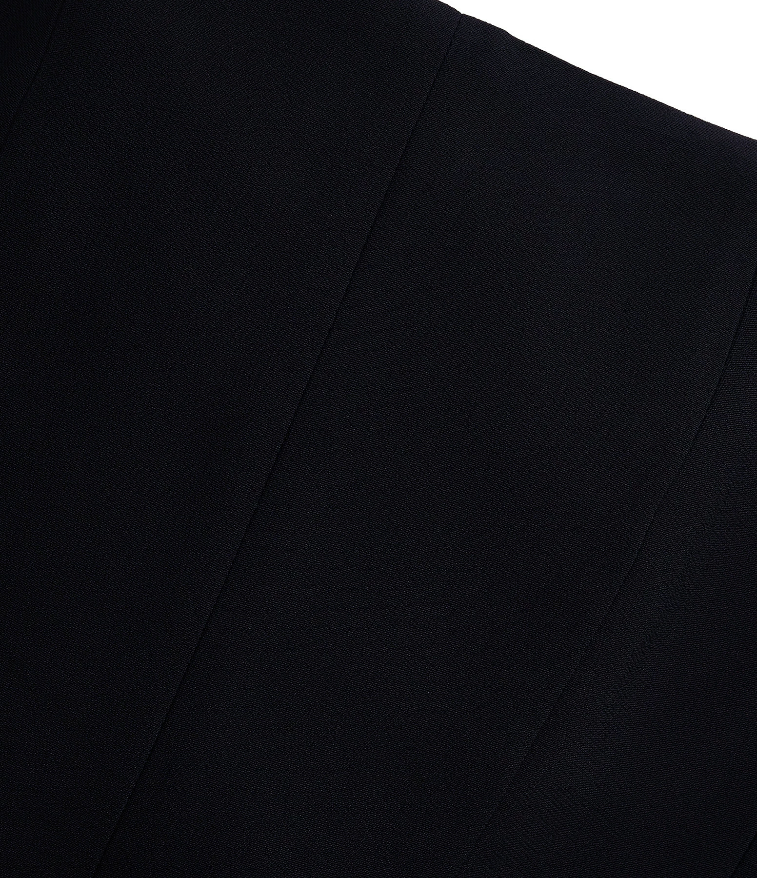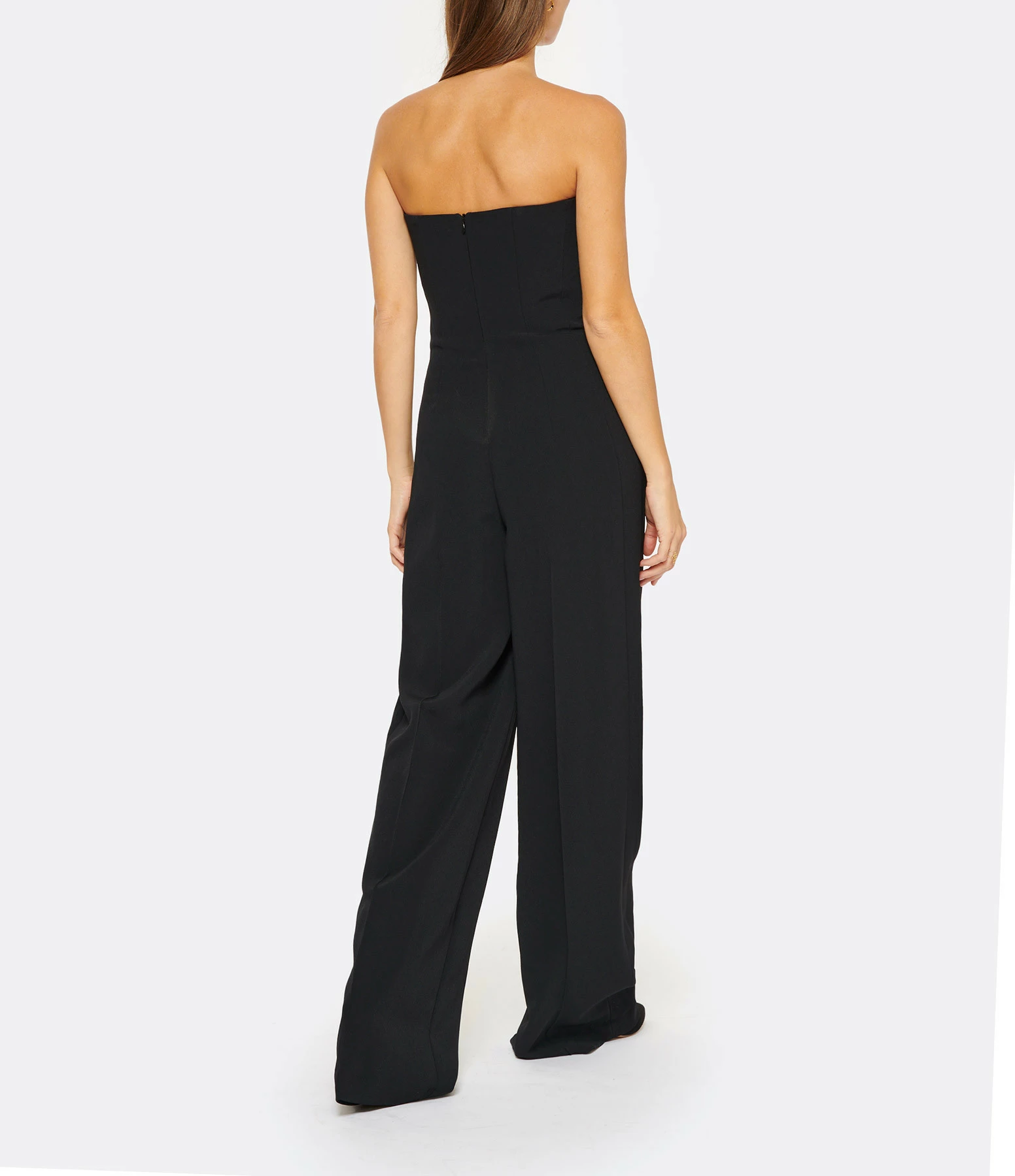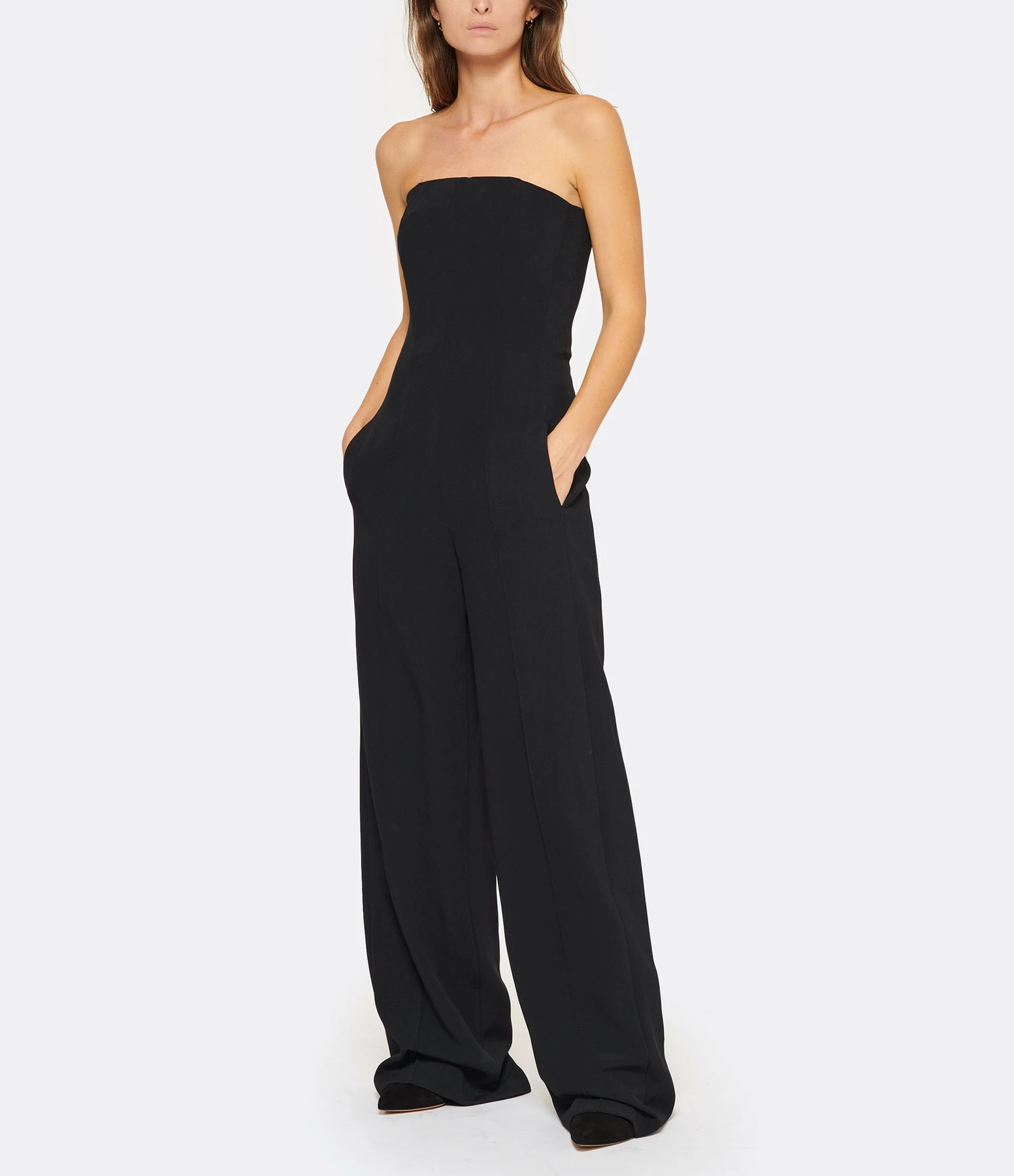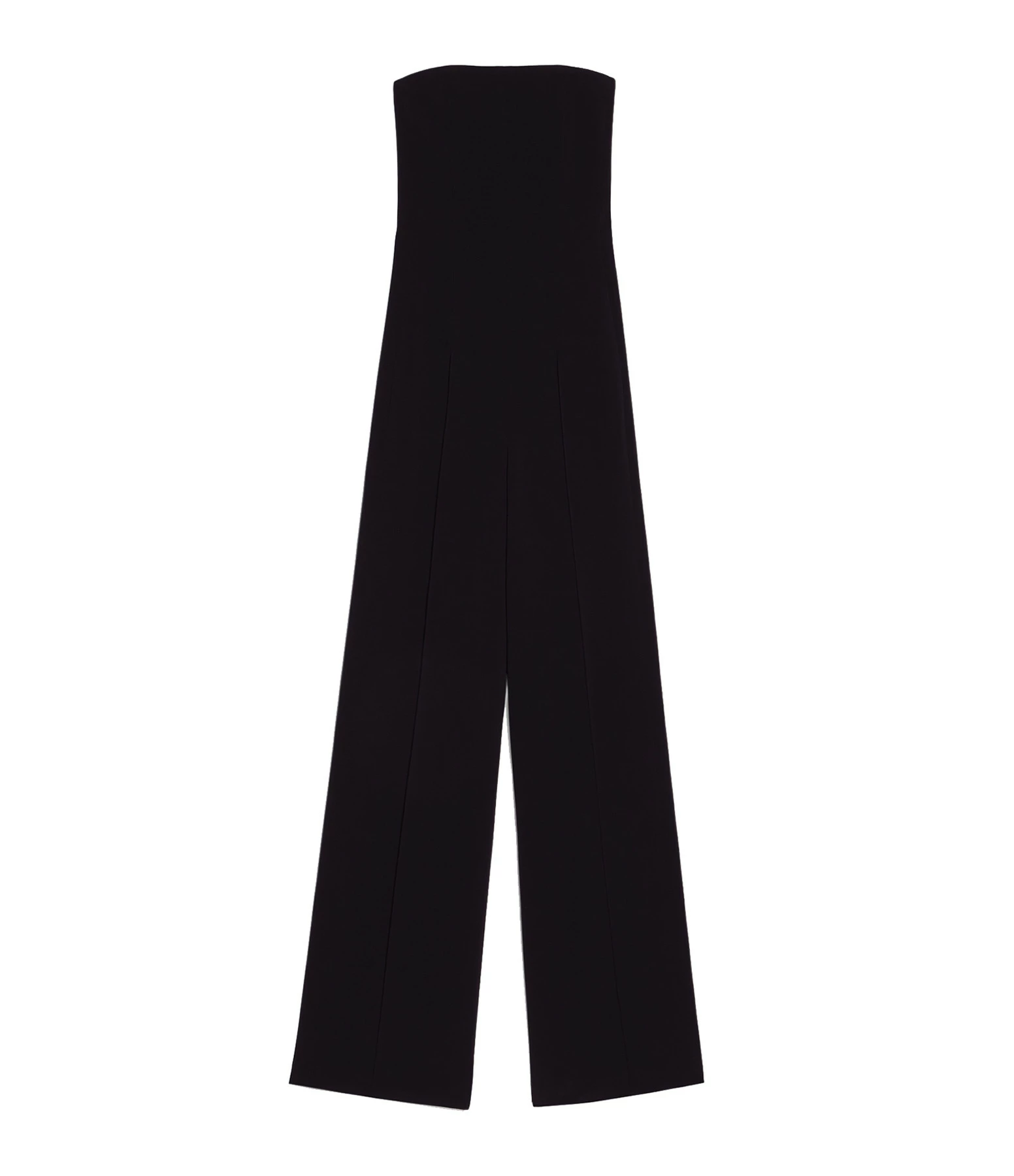 Combinaison pantalon noire. Encolure bandeau. Sans manches. Fermeture zippée invisible milieu dos. Deux poches prises dans les coutures latérales sur le devant. Coupe buste près du corps. Coupe jambe large. Base droite. Doublée jusqu’aux genoux.