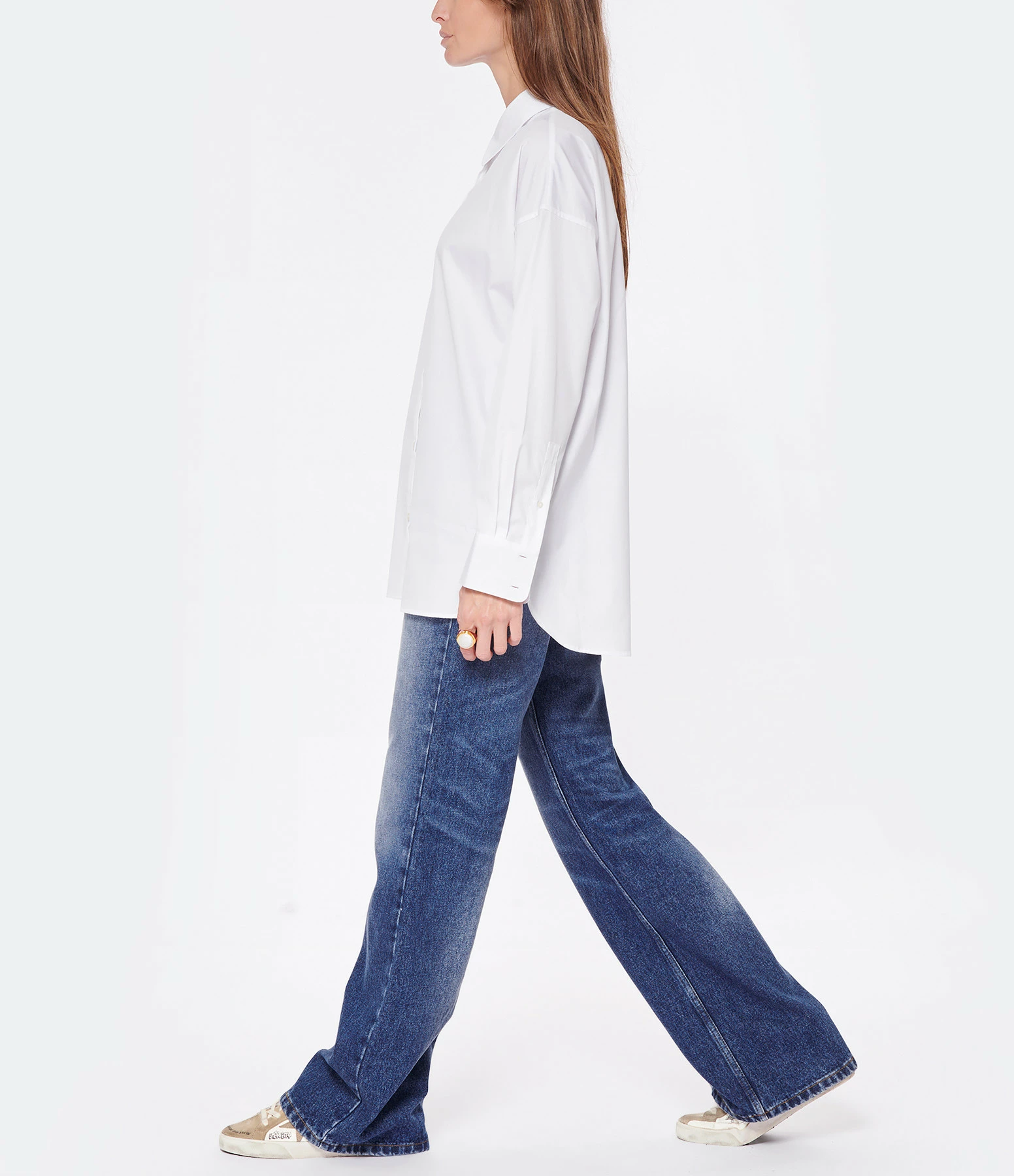 Pantalon en denim de coton bleu délavé. Passants pour ceinture. Braguette zippée et boutonnée. Deux poches italiennes et une poche à gousset. Deux poches plaquées dans le dos. Jacron noir dans le dos. Coupe boyfriend. Base droite.