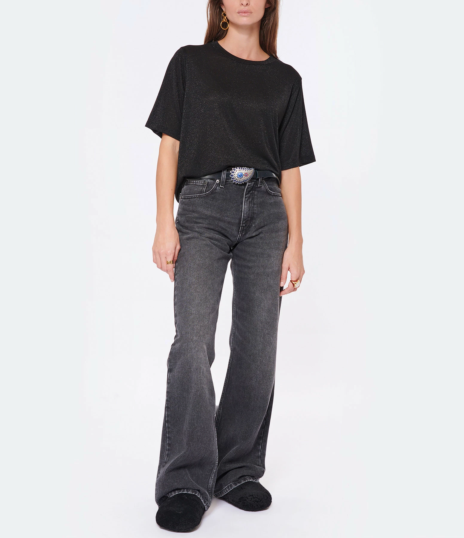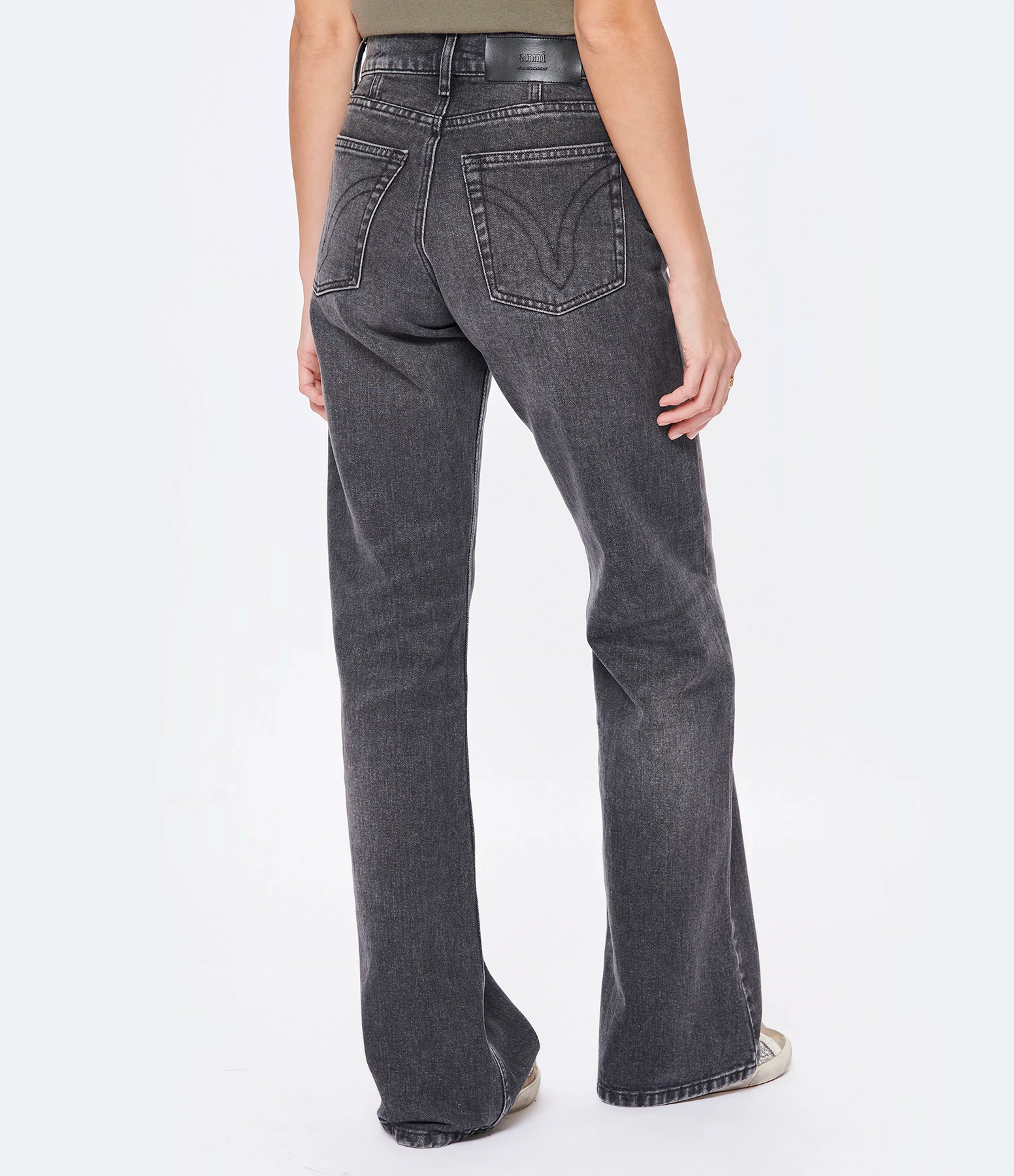 Pantalon en denim de coton noir délavé. Passants pour ceinture. Braguette zippée et boutonnée. Deux poches italiennes et une poche à gousset. Deux poches plaquées dans le dos. Jacron noir dans le dos. Coupe boyfriend. Base droite.