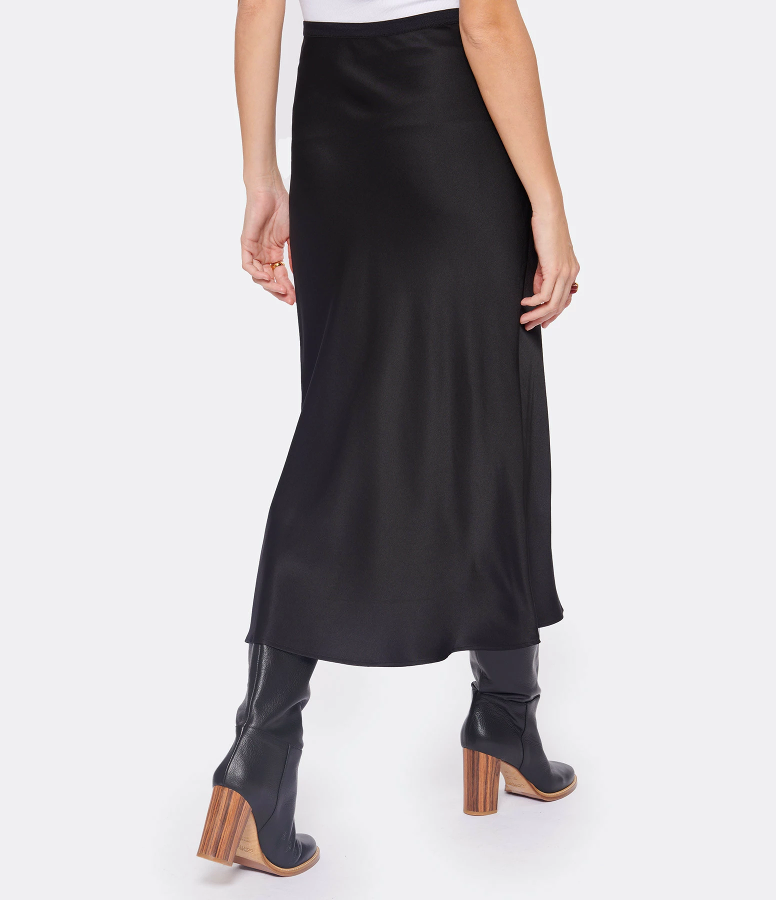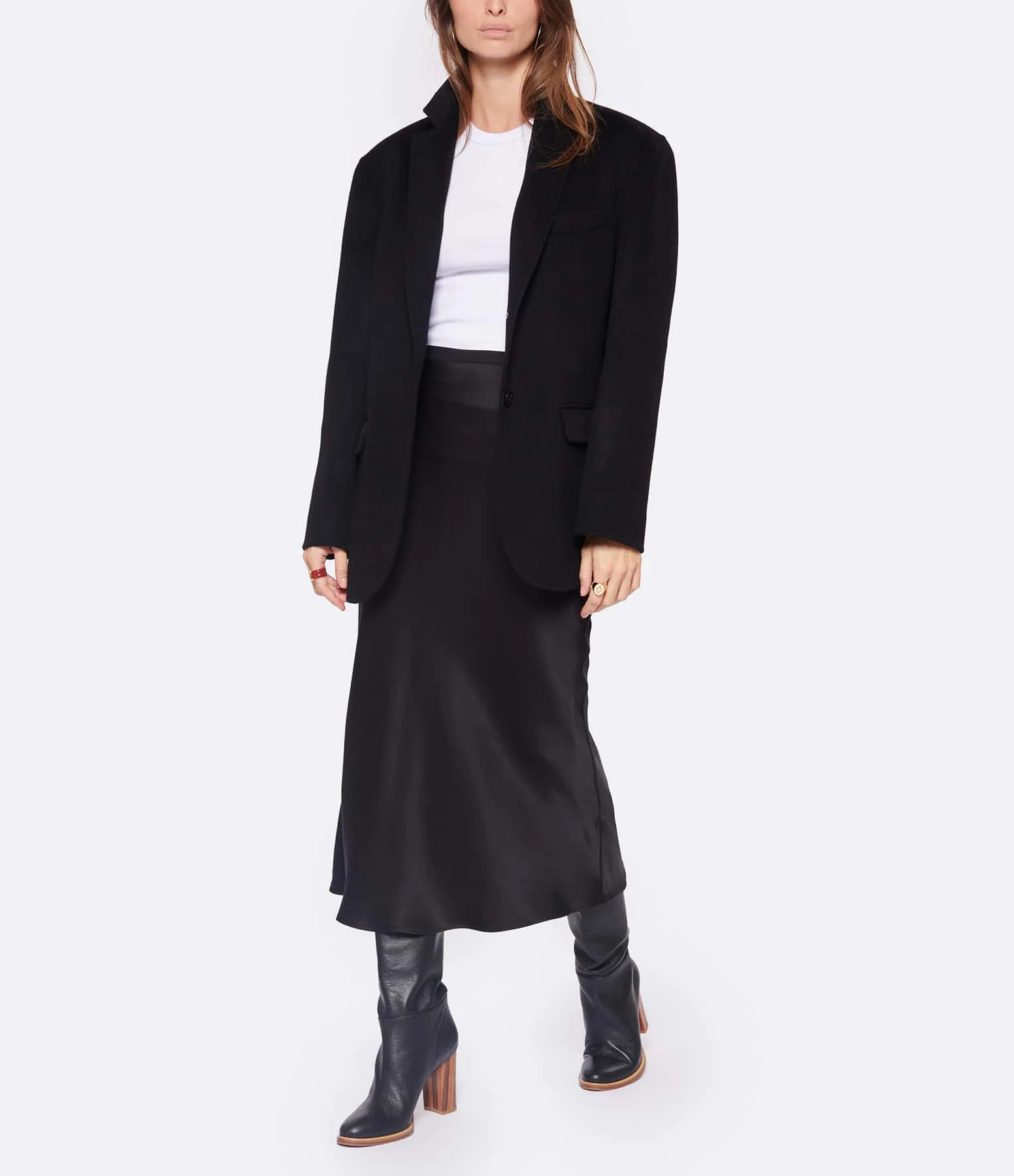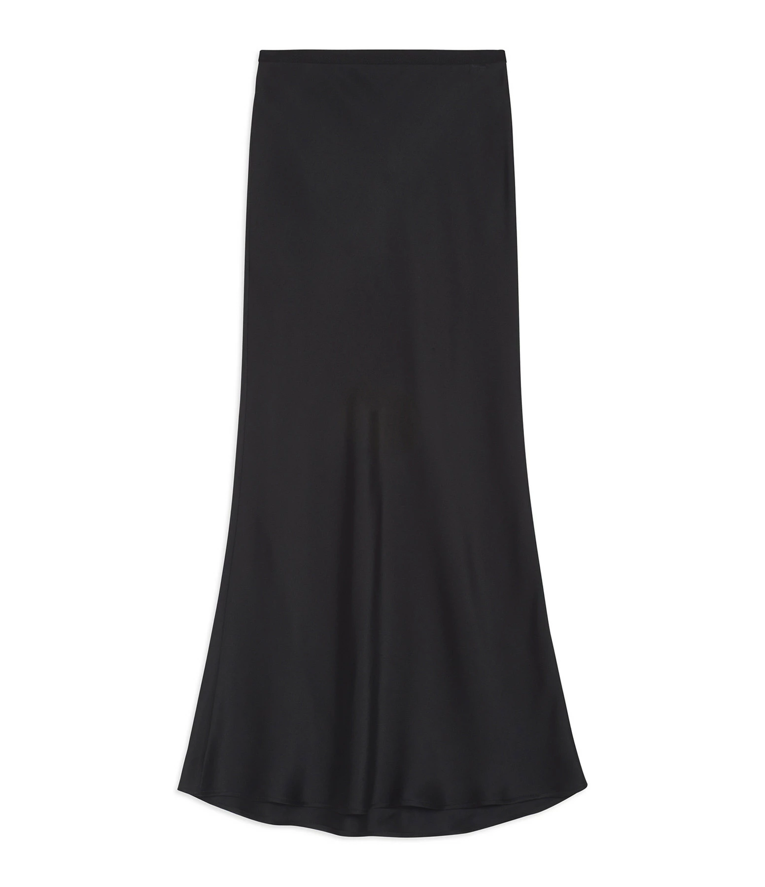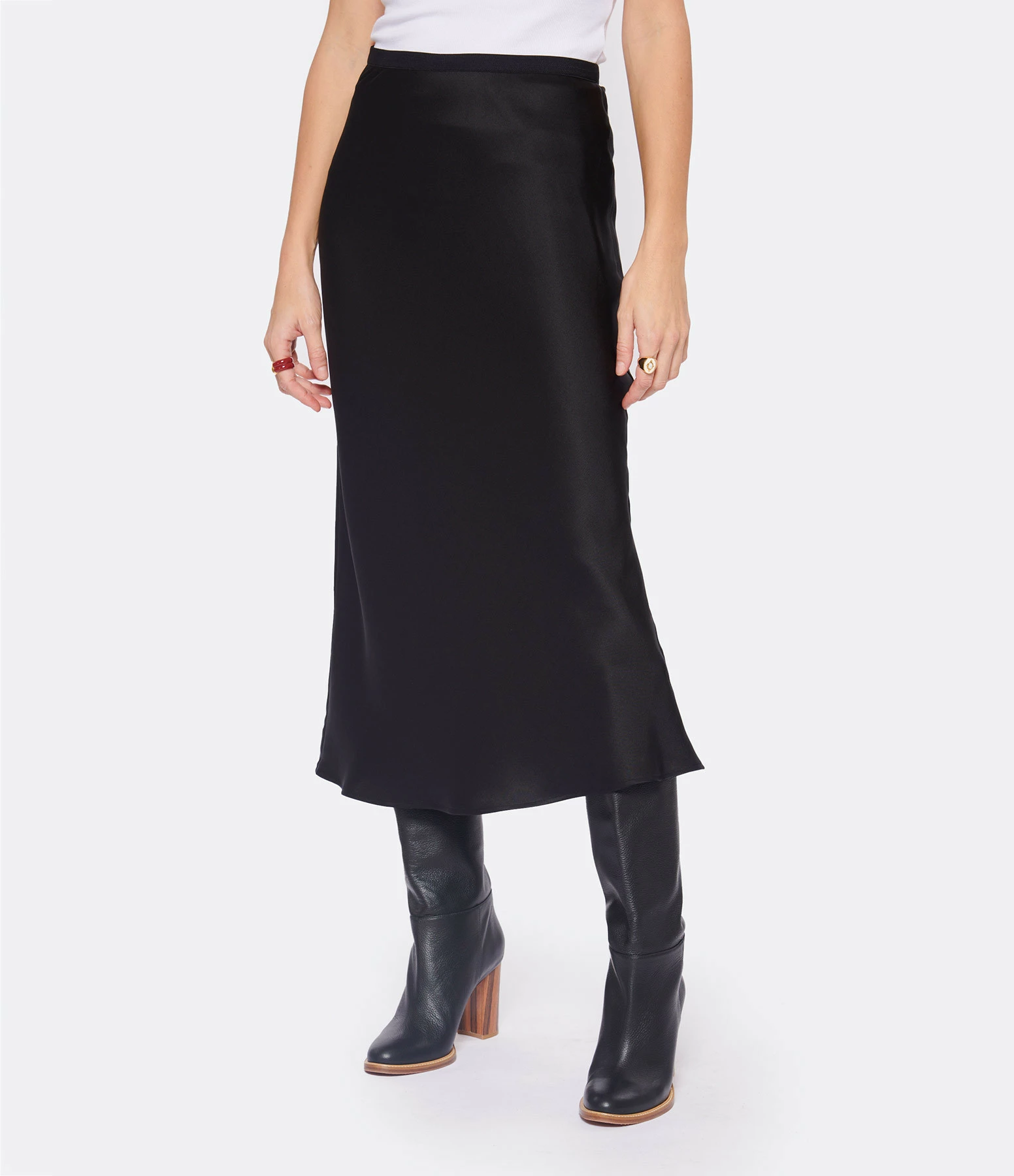 Jupe en soie noire. Taille haute élastiquée. Longueur midi.