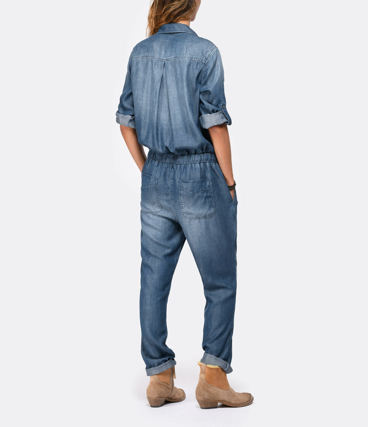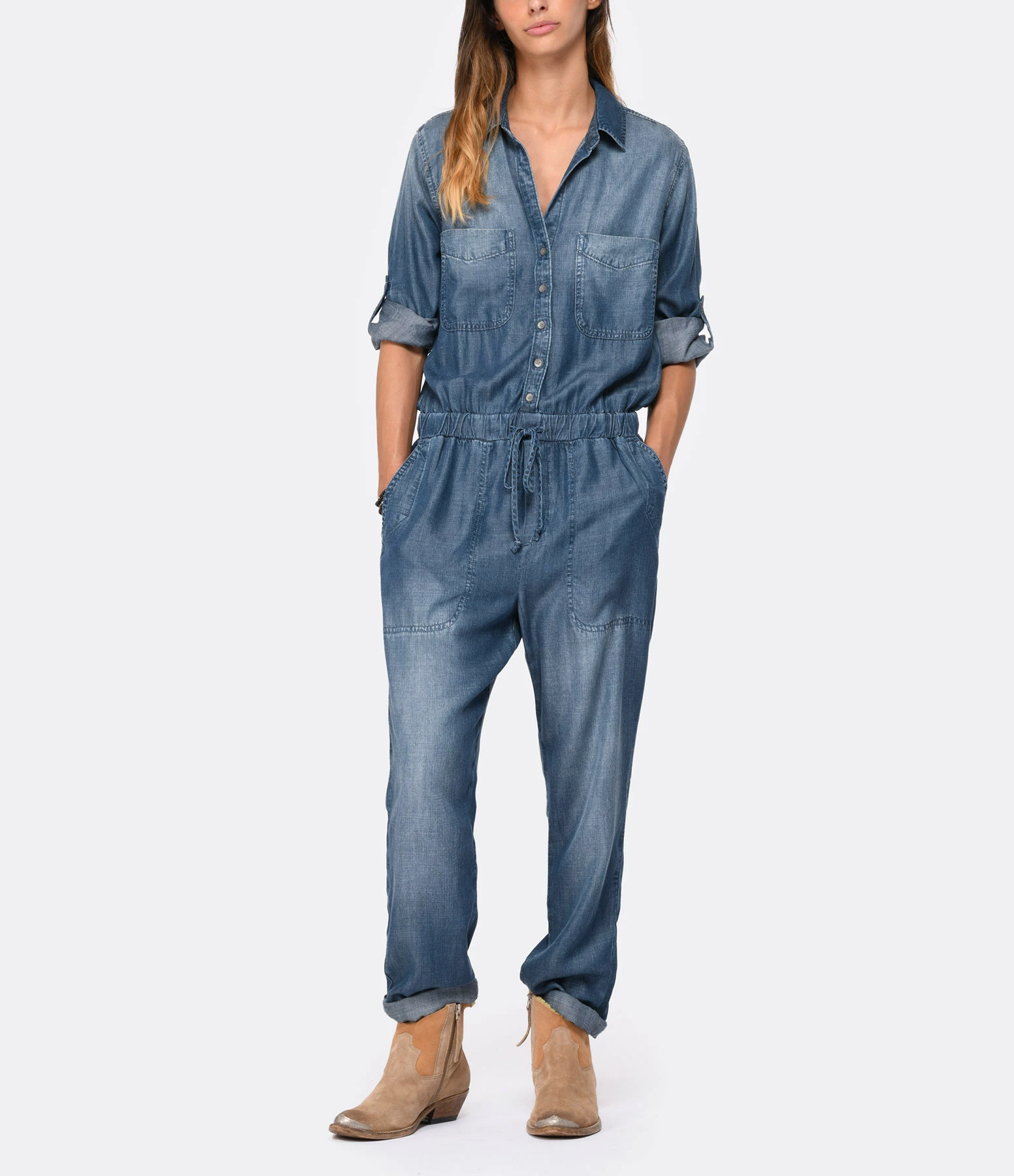 Combinaison en denim bleu foncé. Manches longues. Col chemisier. Deux poches à rabats à l’avant, deux poches fendues sur les côtés et deux poches plaquées à l’arrière. Fermeture par boutons. Taille élastiquée avec liens de serrage. Coupe droite.