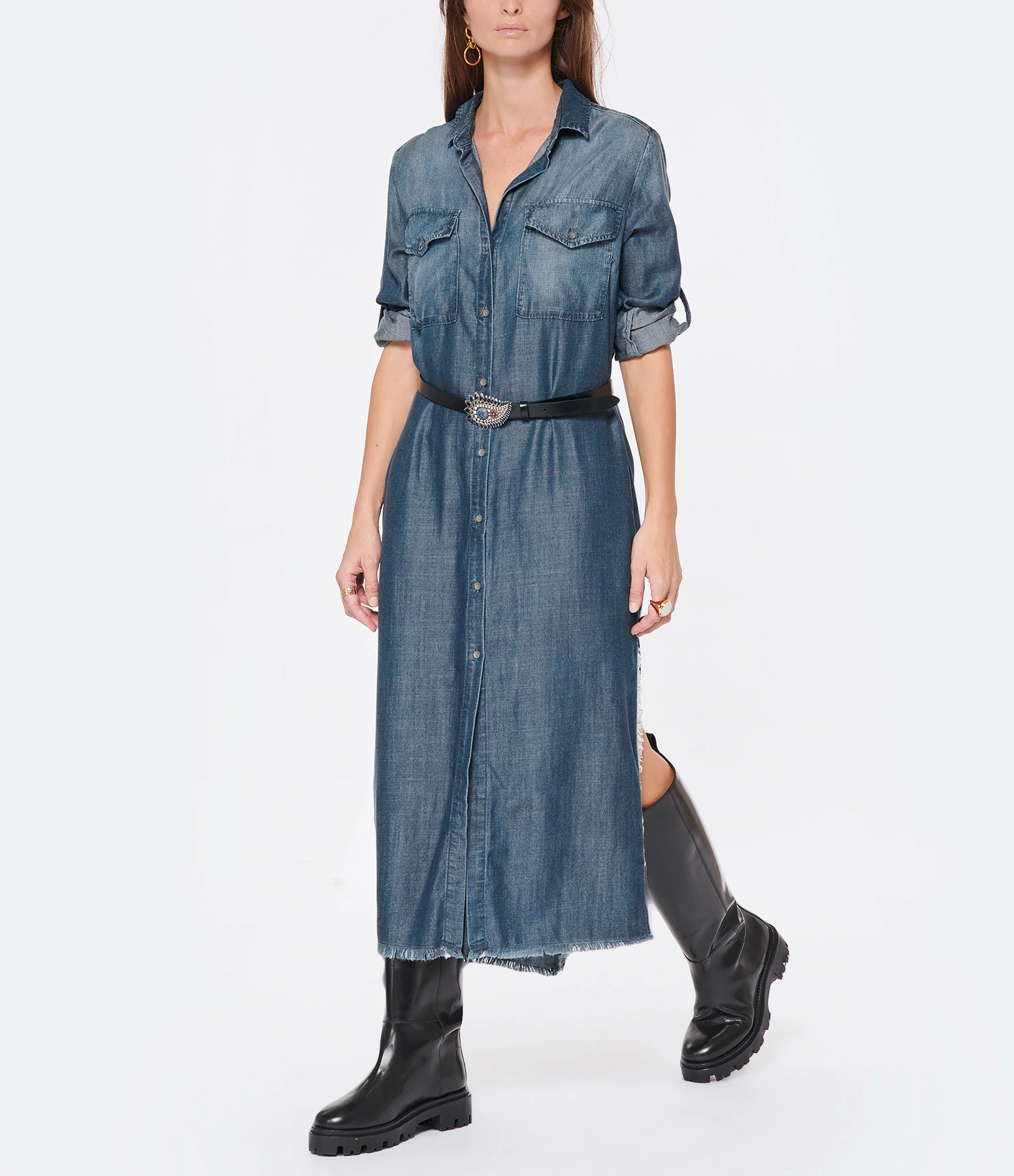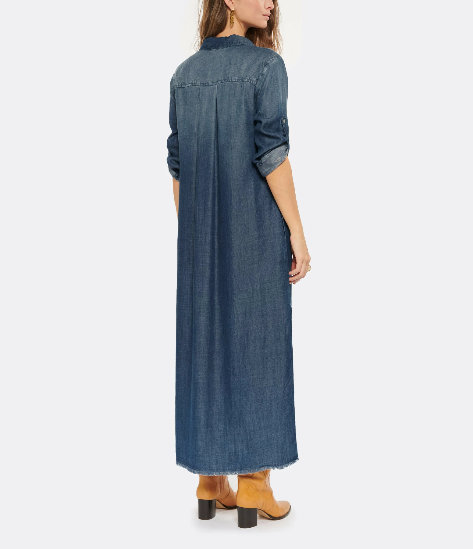 Robe longue en denim bleu foncé. Manches longues. Col chemisier. Deux poches à rabats à l’avant et deux poches fendues. Fermeture par boutons. Deux fentes de 40 cm sur les côtés. Coupe droite.