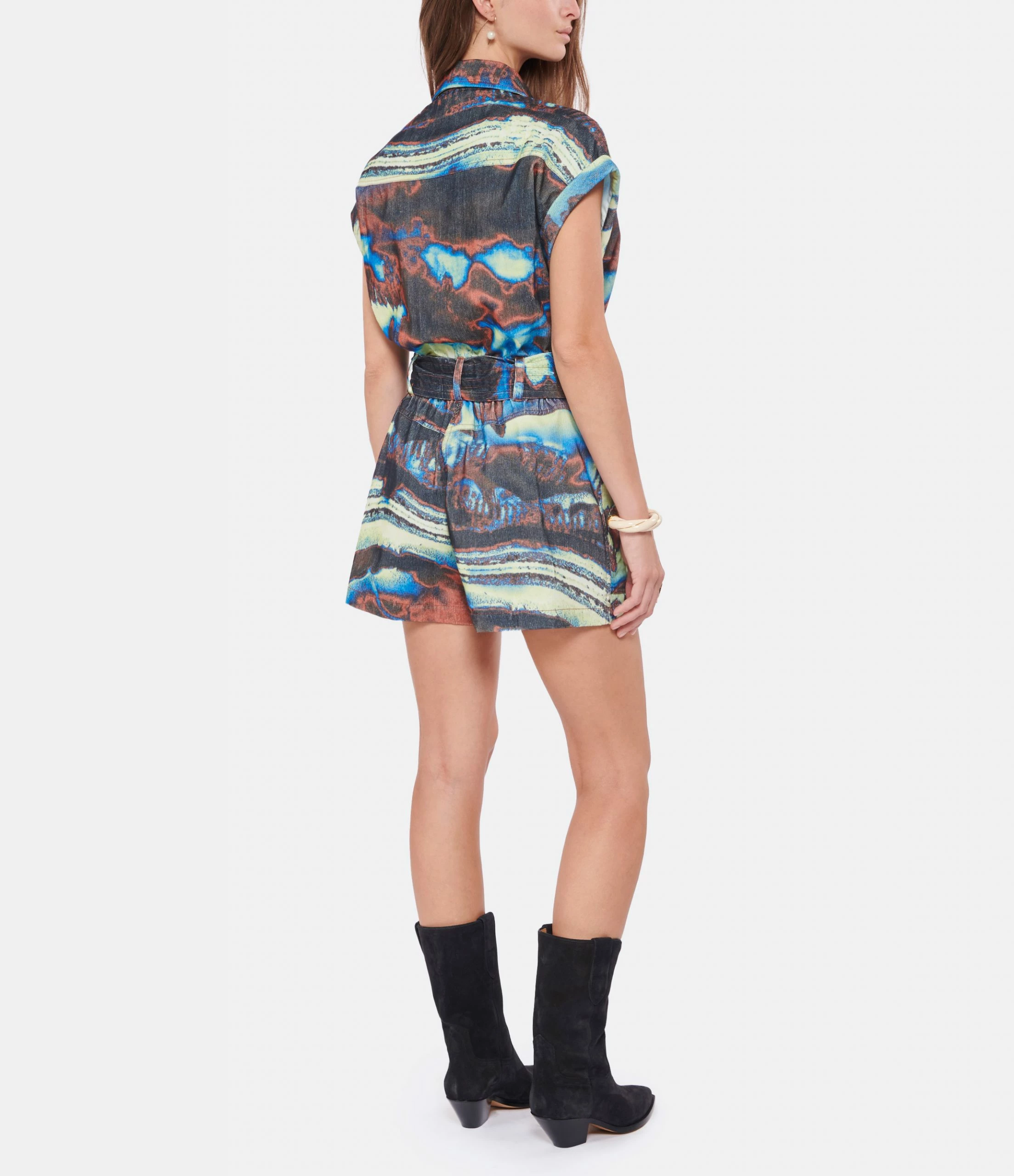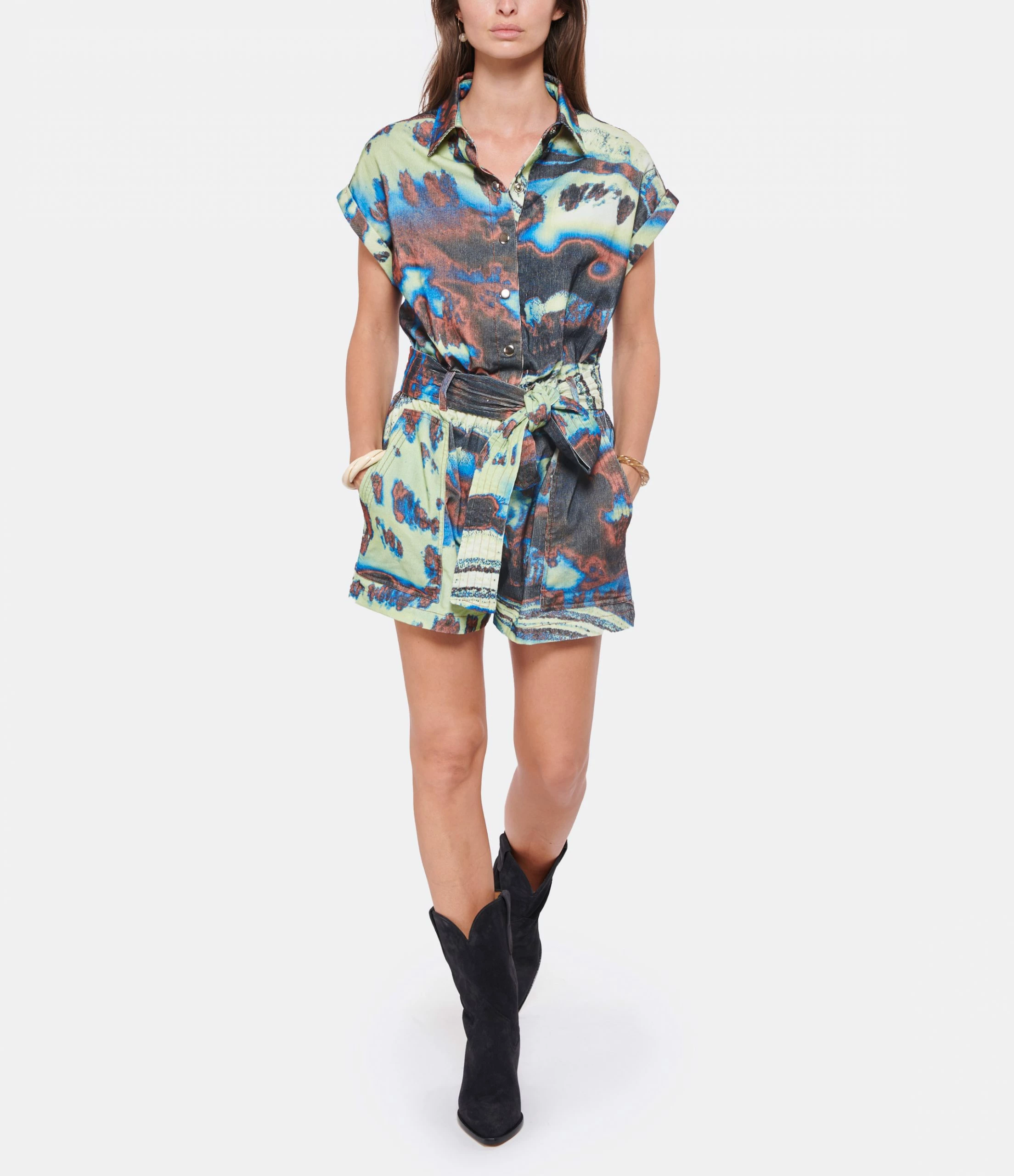 Combinaison short en velours côtelé à imprimé multicolore. Col chemise. Manches courtes. Fermeture par boutons pressions. Deux poches à l’avant. Coupe droite. Taille élastiquée et ceinture amovible à nouer.