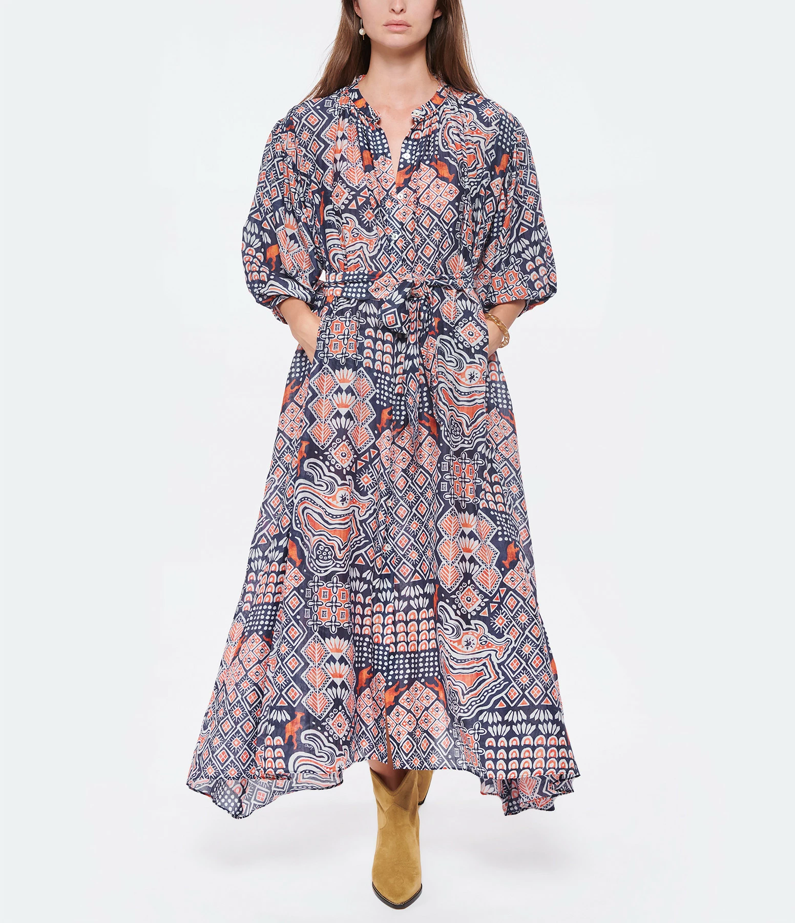 Robe chemise longue en coton imprimé bleu blanc et orange. Col Mao. Manches 3/4 resserrées aux poignets. Fermeture par boutons. Ceinture amovible à nouer avec passants.