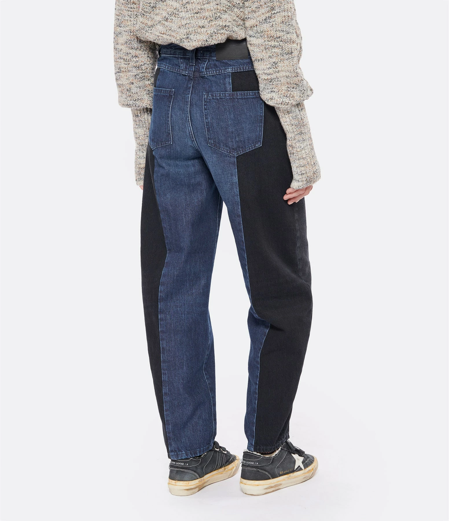 Jean en denim de coton bicolore : bleu et bleu foncé. Taille haute avec passants pour ceinture. Braguette zippée et boutonnée. Deux poches italiennes et une poche à gousset. Deux poches plaquées dans le dos. Jacron noir dans le dos. Coupe loose. Base droite.