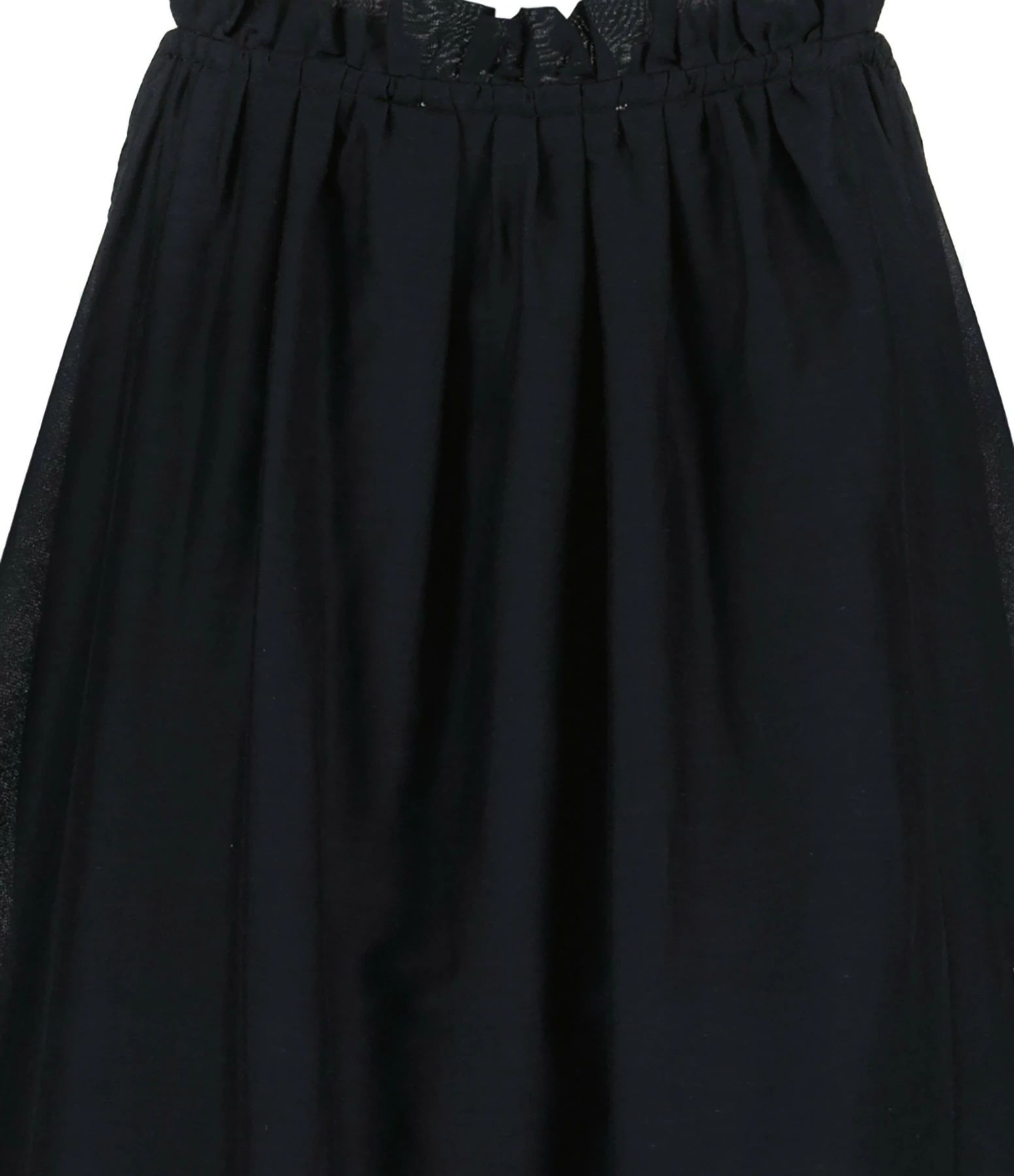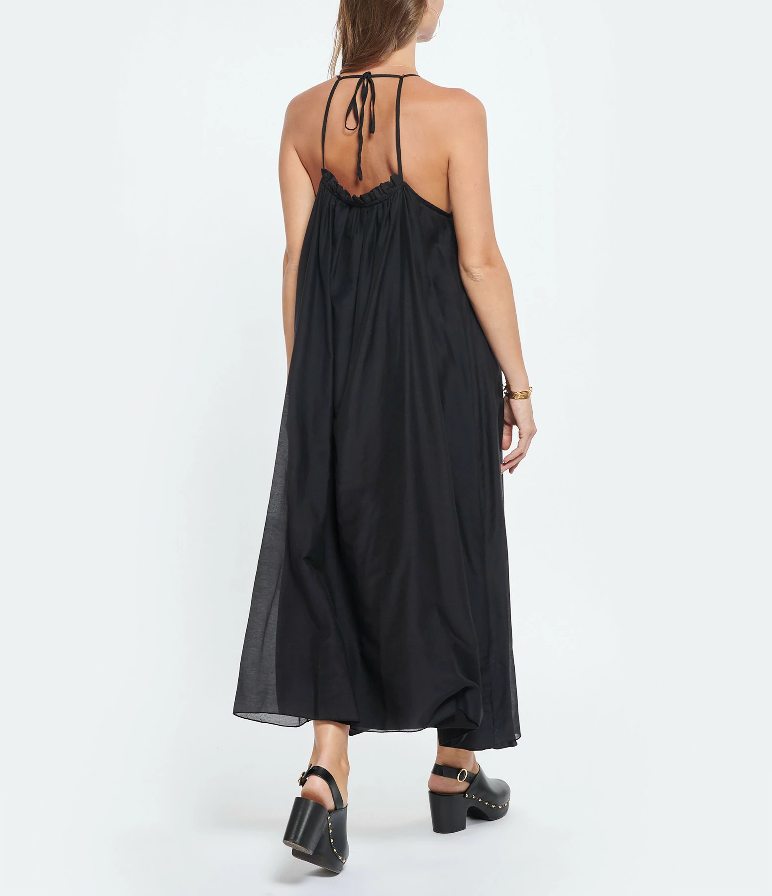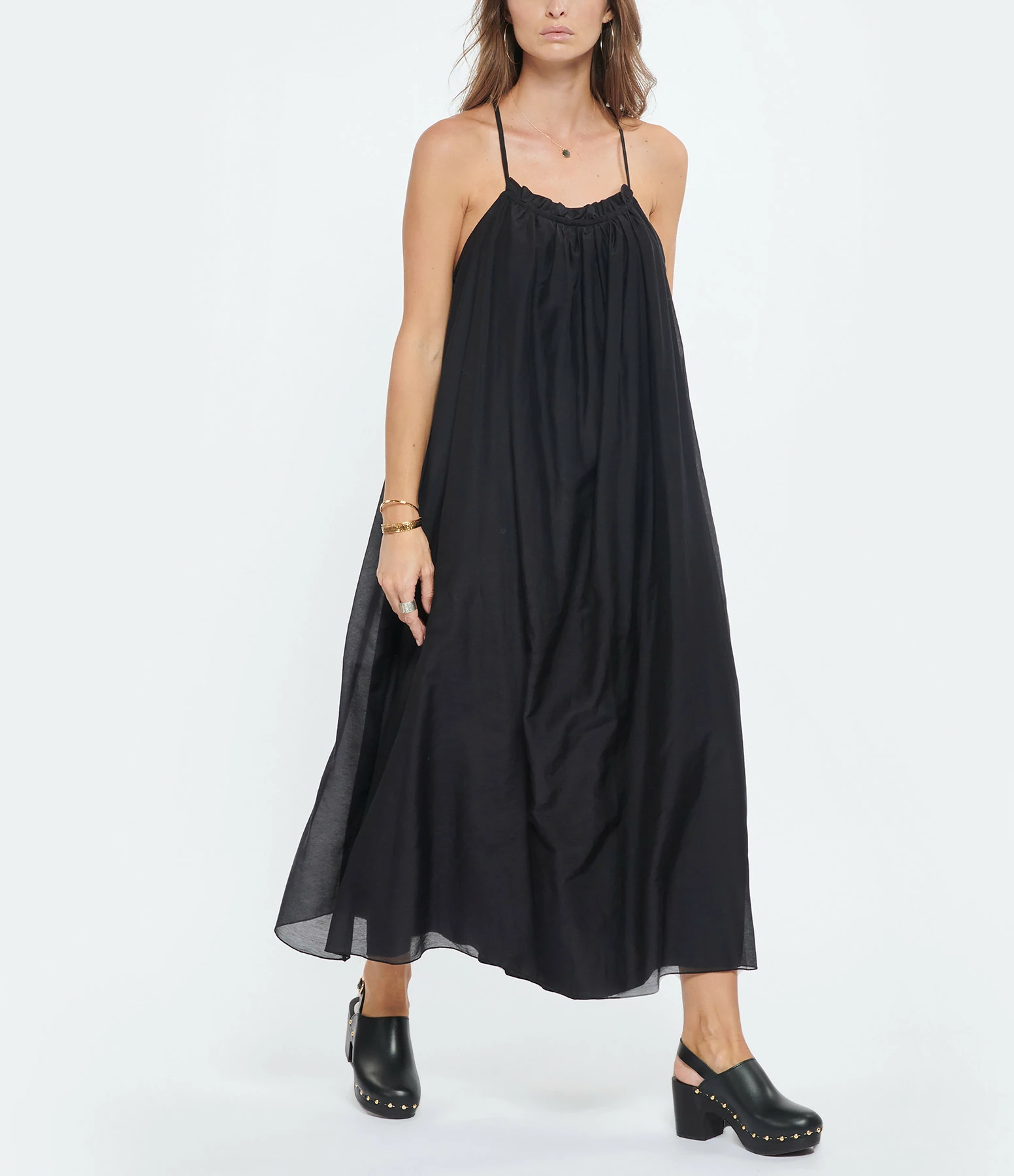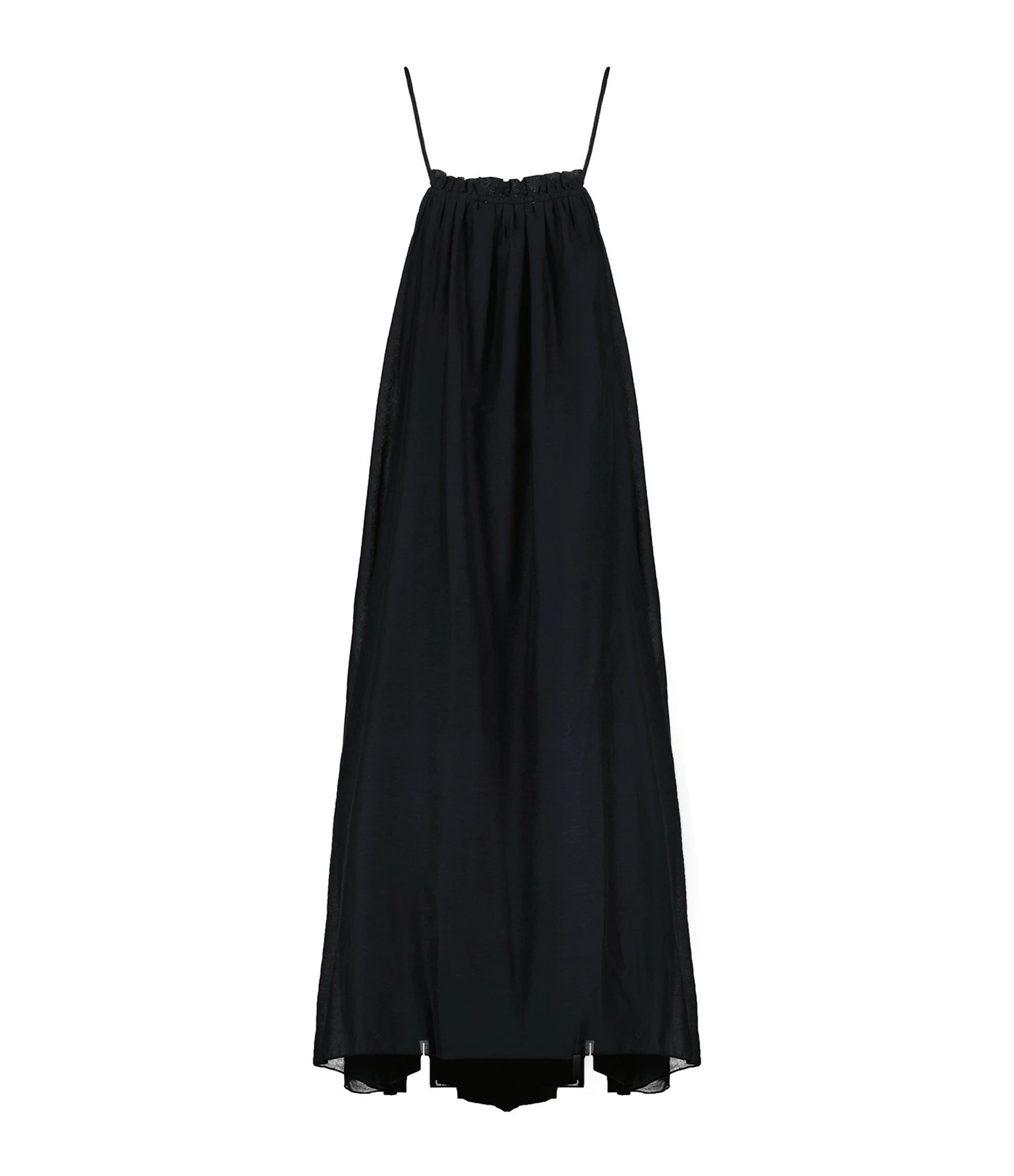Robe longue en coton et soie noire. Encolure arrondie froncée. Dos échancré et froncé. Sans manches. Fines bretelles liens tombants. Coupe droite ample. Base droite. Doublée.