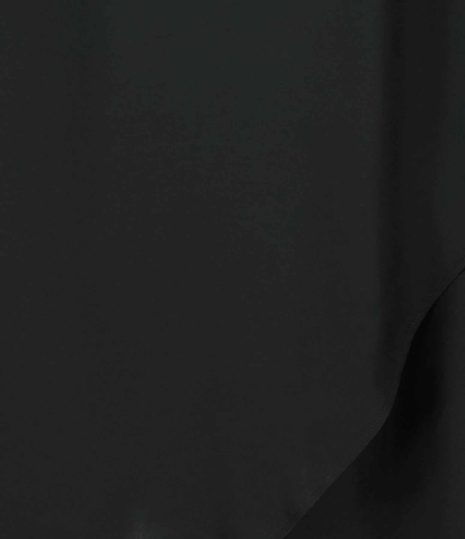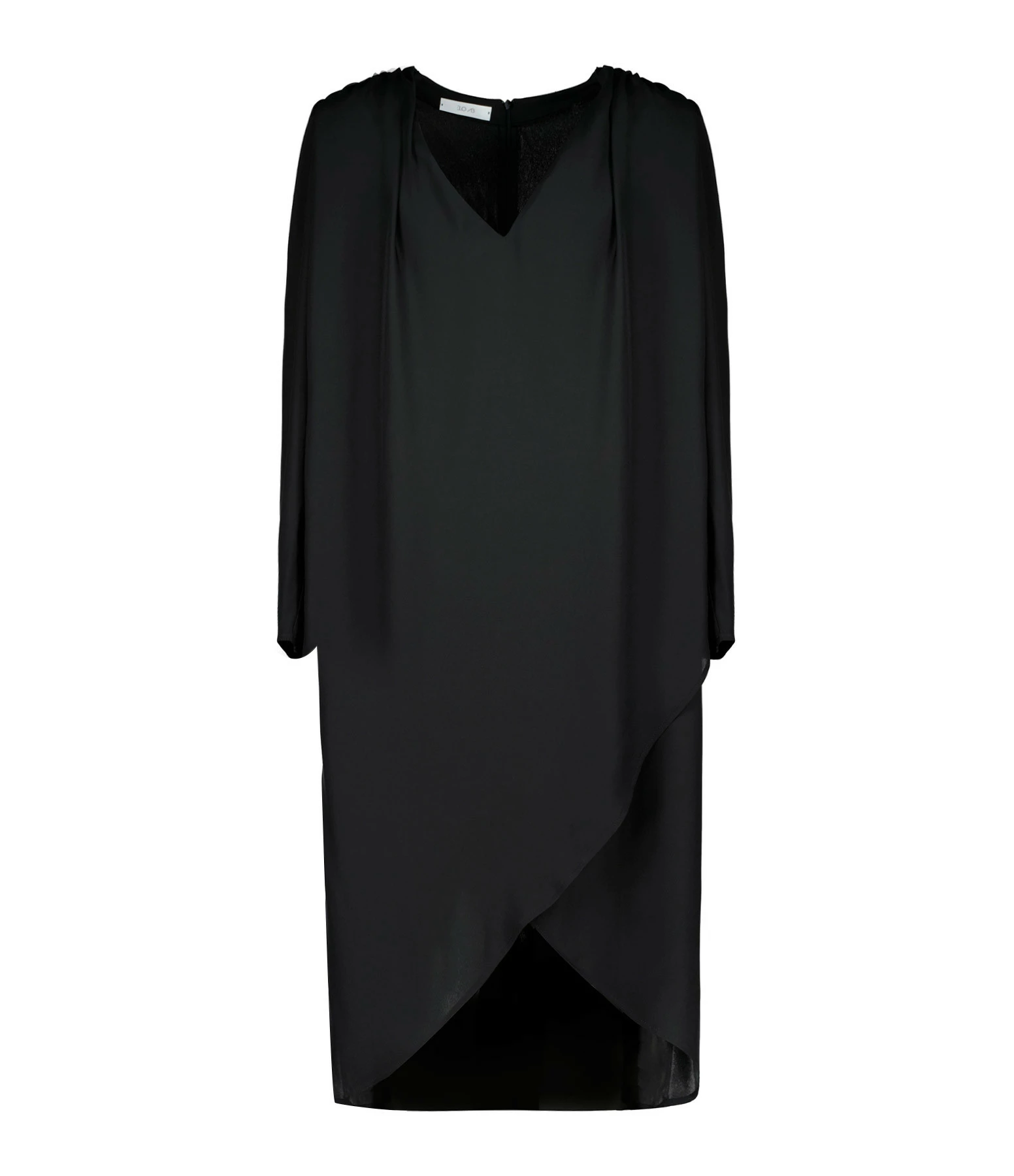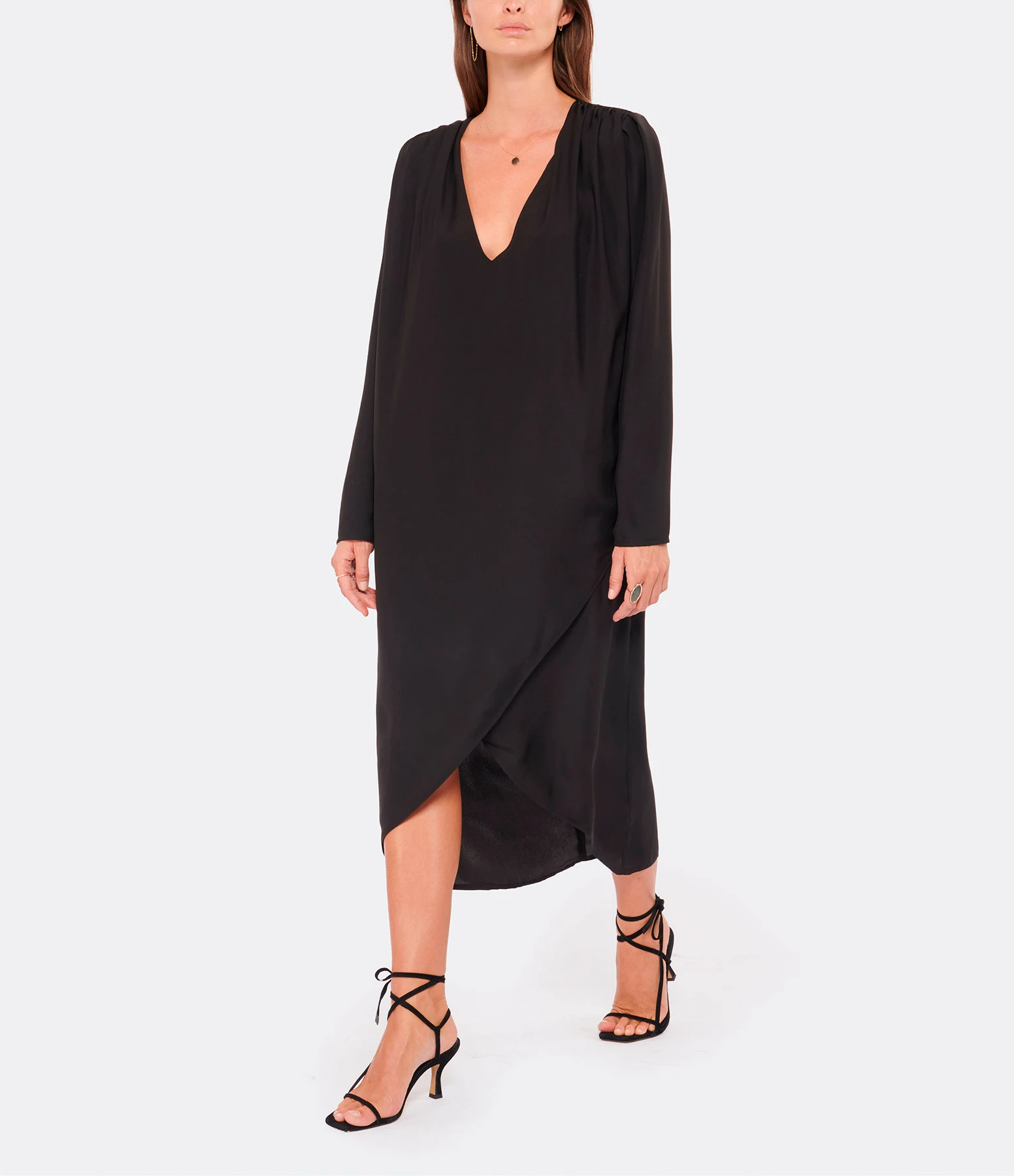 Robe midi drapée noire. Col en V. Épaules froncées avec épaulettes. Manches longues. Fermeture zippée invisible dans le dos. Coupe ample. Base asymétrique.