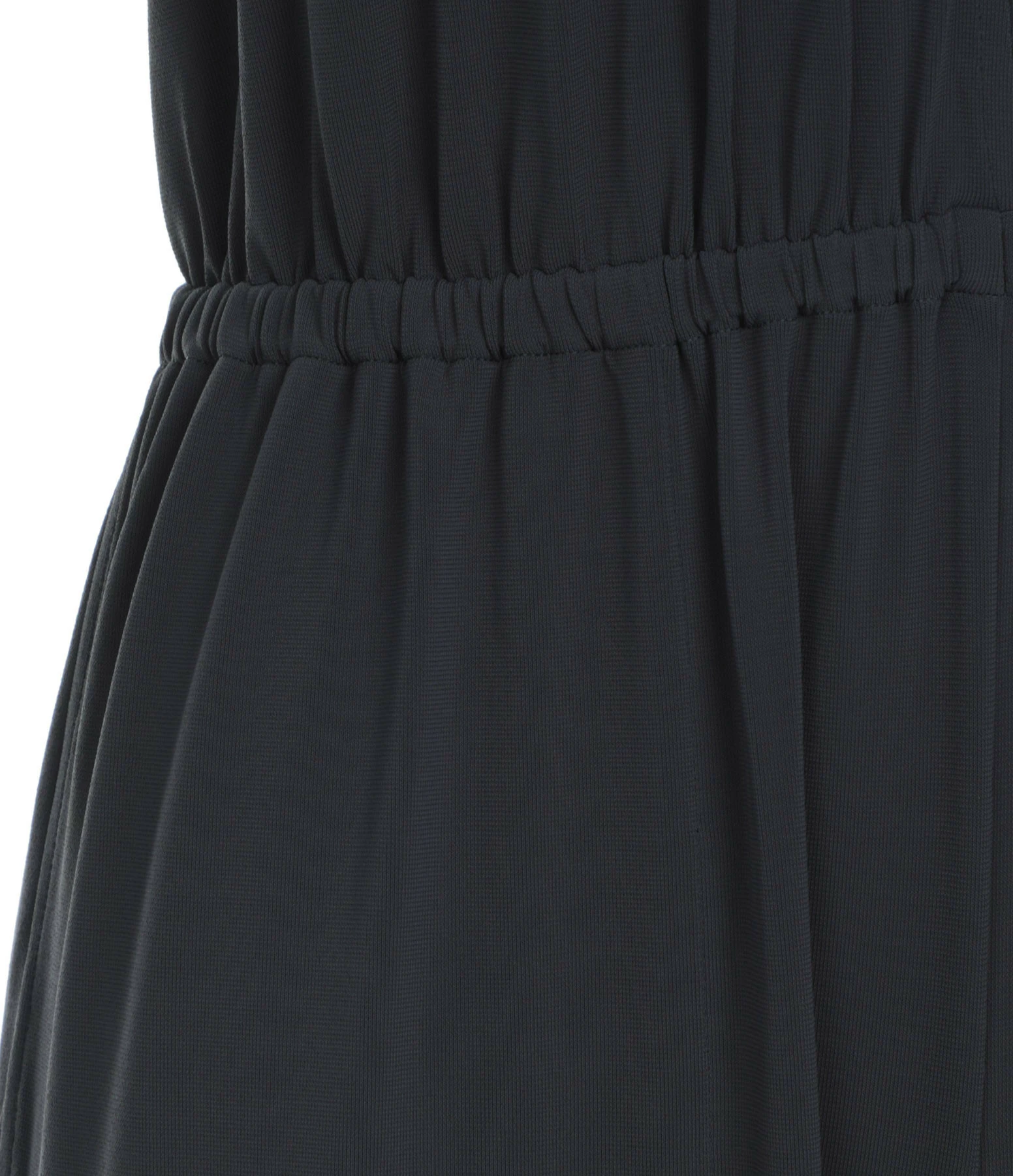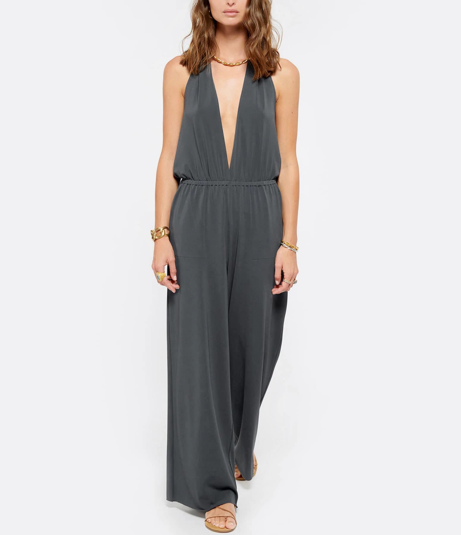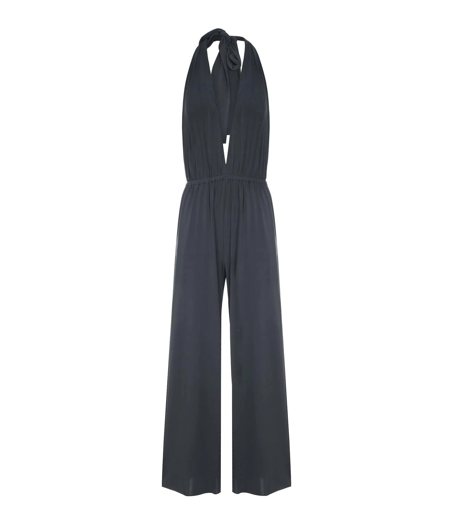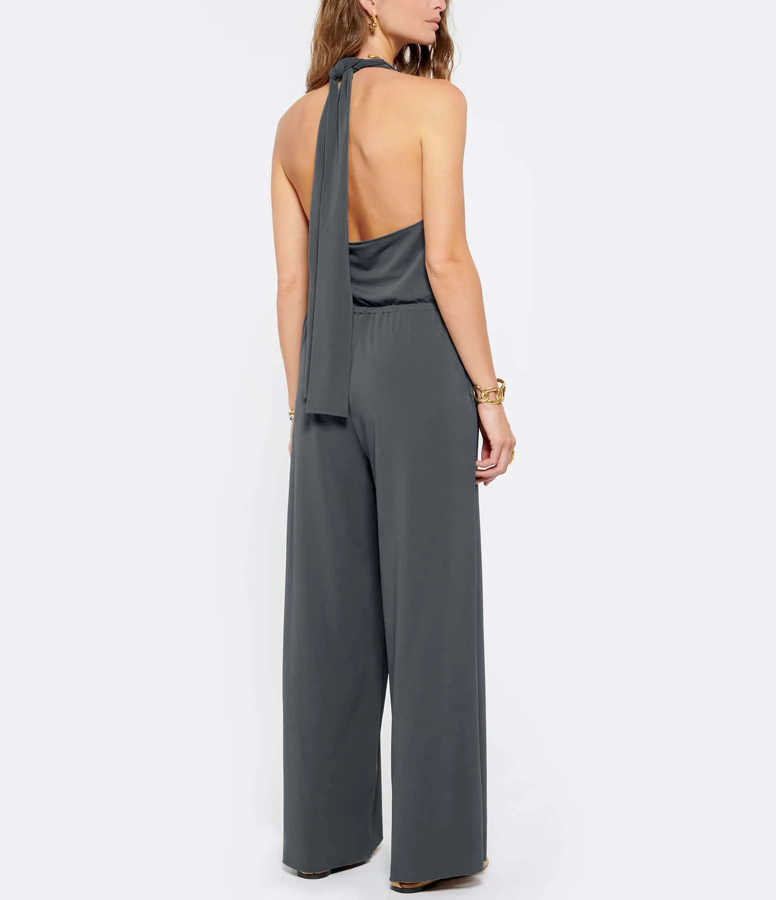 Combinaison pantalon grise. Décolleté profond en V. Dos nu. Liens à nouer autour du cou. Taille élastiquée. Deux poche fendues. Coupe droite. Base droite à bord franc. Non doublée.