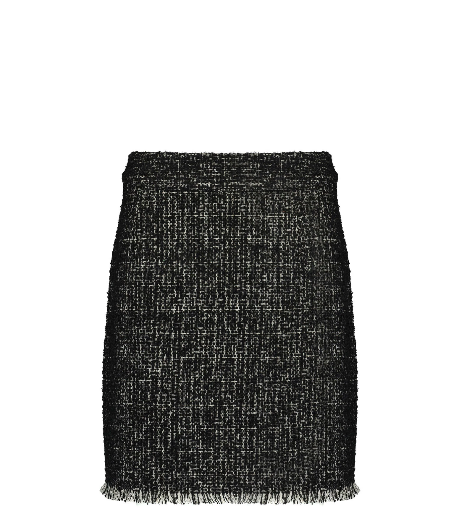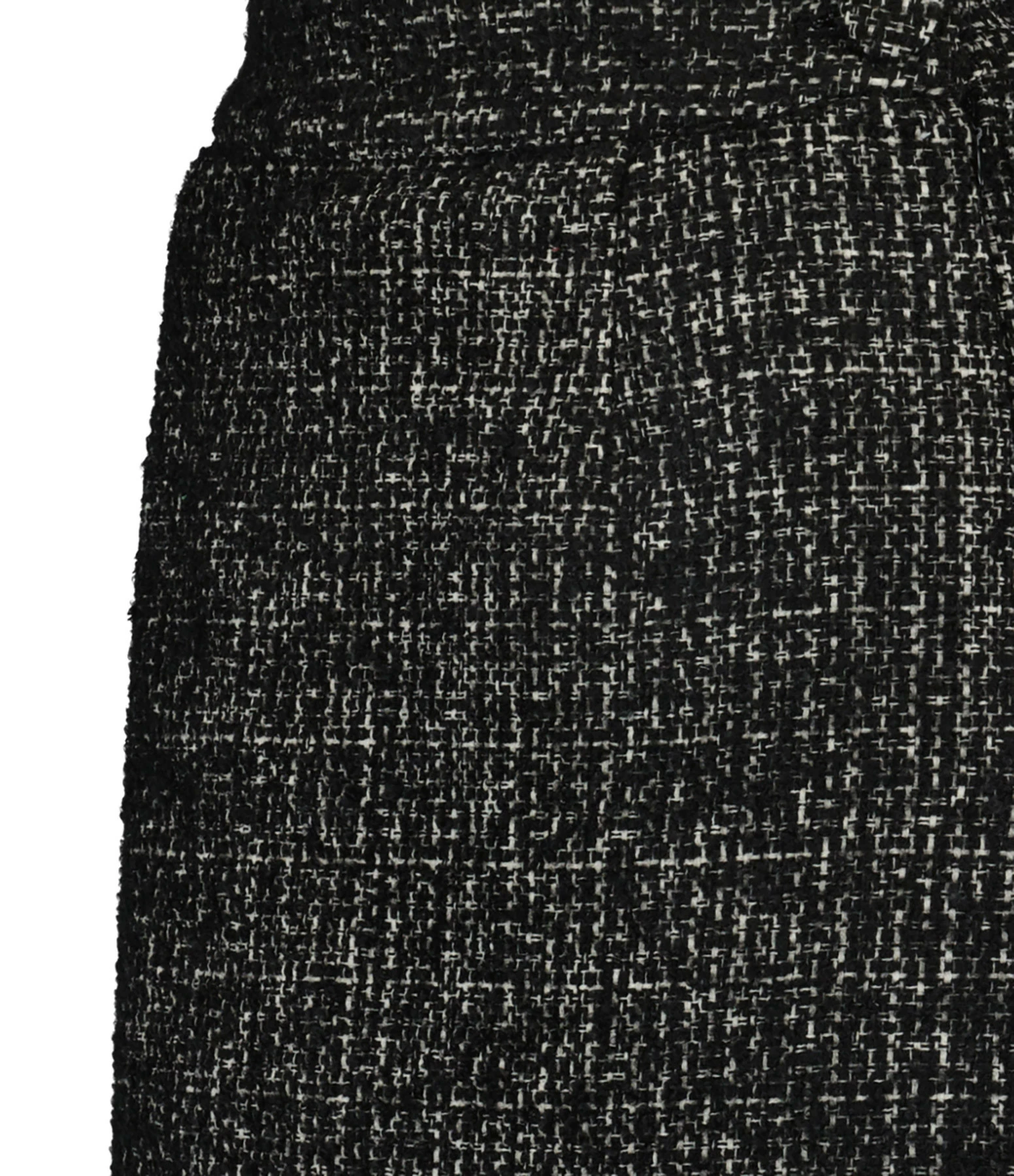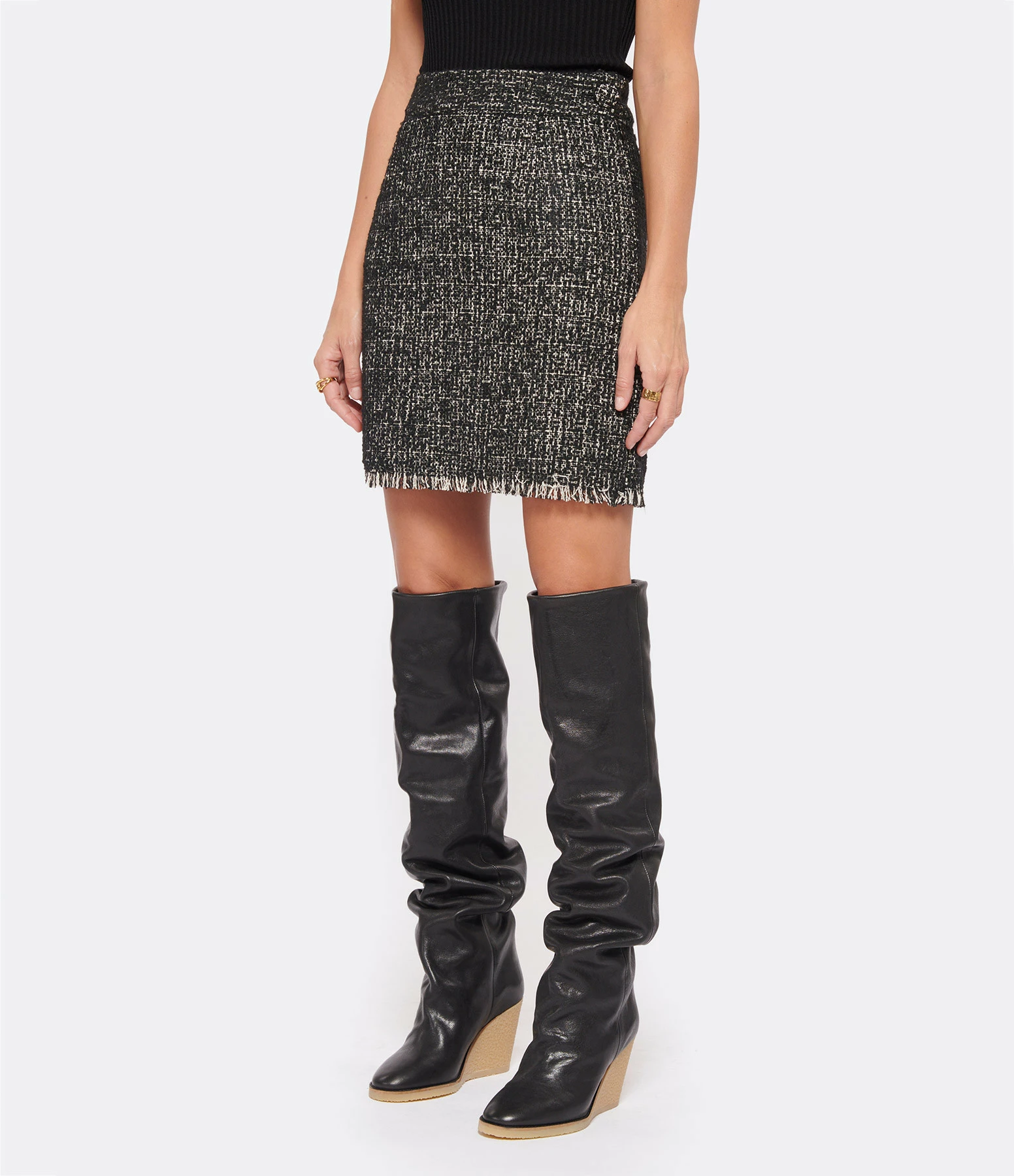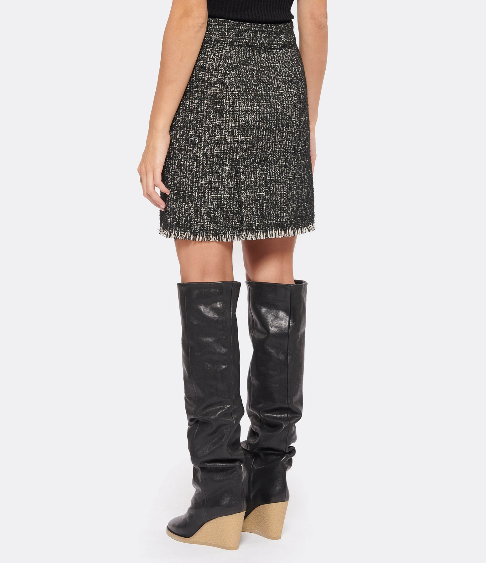 Jupe courte en tweed texturé noir. Fermeture zippée et boutonnée sur le côté. Bouton recouvert du même tissu. Fente dans le dos. Coupe près du corps. Base effilochée. Doublée.