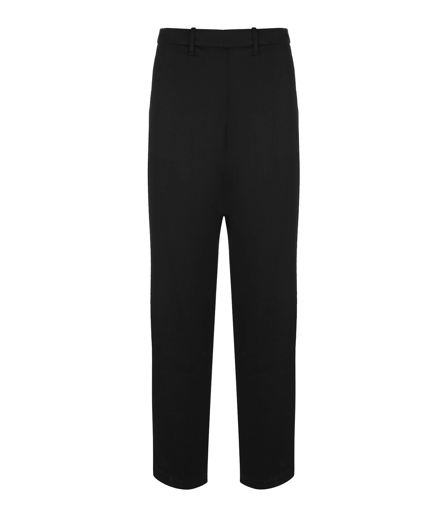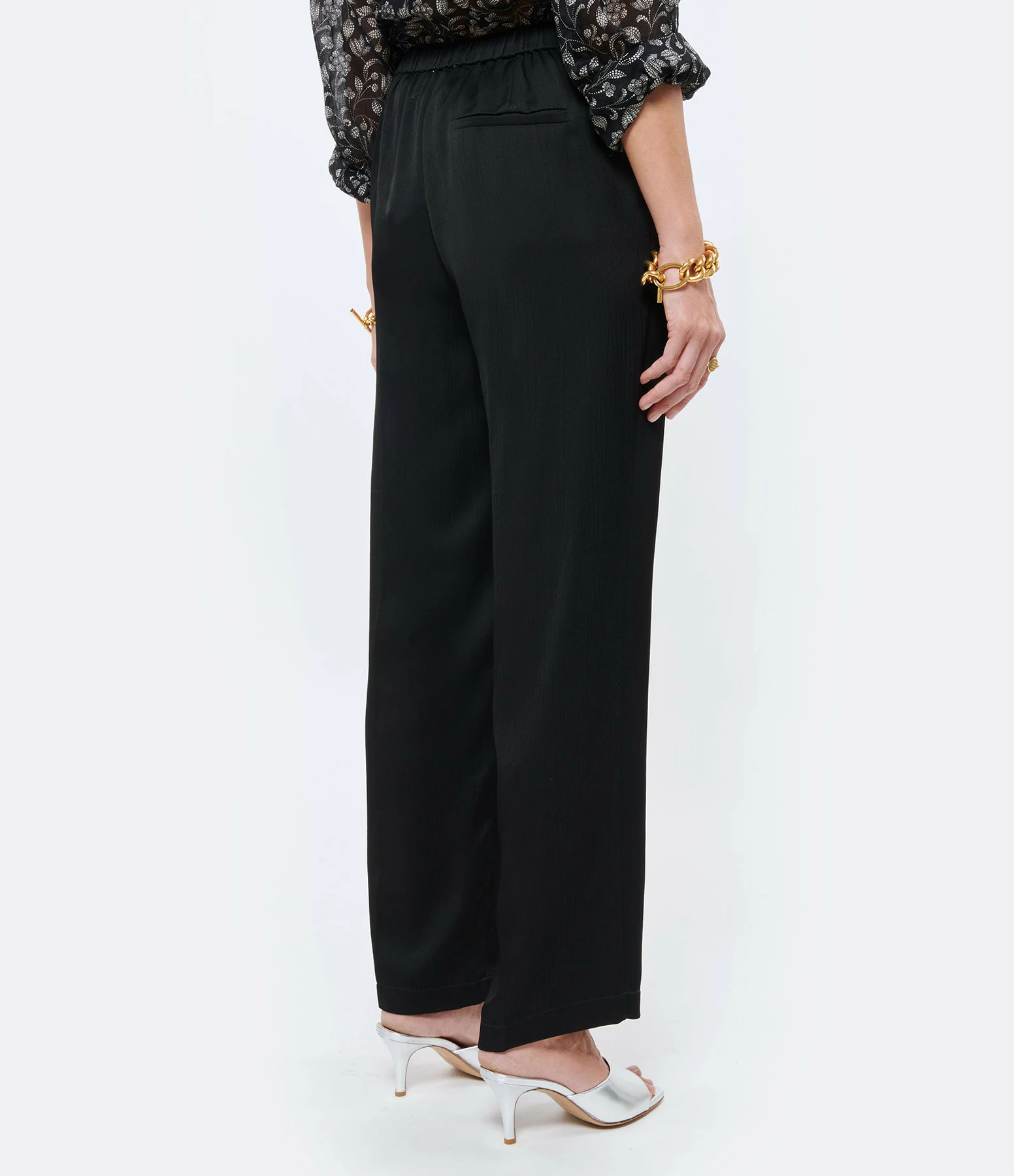 Pantalon fluide en crêpe noir. Coupe droite. Taille élastiquée. Passants pour ceinture. Deux poches italiennes et une poche passepoilée à l’arrière.