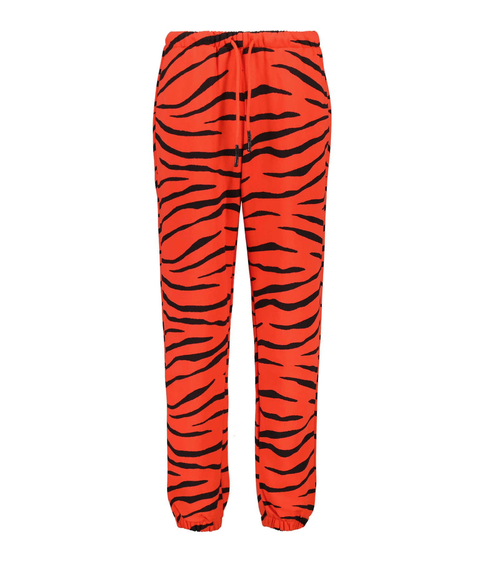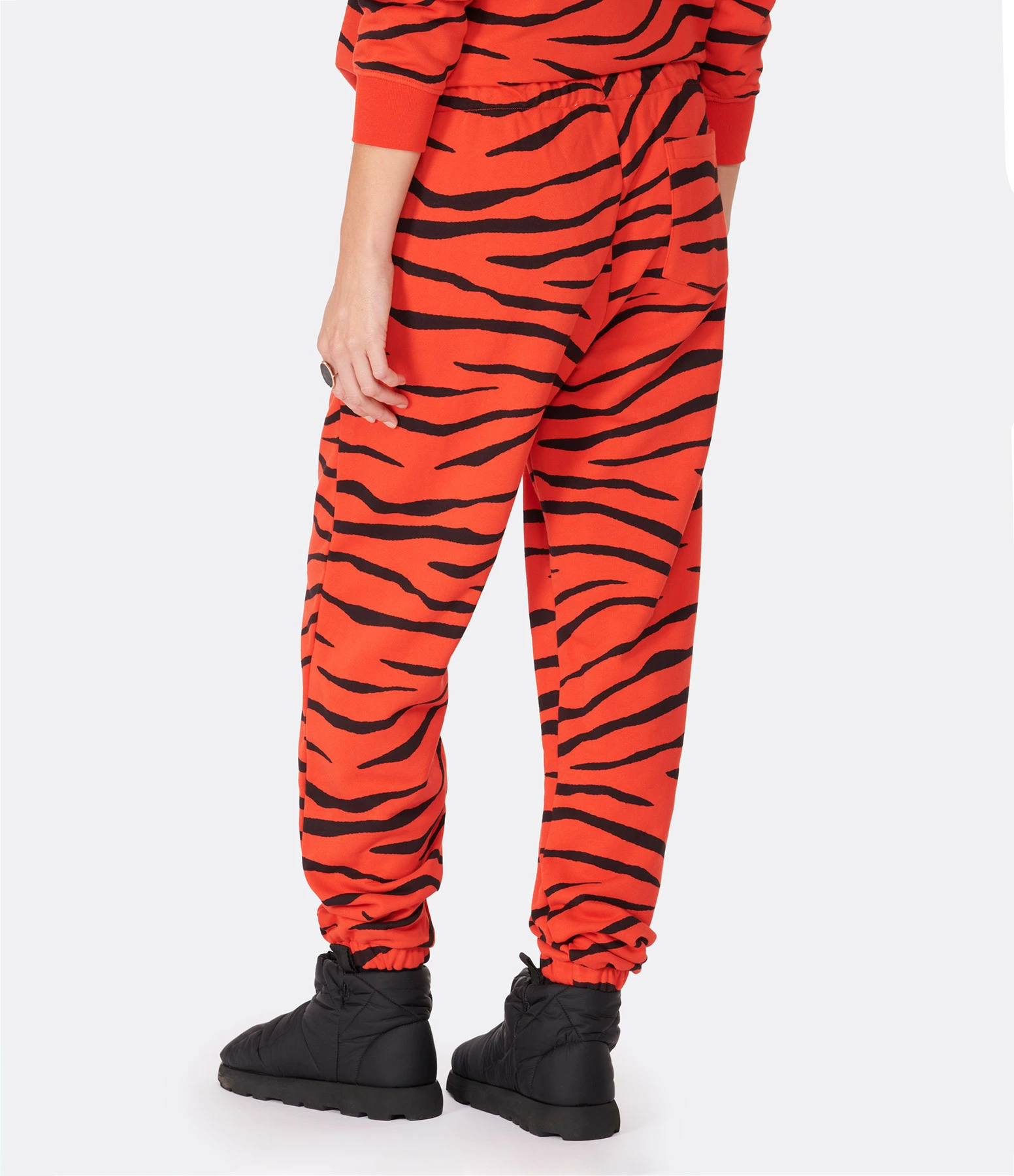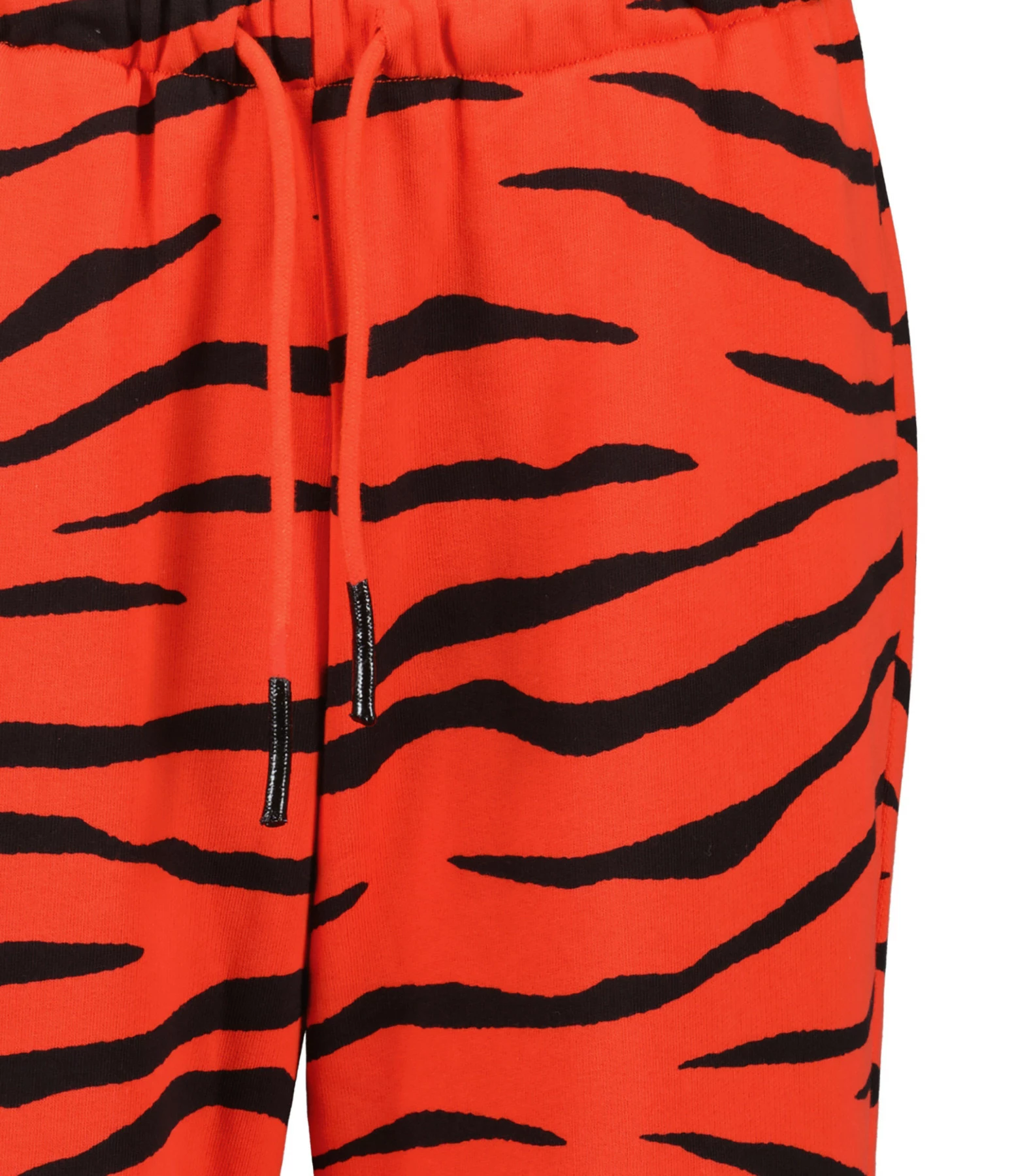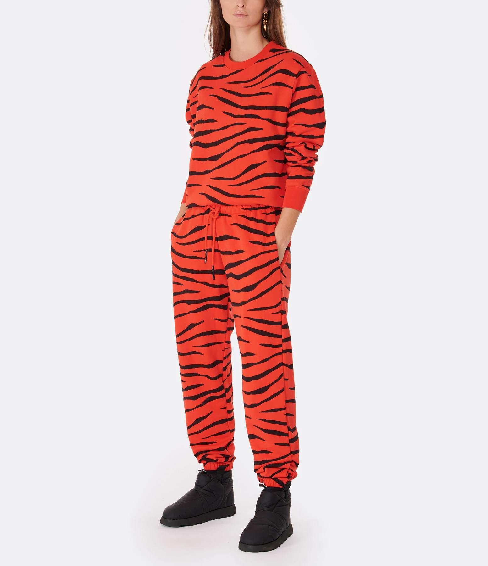 Jogging en coton à imprimé tigré rouge et noir. Taille élastiquée avec liens de serrage. Deux poches fendues et une poche plaquée à l’arrière. Chevilles resserrées par un élastique. Coupe loose.