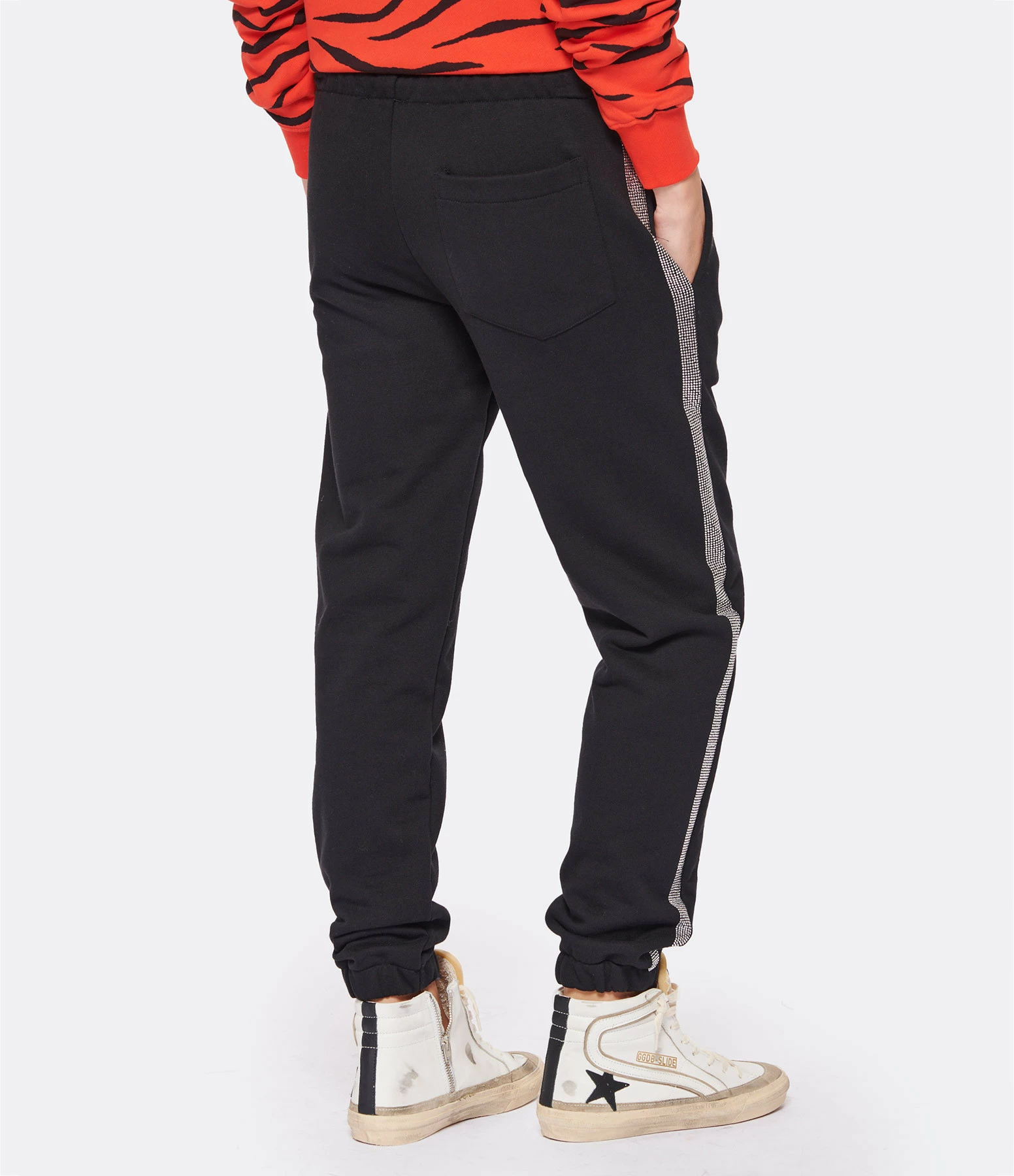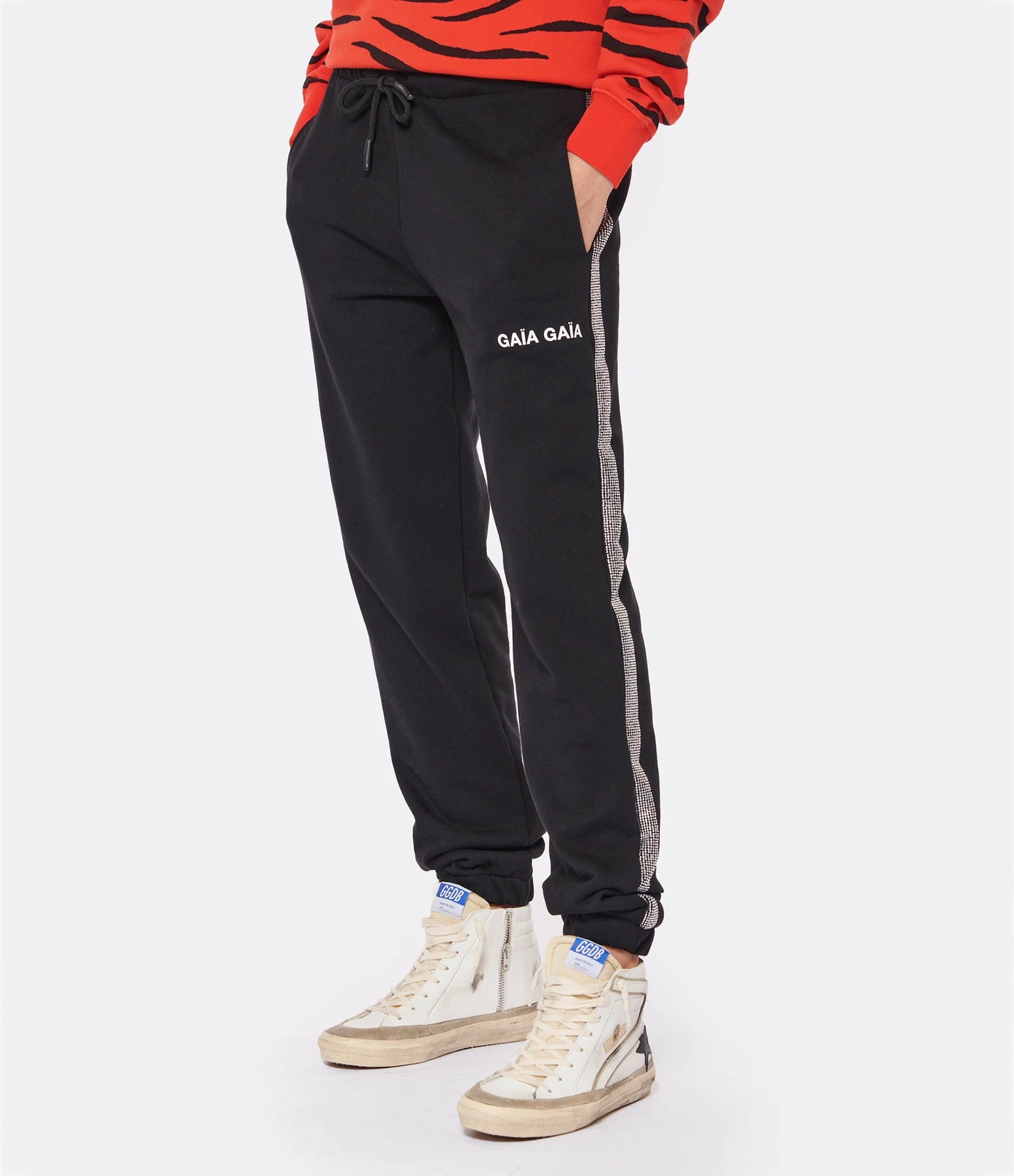 Jogging en coton noir avec bandes de strass sur les cotés. Taille élastiquée avec liens de serrage. Logo blanc “GAIA GAIA” floqué sur la jambe gauche. Deux poches fendues et une poche plaquée à l’arrière. Chevilles élastiquées. Coupe droite.