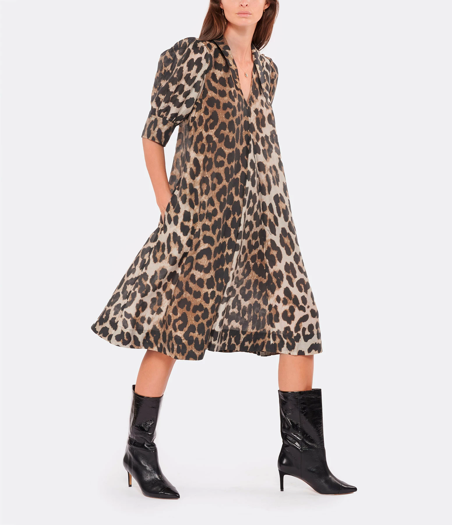 Robe midi imprimée léopard. Col plat pointu. Encolure en V. Manches courtes ballon à revers boutonnés. Boutons noirs gravés du logo. Deux poches latérales sur le devant. Coupe poitrine ajustée. Coupe jupe évasée. Base droite. Non doublée.