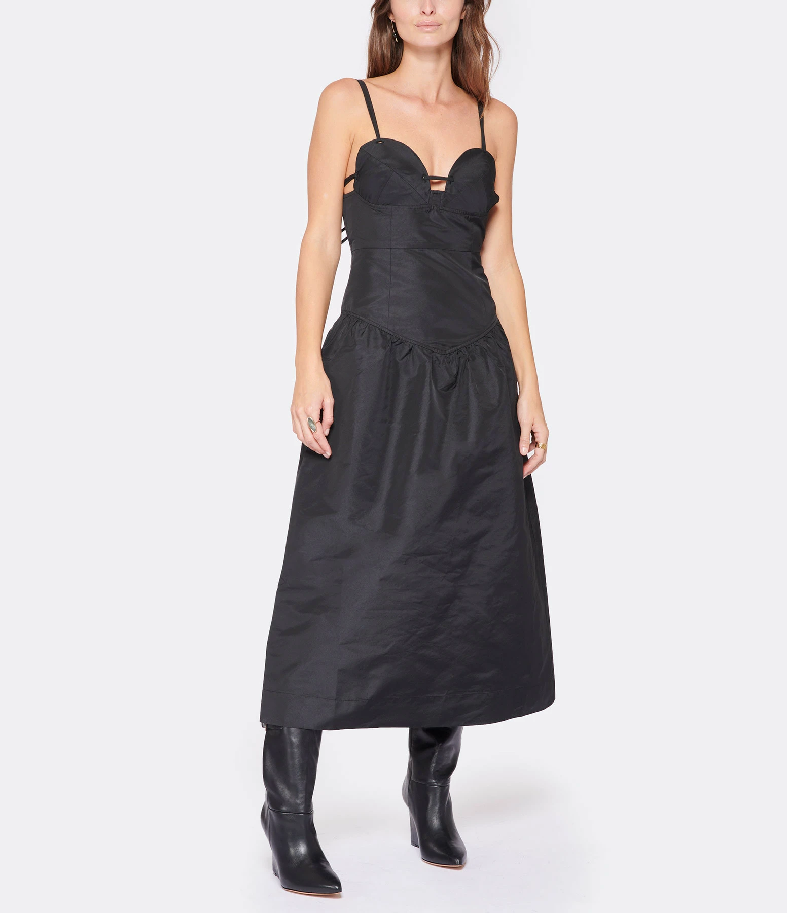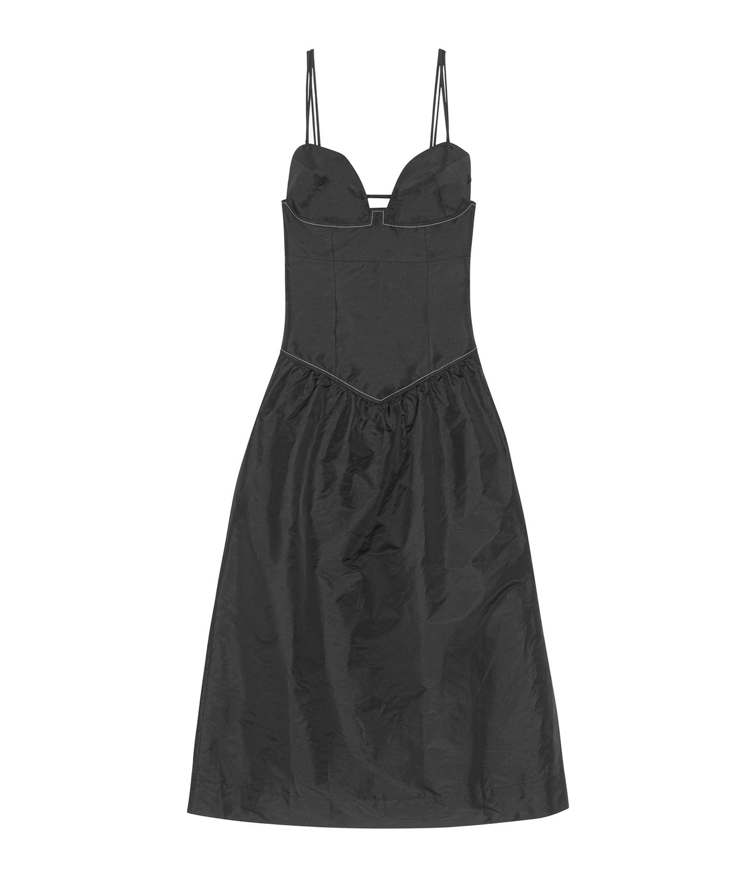 Robe midi en taffetas noir. Encolure bustier. Sans manches. Fines bretelles doubles. Dos échancré carré avec bretelles de serrage avec boucle métallique argenté en forme de losange. Fermeture zippée invisible latérale. Taille froncée. Coupe buste près du corps. Coupe jupe évasée. Base droite. Non doublée.