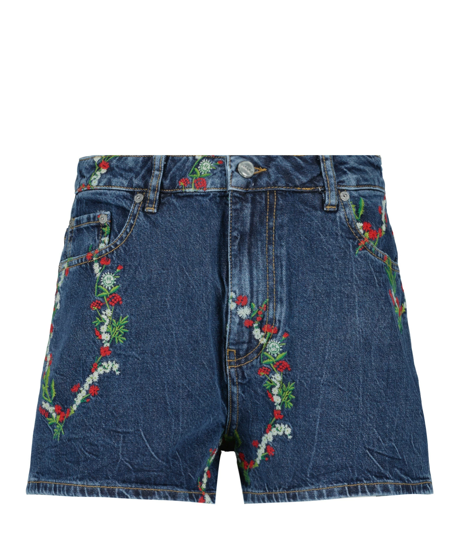 Short en denim bleu marine, avec broderies florales rouges. Cinq poches. Fermeture par zip.