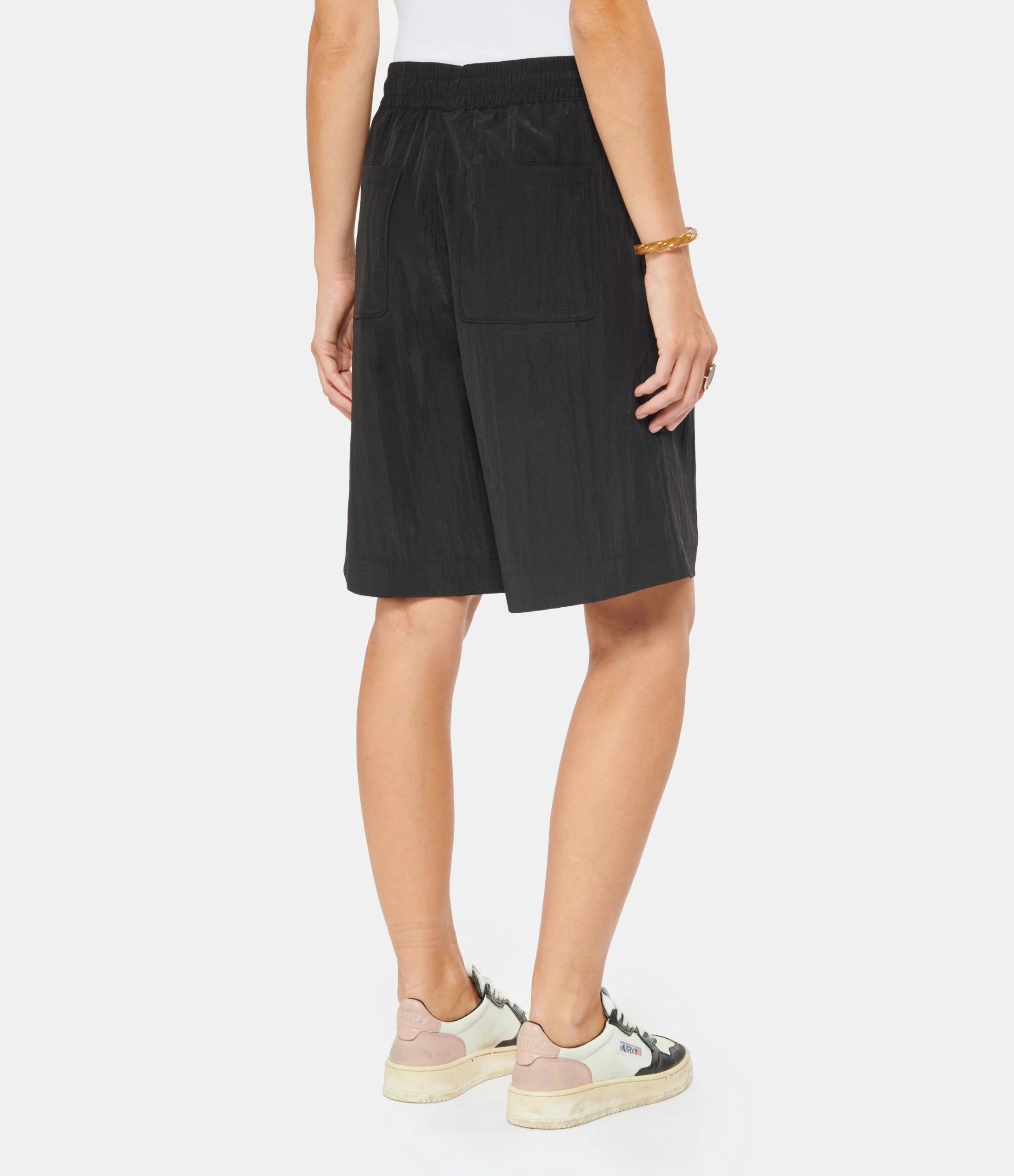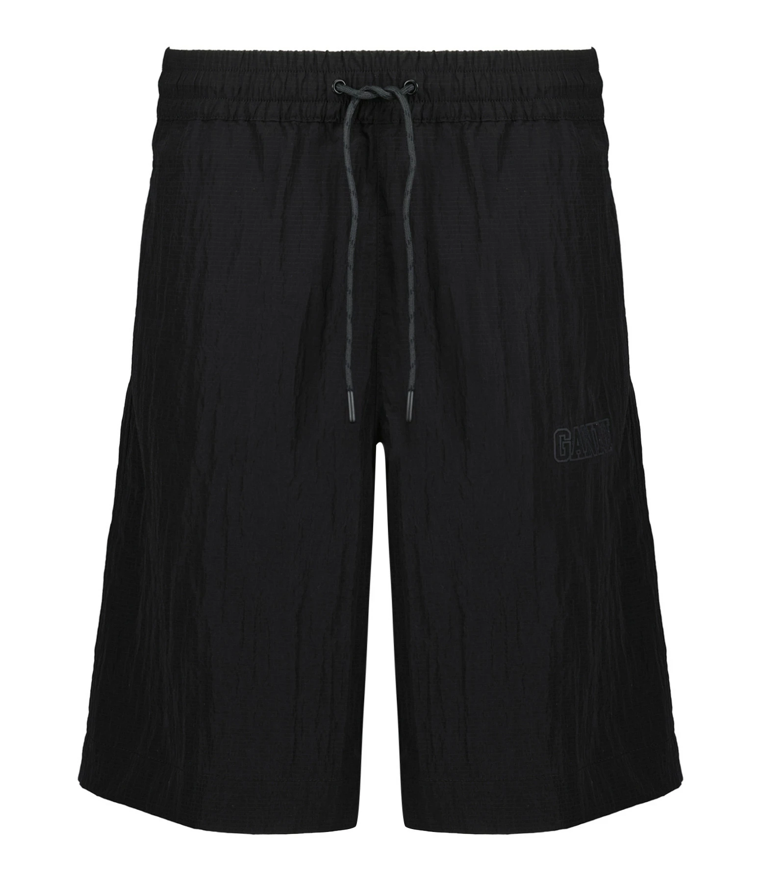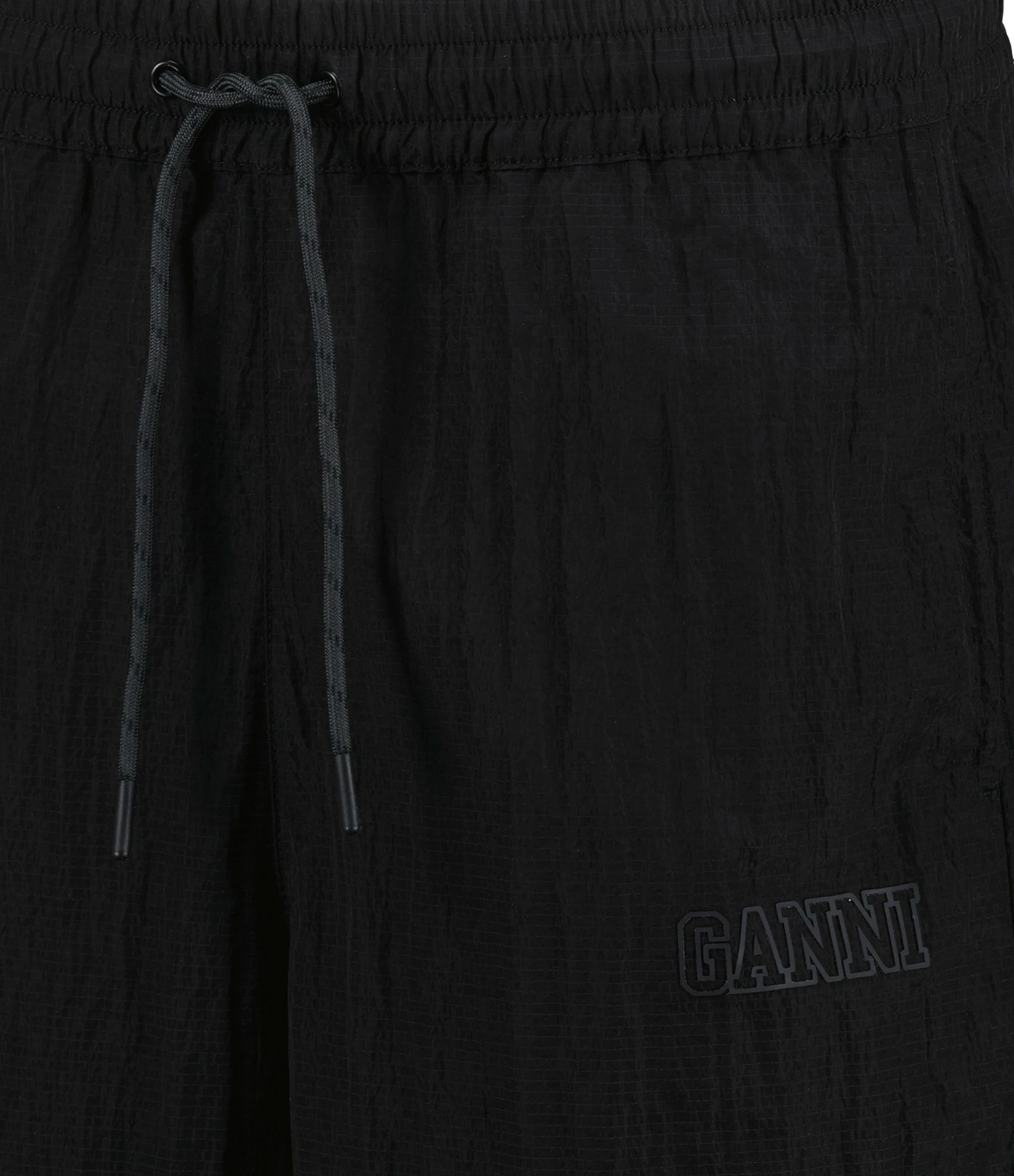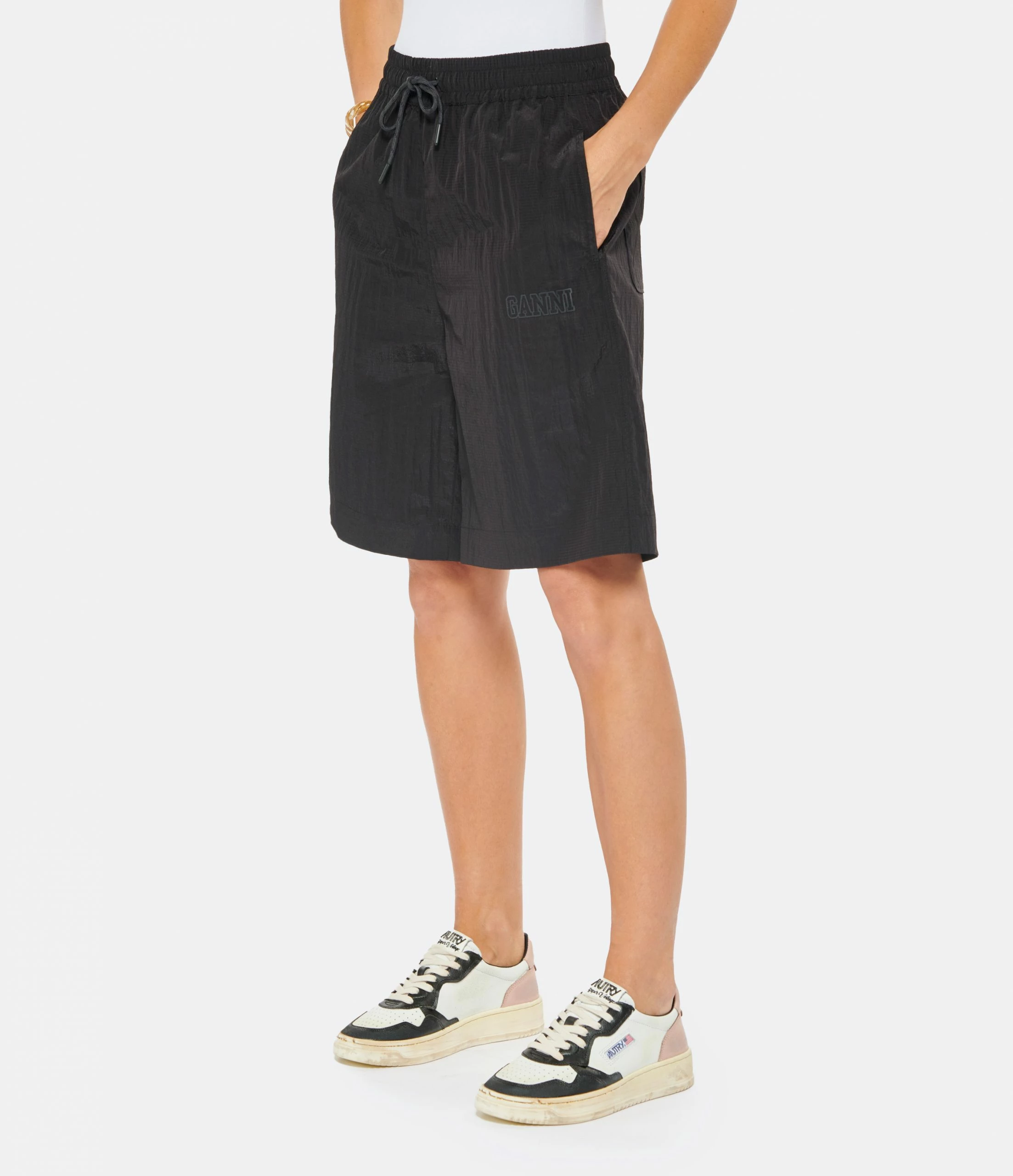 Bermuda en tissu technique léger. Taille haute. Logo imprimé “GANNI”. Deux poches latérales cachées et deux poches arrières plaquées. Taille élastique avec liens de serrage. Coupe ample. Non doublé.
