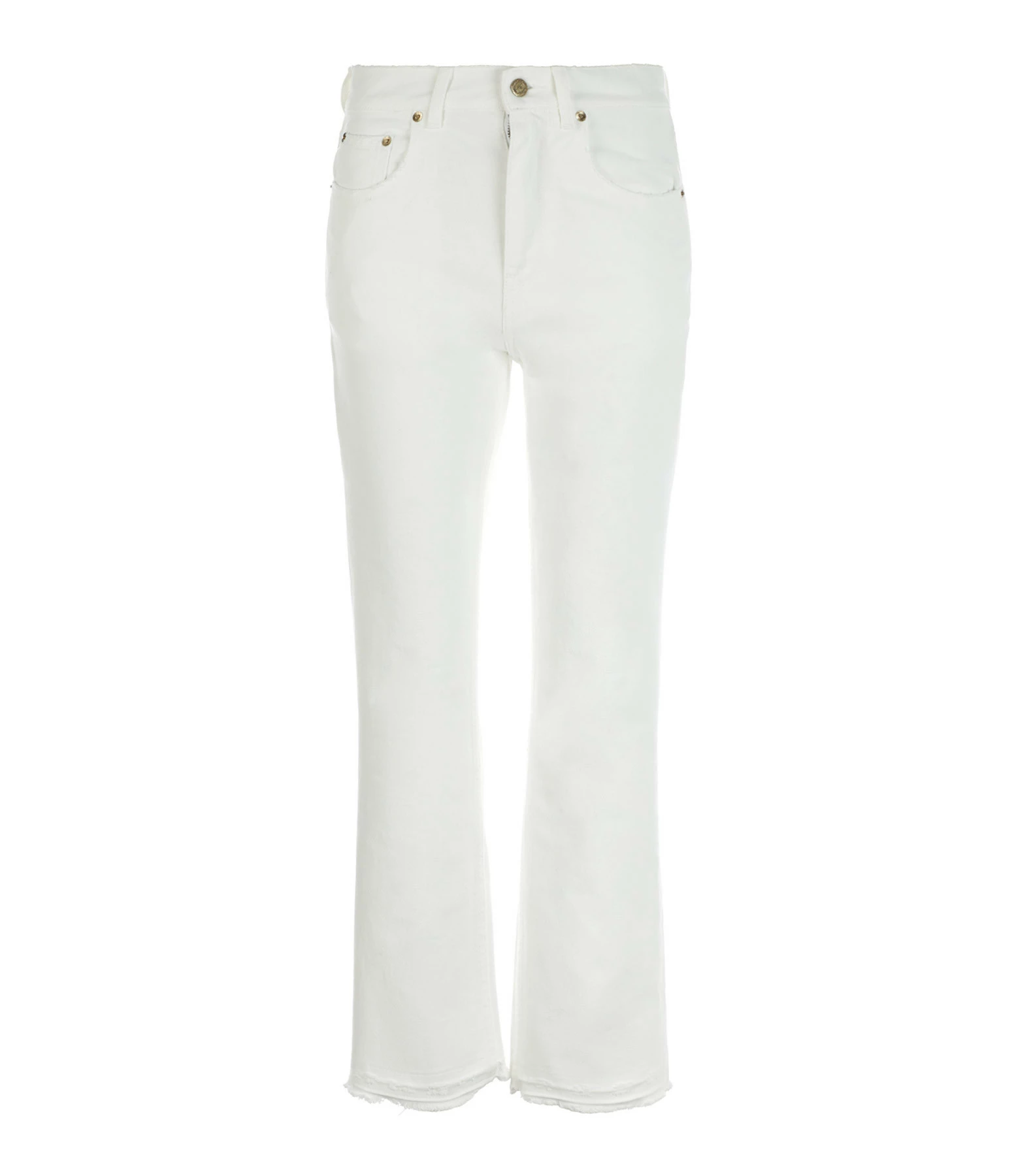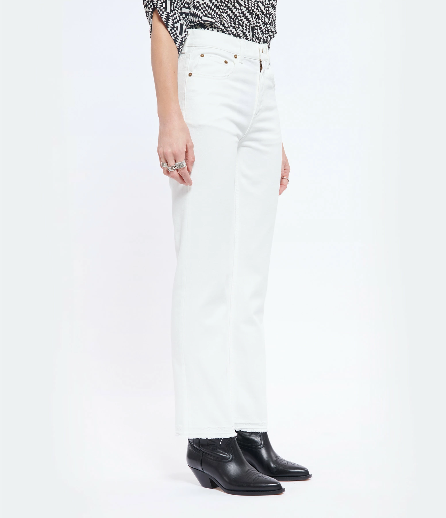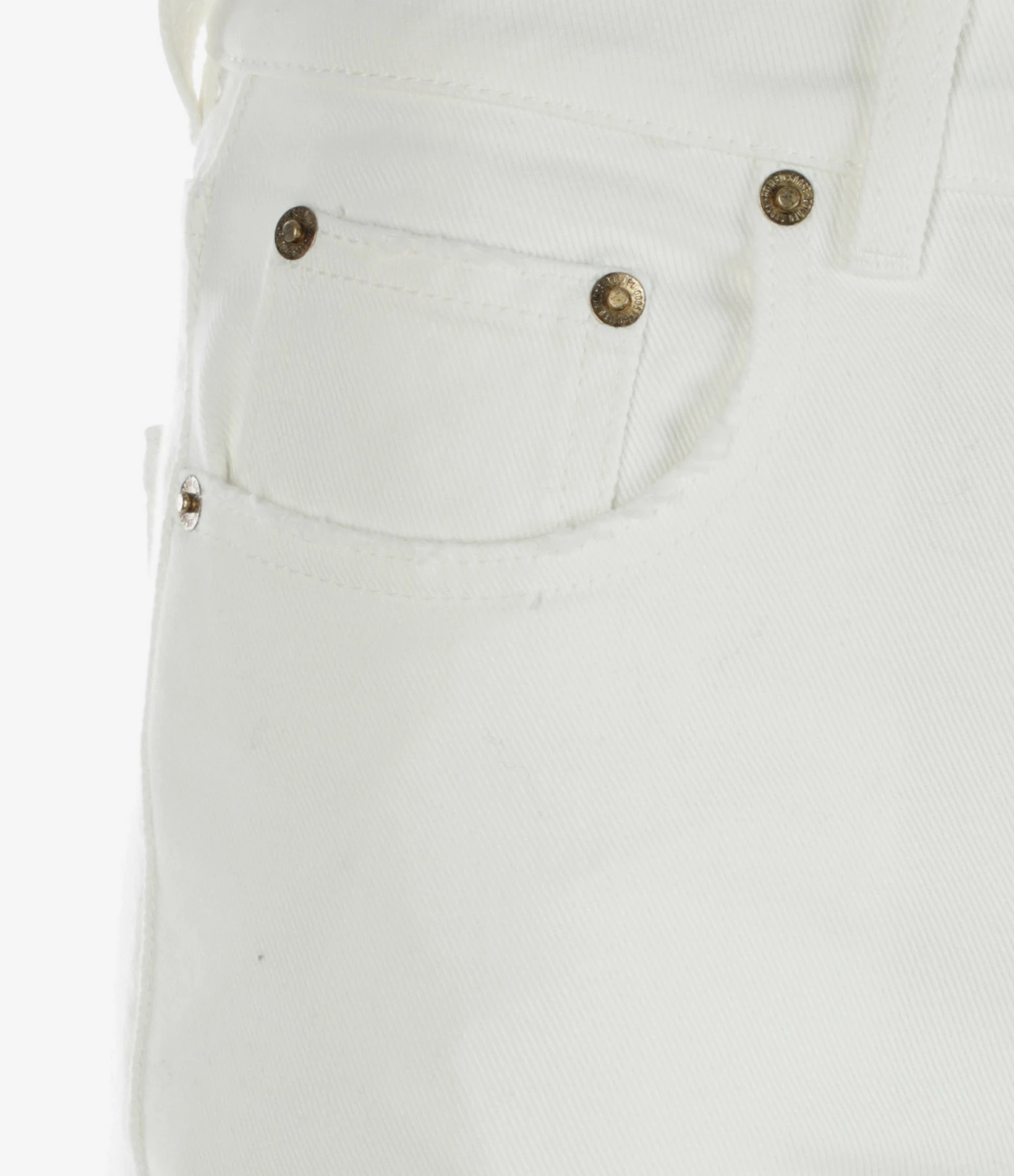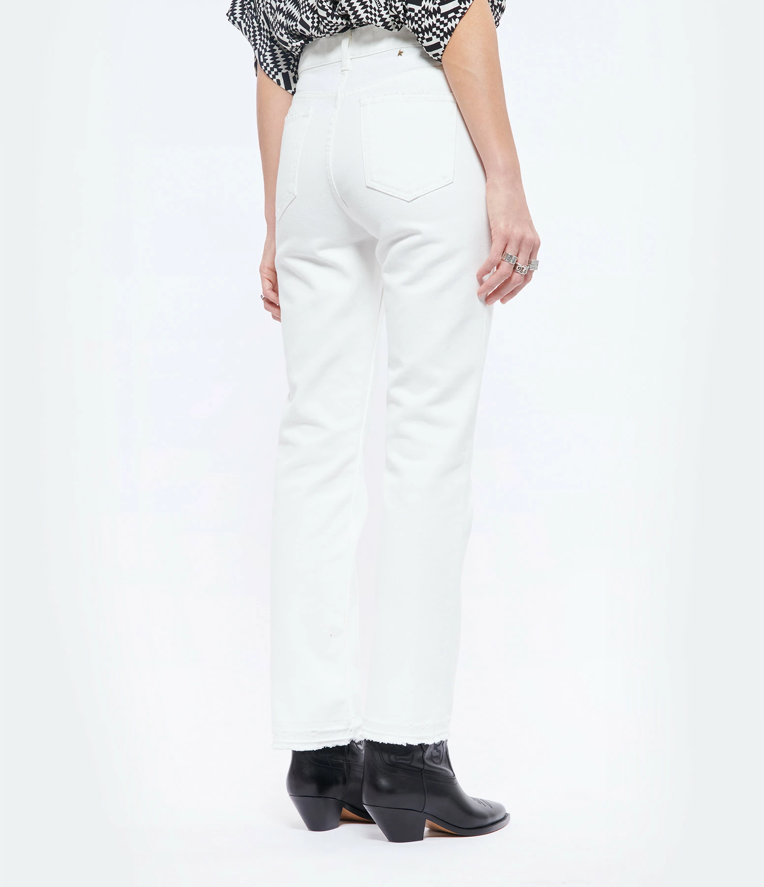 Jean droit en denim blanc. Cinq poches. Fermeture par zip et bouton. Passants pour ceinture. Bas de jambe frangé. Coupe droite.