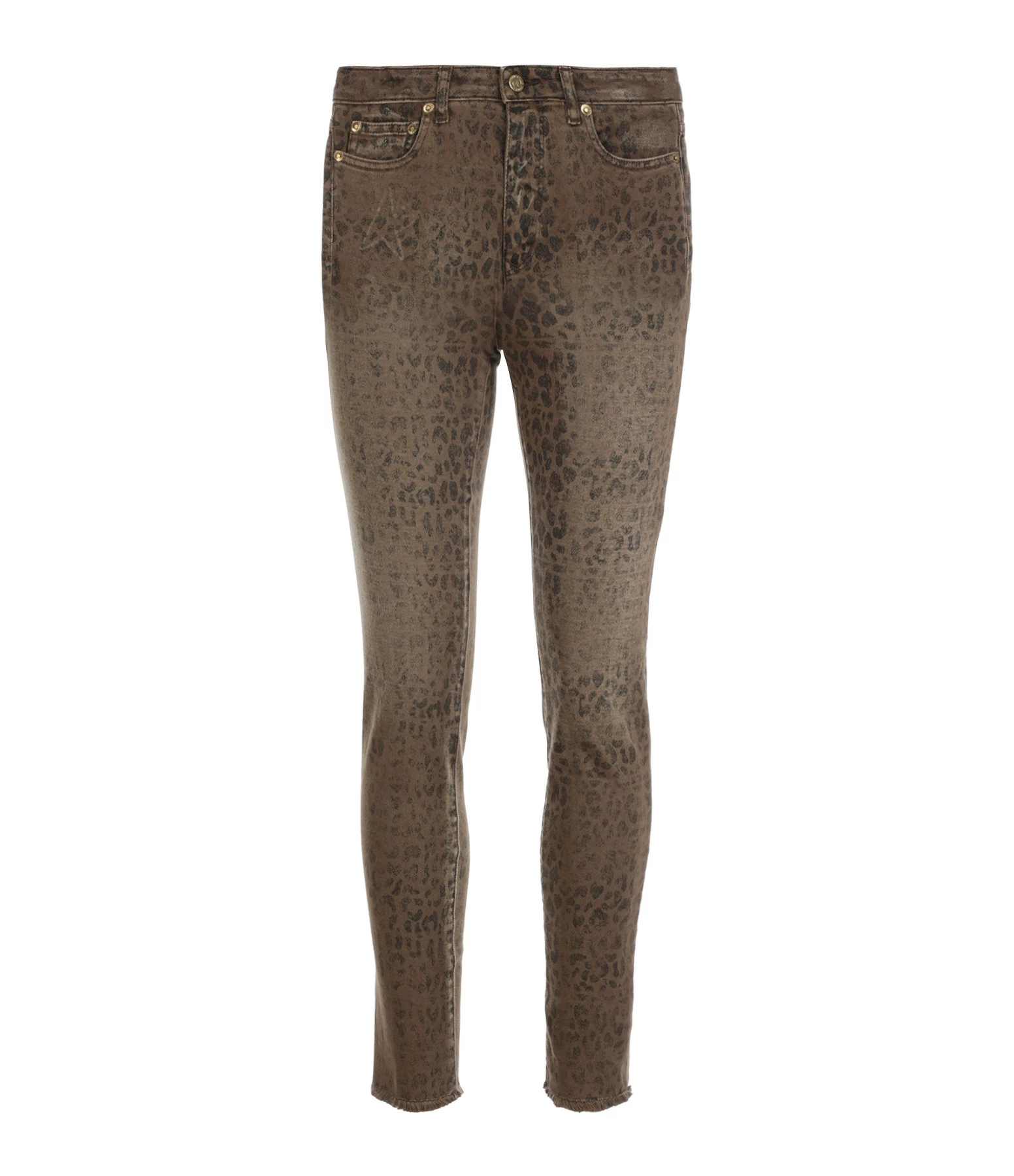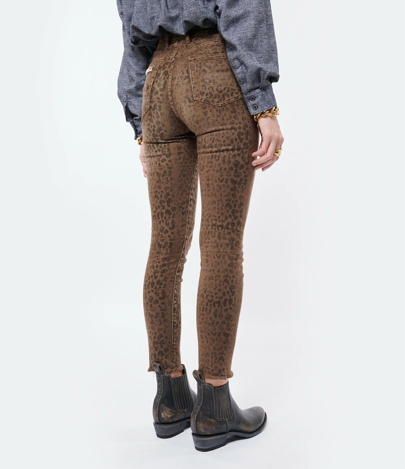 Jean en denim à imprimé léopard marron. Cinq poches. Fermeture par zip et bouton. Passants pour ceinture. Coupe slim. Bas de jambe frangé.