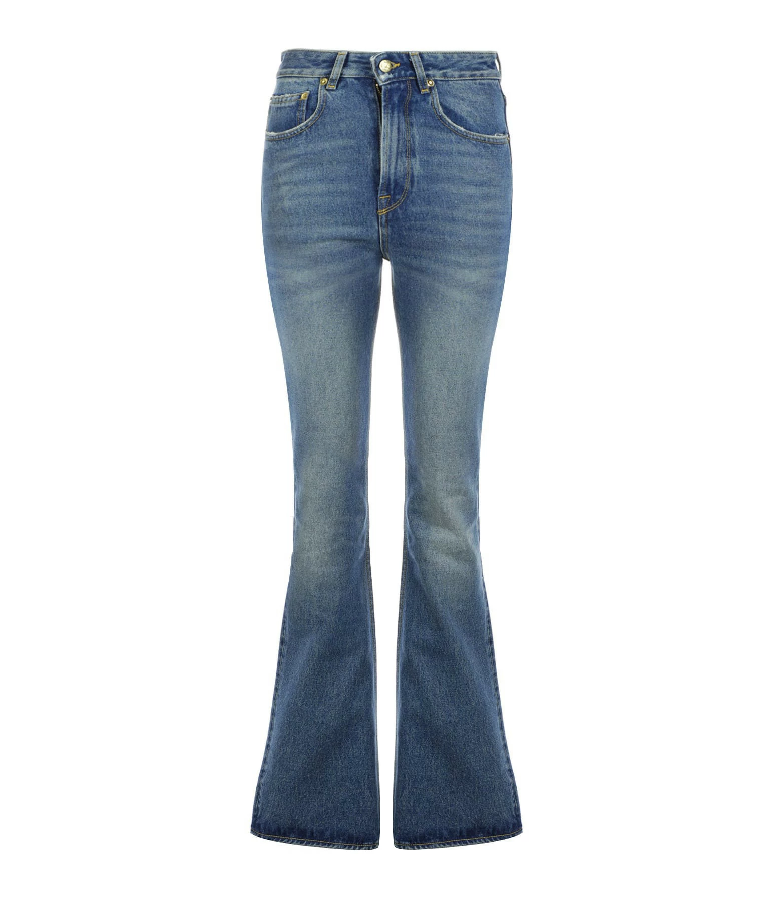 Jean flare en denim bleu. Taille haute. Cinq poches. Fermeture par zip et bouton. Passants pour ceinture.