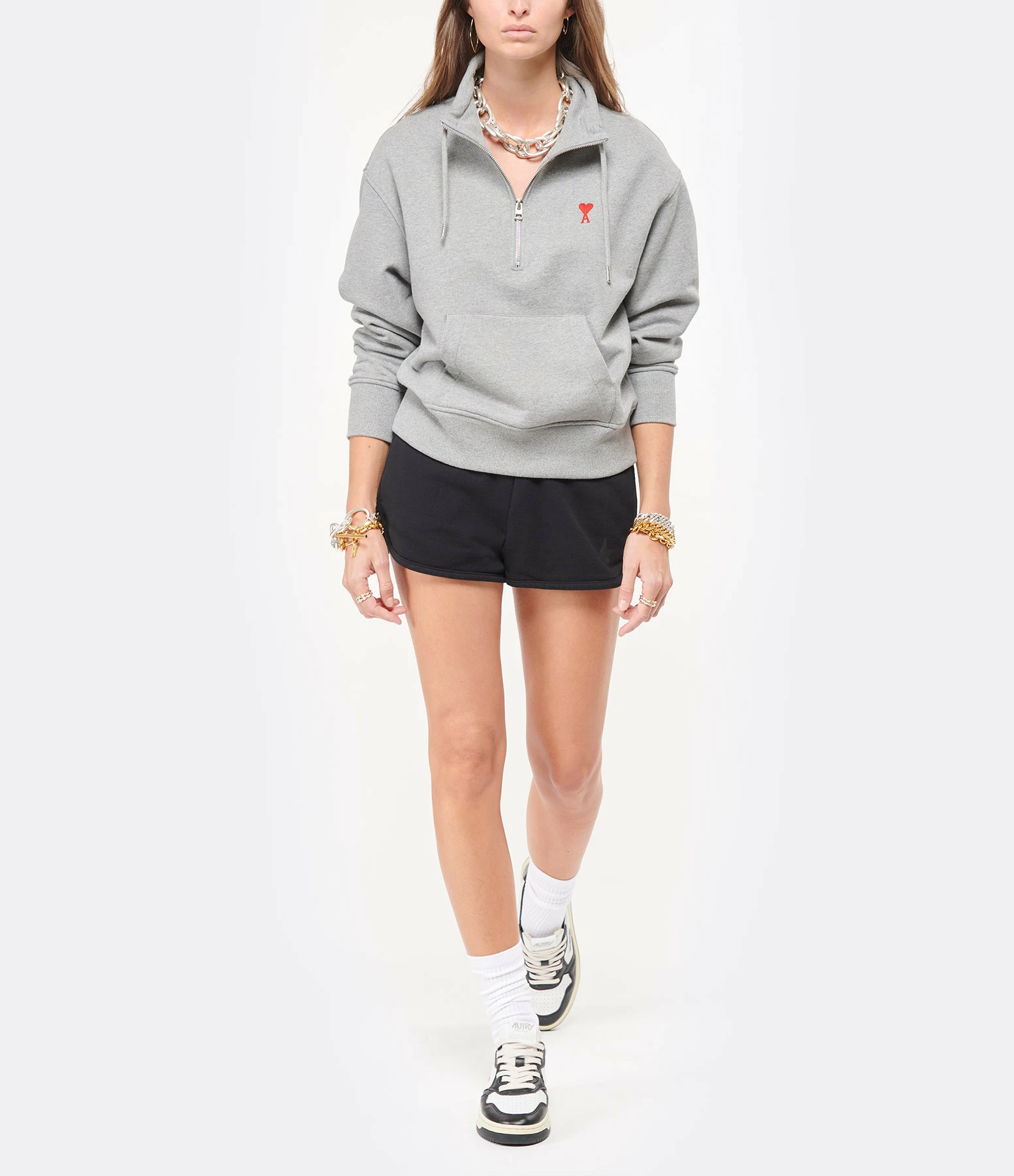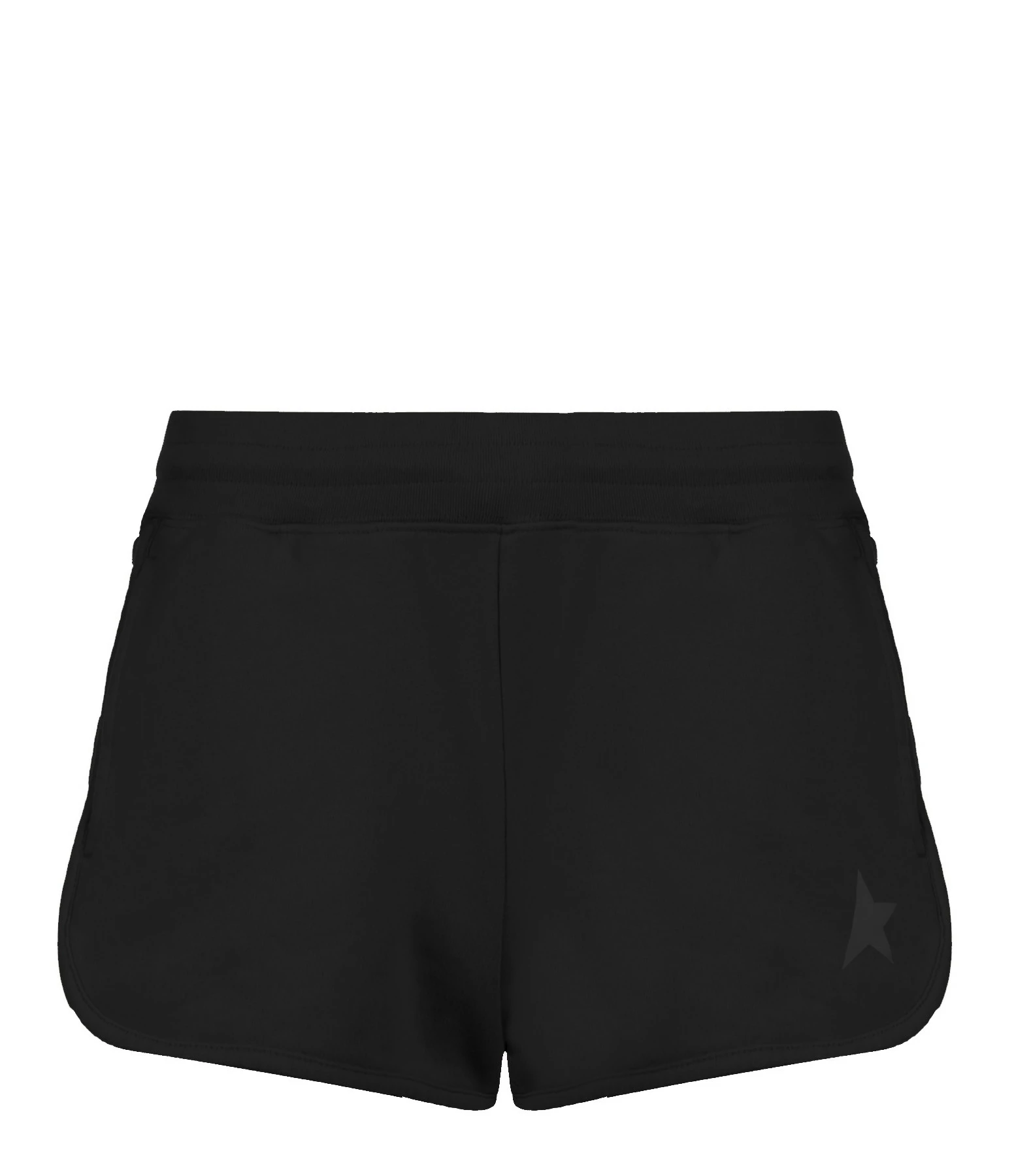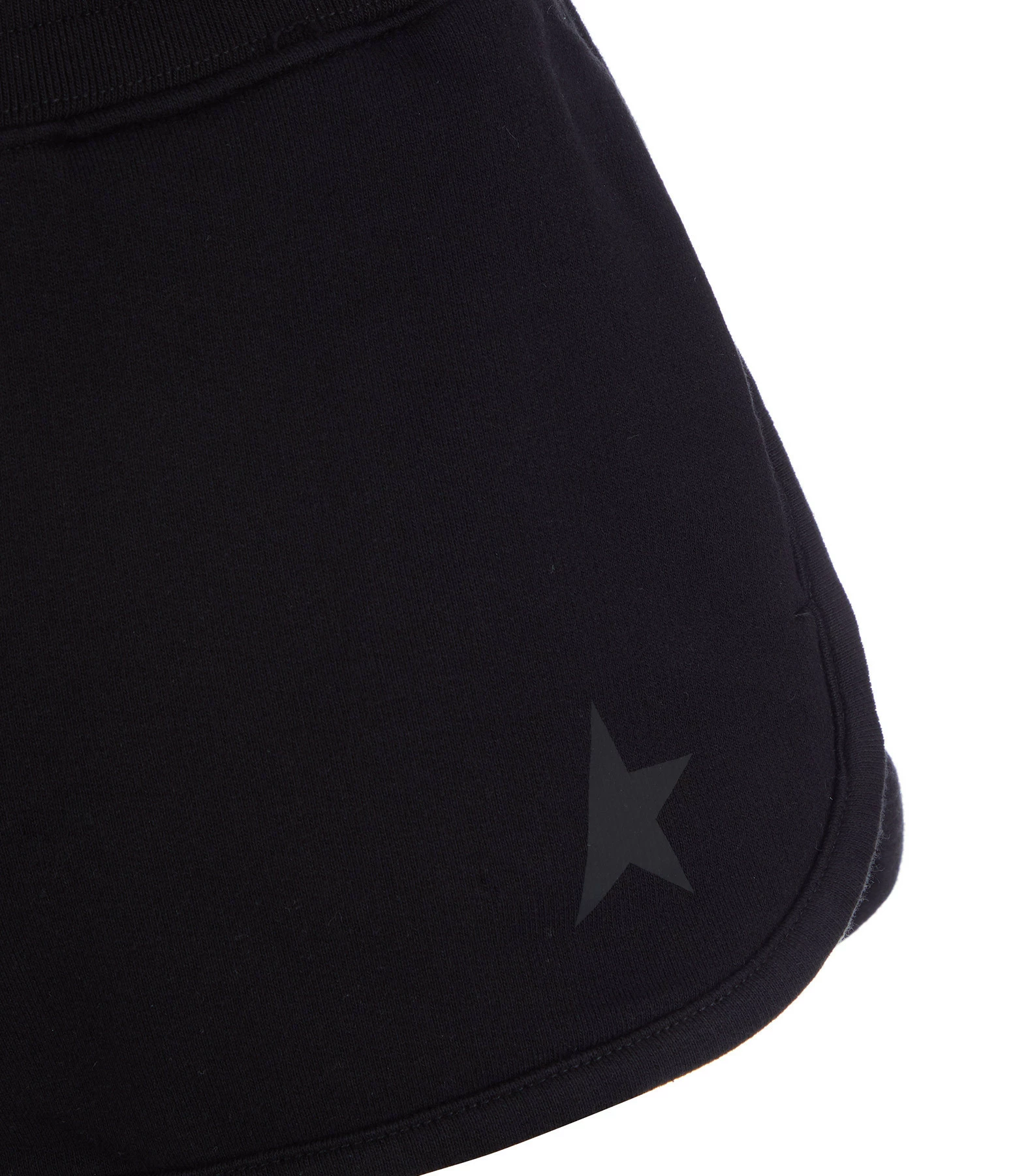 Short en coton noir avec étoile noire sur la jambe gauche. Deux poches italiennes. Taille élastiquée avec liens de serrage à l’intérieur. Non doublé.