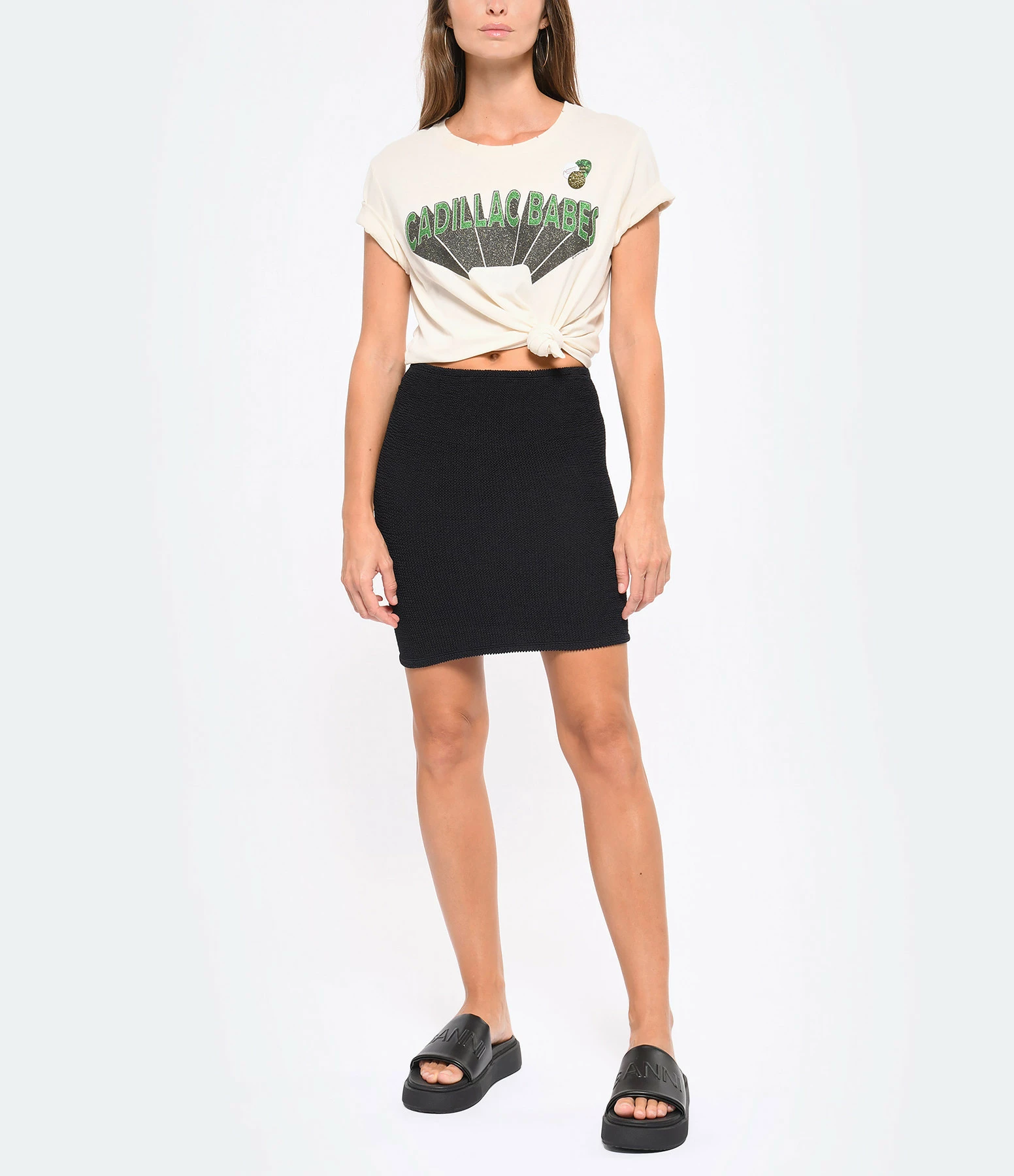 Mini-jupe en crépon extensible noir. Sans couture. Coupe près du corps. Base droite. Non doublée.