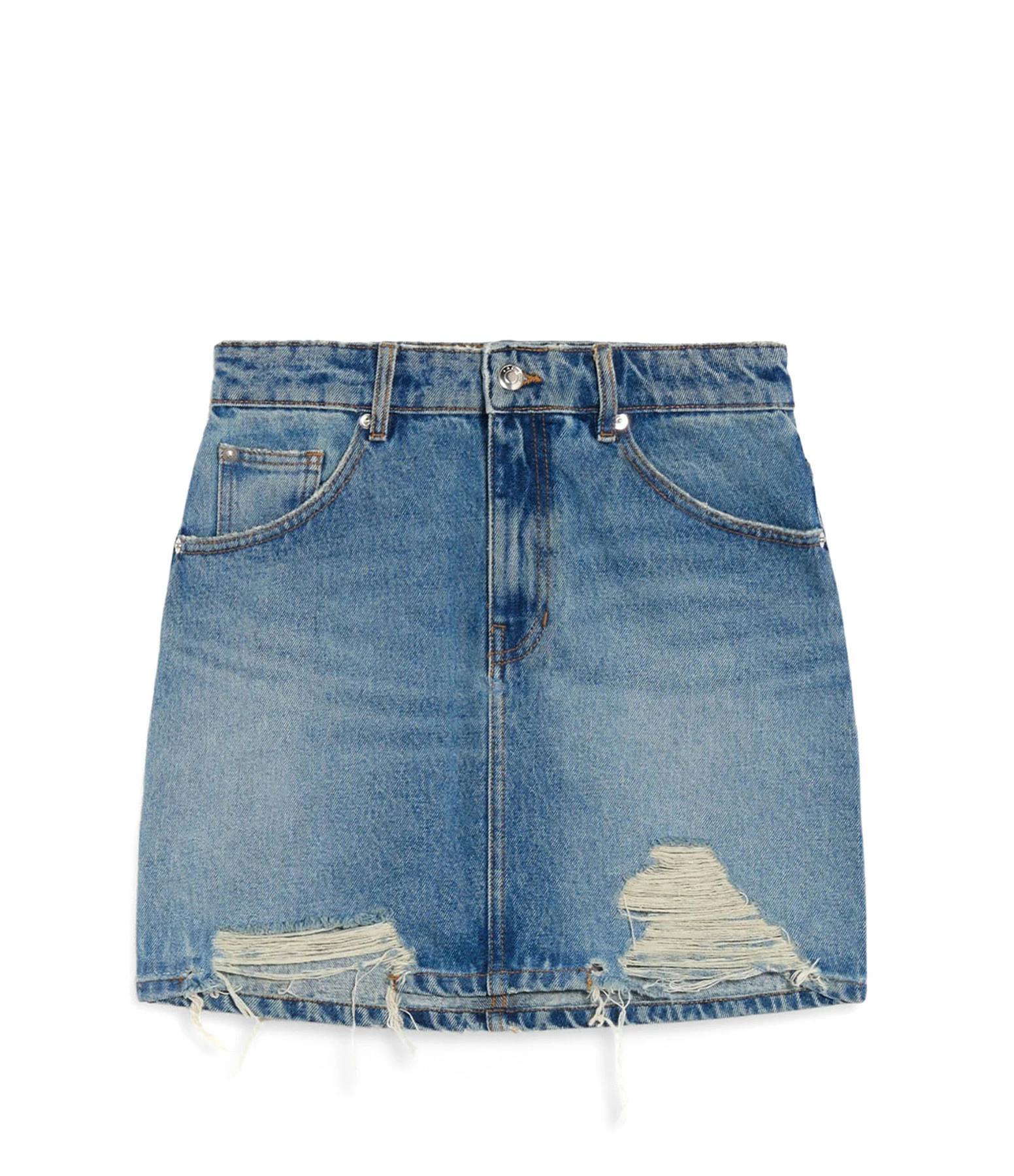 Jupe courte en denim de coton bleu délavé. Passants pour ceinture. Braguette zippée et boutonnée. Boutons et rivets métalliques argentés. Deux poches italiennes et une poche à gousset. Deux poches plaquées dans le dos. Coupe droite. Base droite. Effet usé.