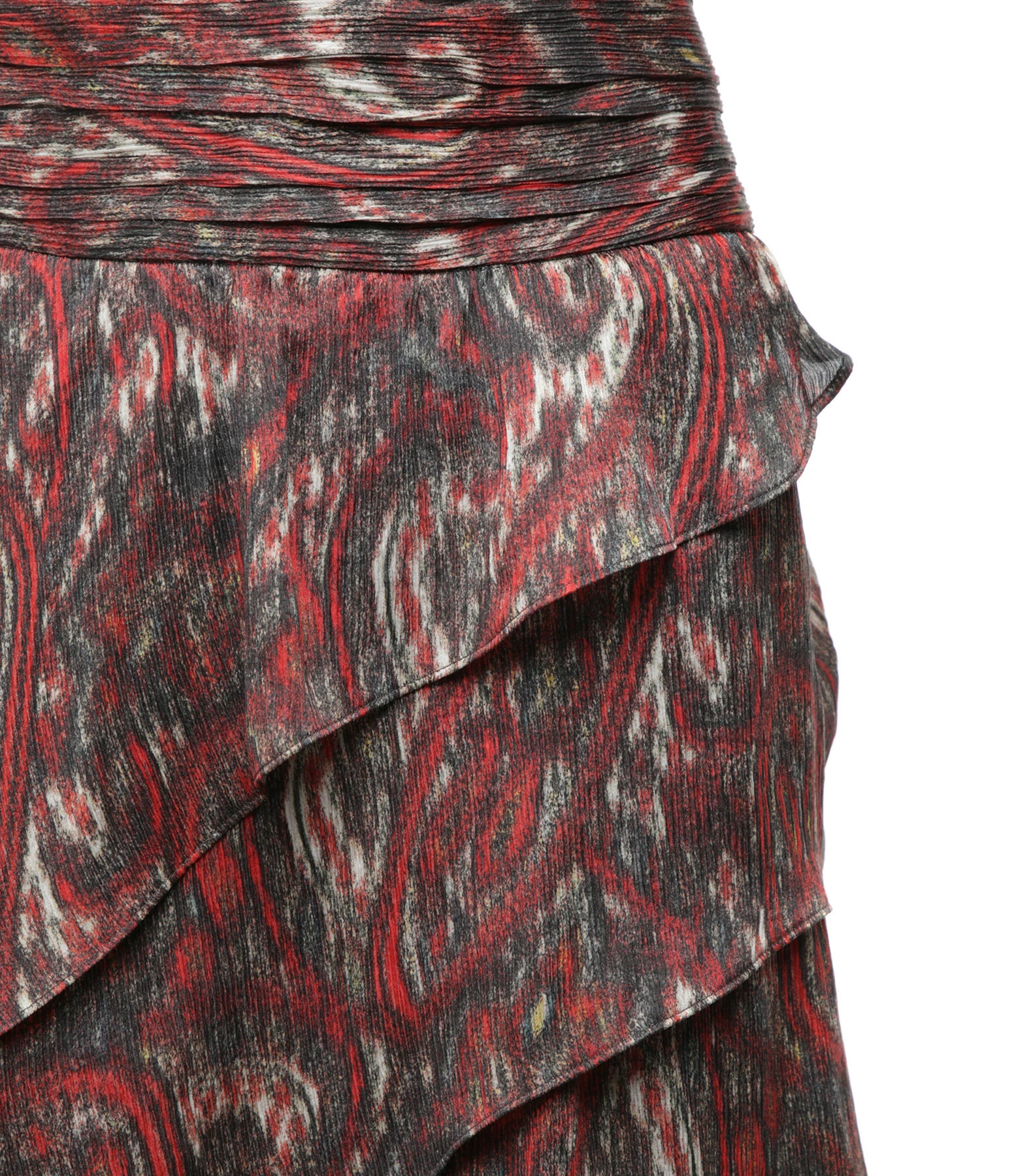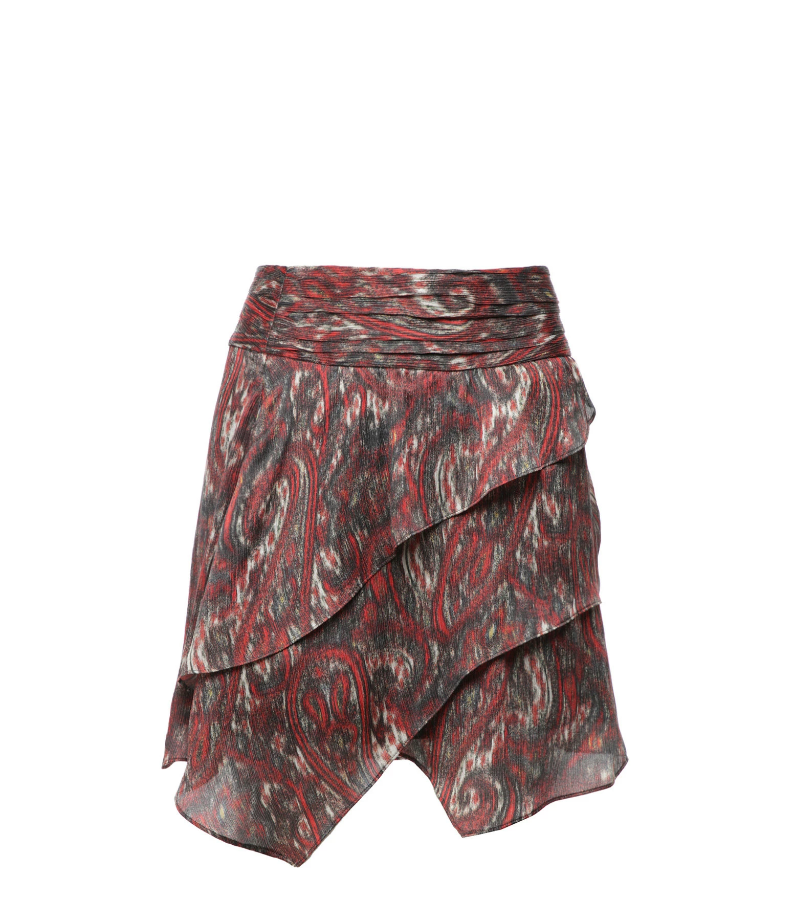 Jupe courte à volants imprimé rouge et noir. Fermeture par un zip au dos. Base asymétrique.