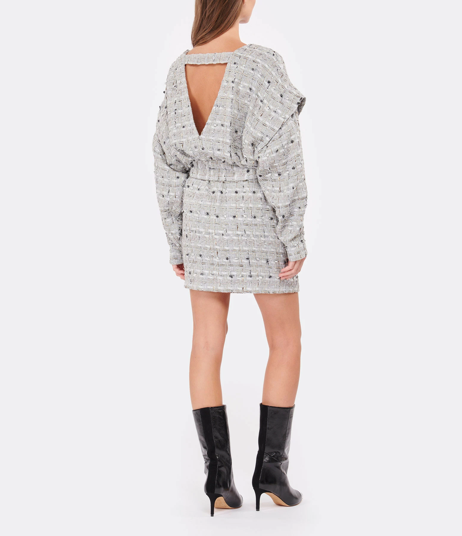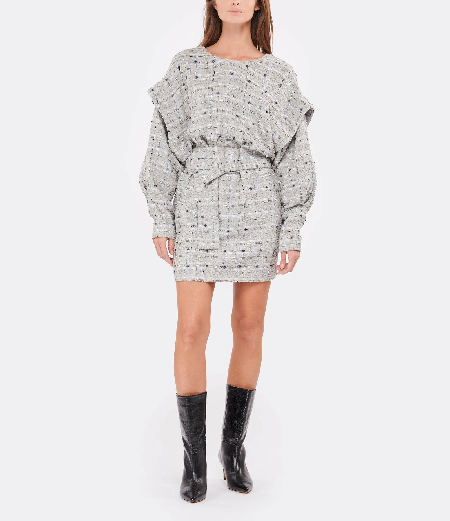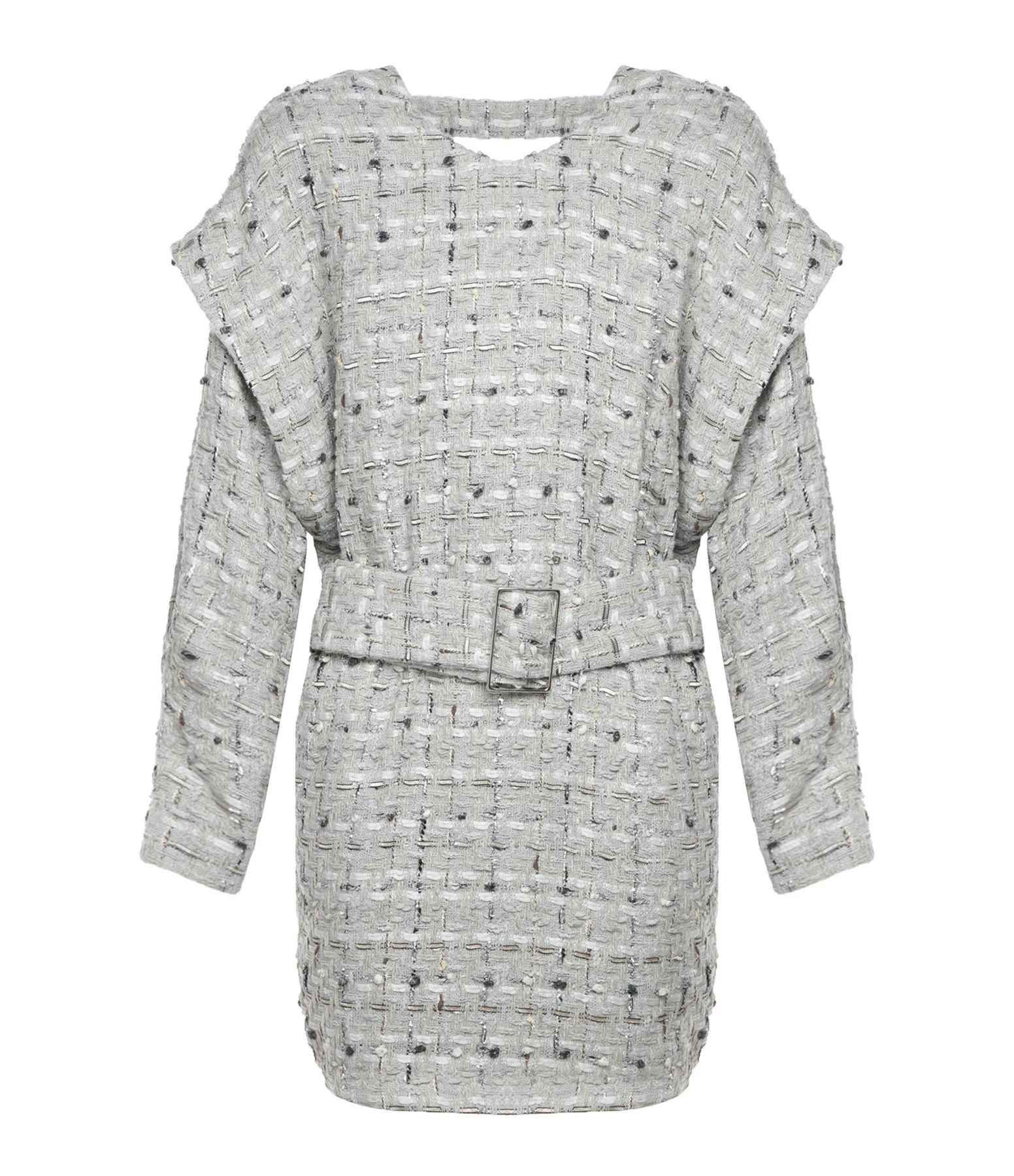 Robe en coton gris avec jeux de matières. Épaulettes. Ceinture à la taille. Col rond. Décolleté dans le dos. Manches longues. Coupe droite. Base droite. Entièrement doublée.