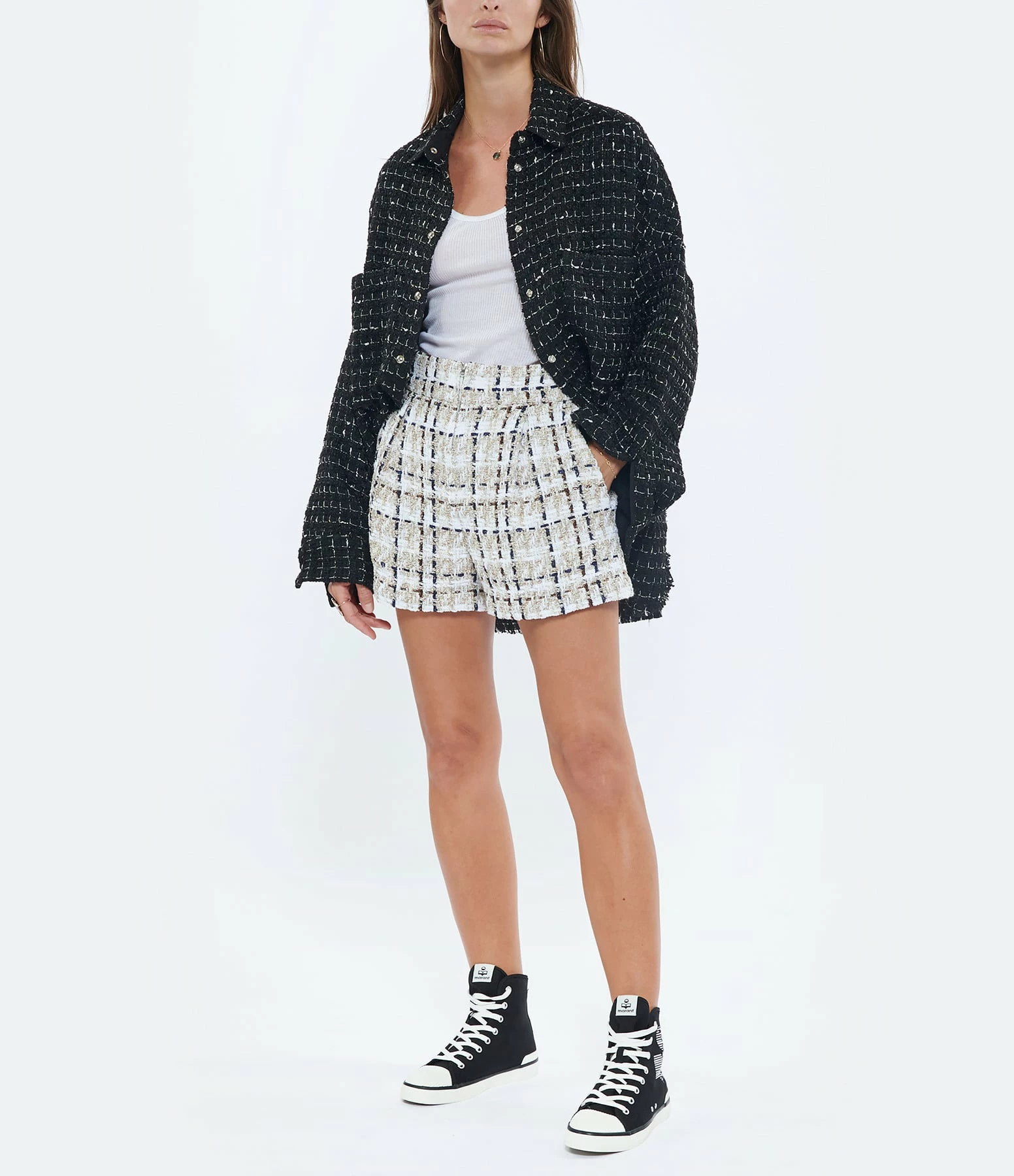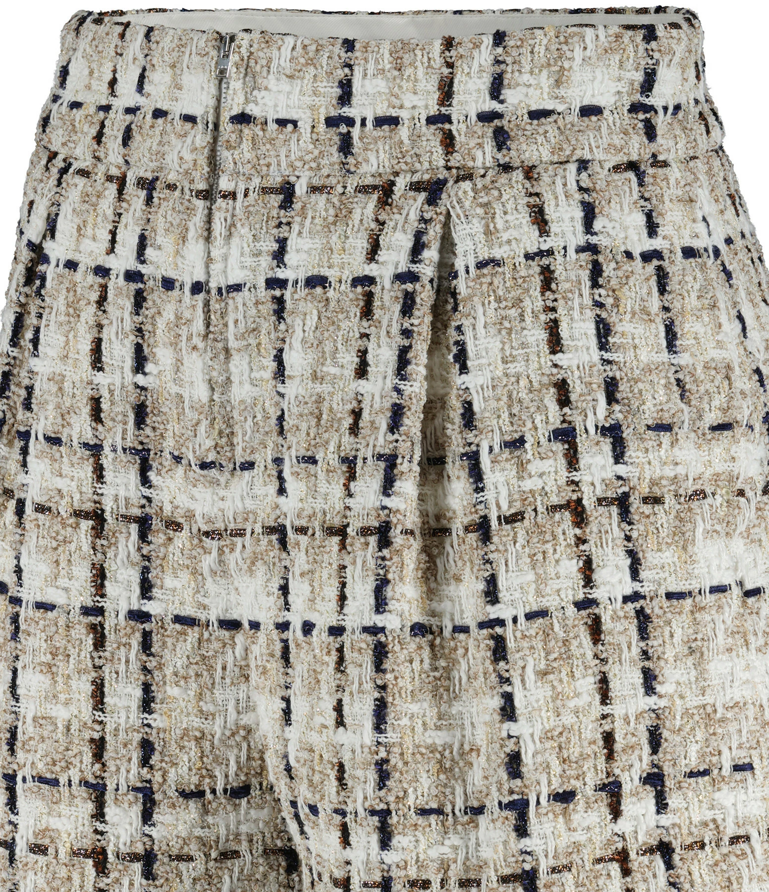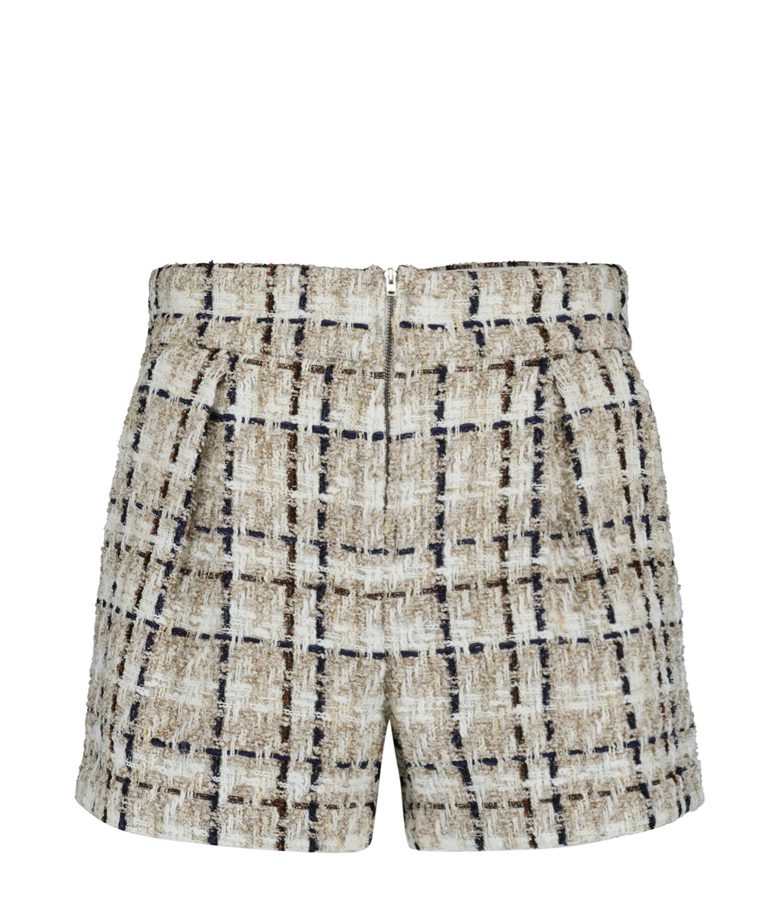 Short à pinces en tweed à carreaux écru. Taille haute. Fermeture zippée devant. Deux poches italiennes sur le devant. Deux poches passepoilées dans le dos. Coupe évasée. Base droite. Doublé.