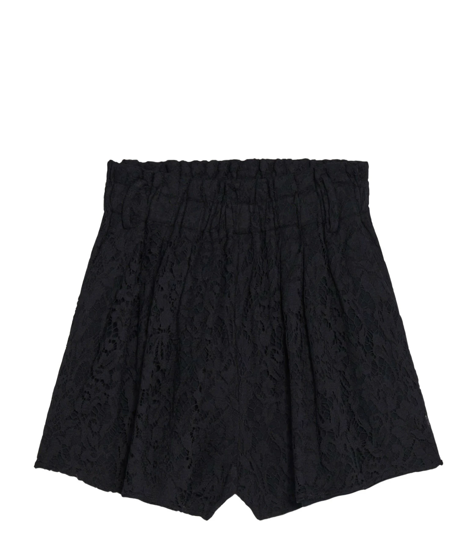 Short en dentelle noire. Taille élastiquée. Fronces au niveau de la taille. Passants pour ceinture. Deux poches italiennes sur le devant. Coupe cintrée ample. Base droite. Entièrement doublé.