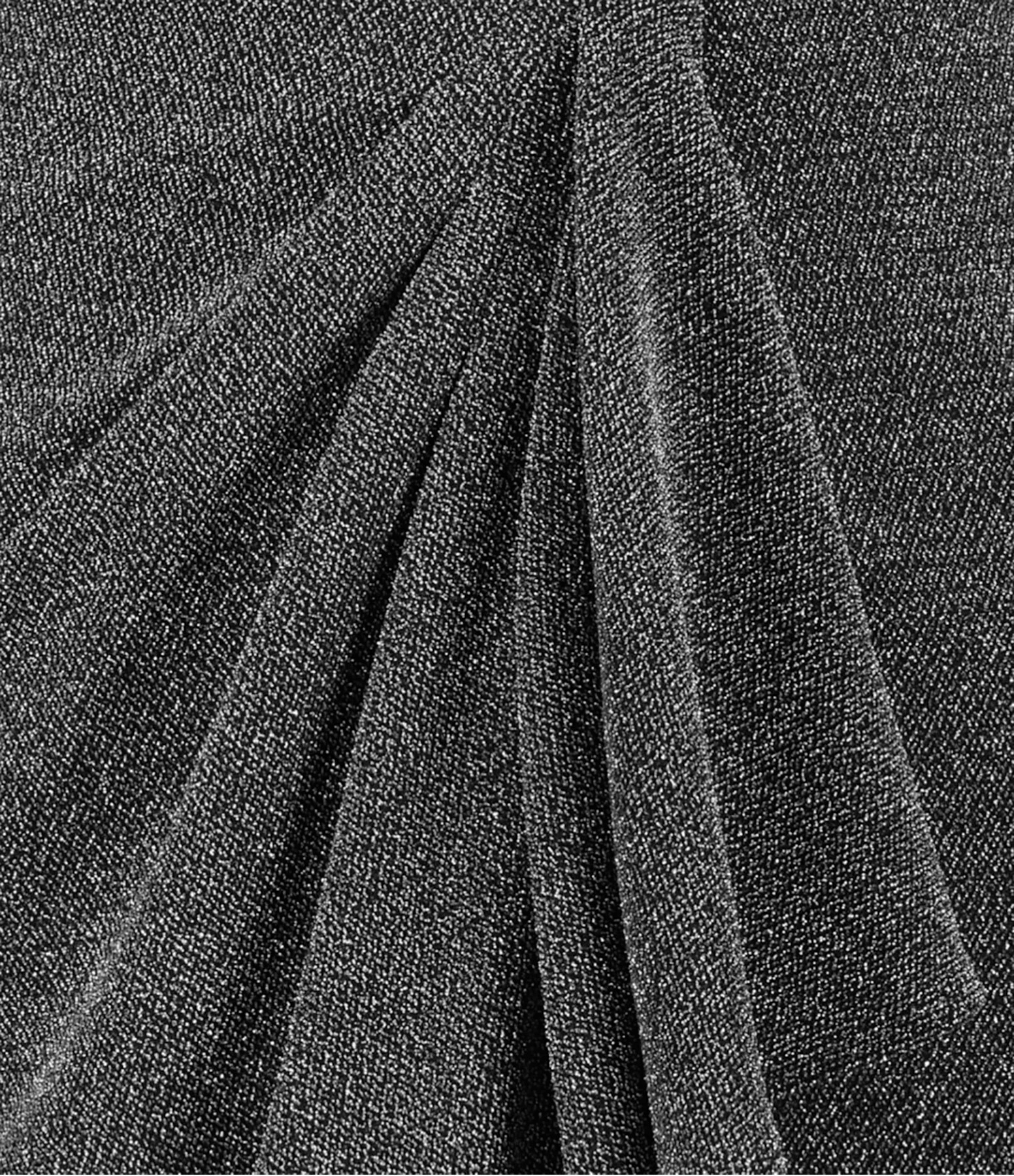 Jupe courte portefeuille en fils métallisés argentés ornée de fronces créant un effet de volant sur le devant. Fermeture zippée invisible dans le dos. Coupe près du corps. Base asymétrique.