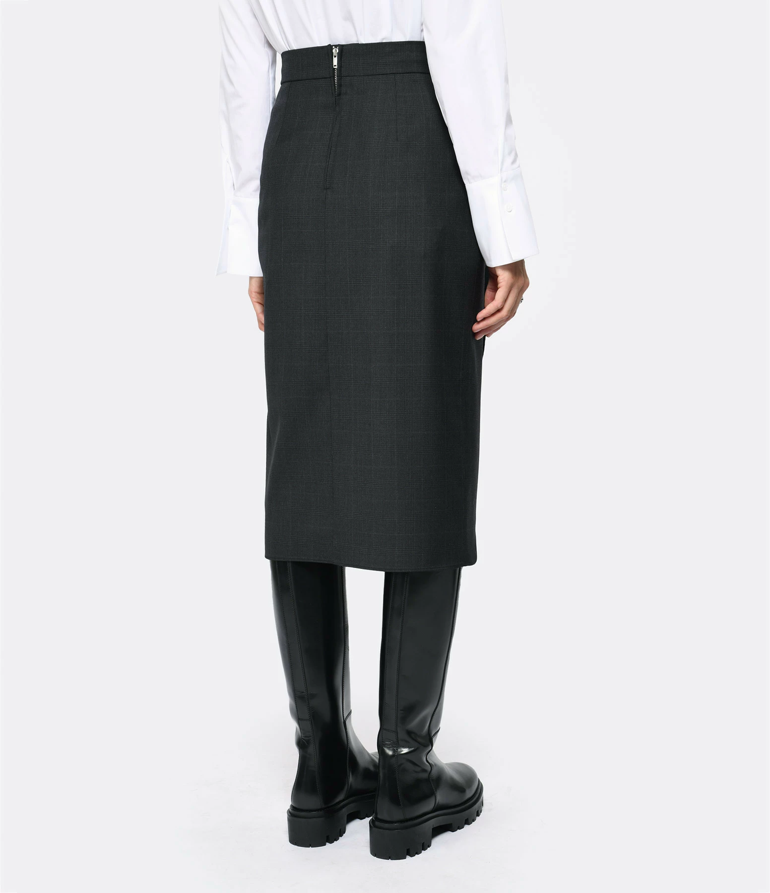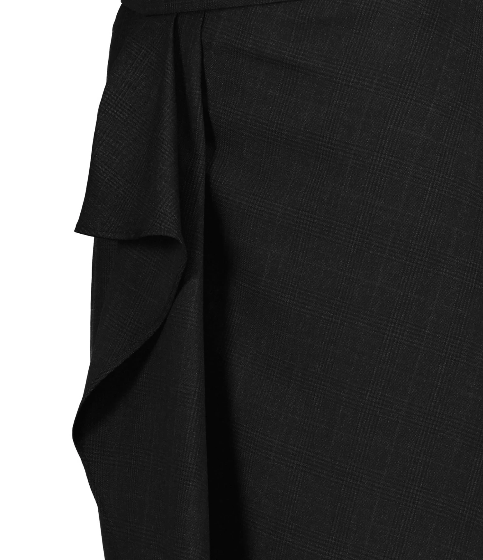 Jupe midi en laine imprimée à carreaux noirs ornée d’un volant sur le devant. Taille haute. Fermeture zippée dans le dos. Coupe droite. Base droite.