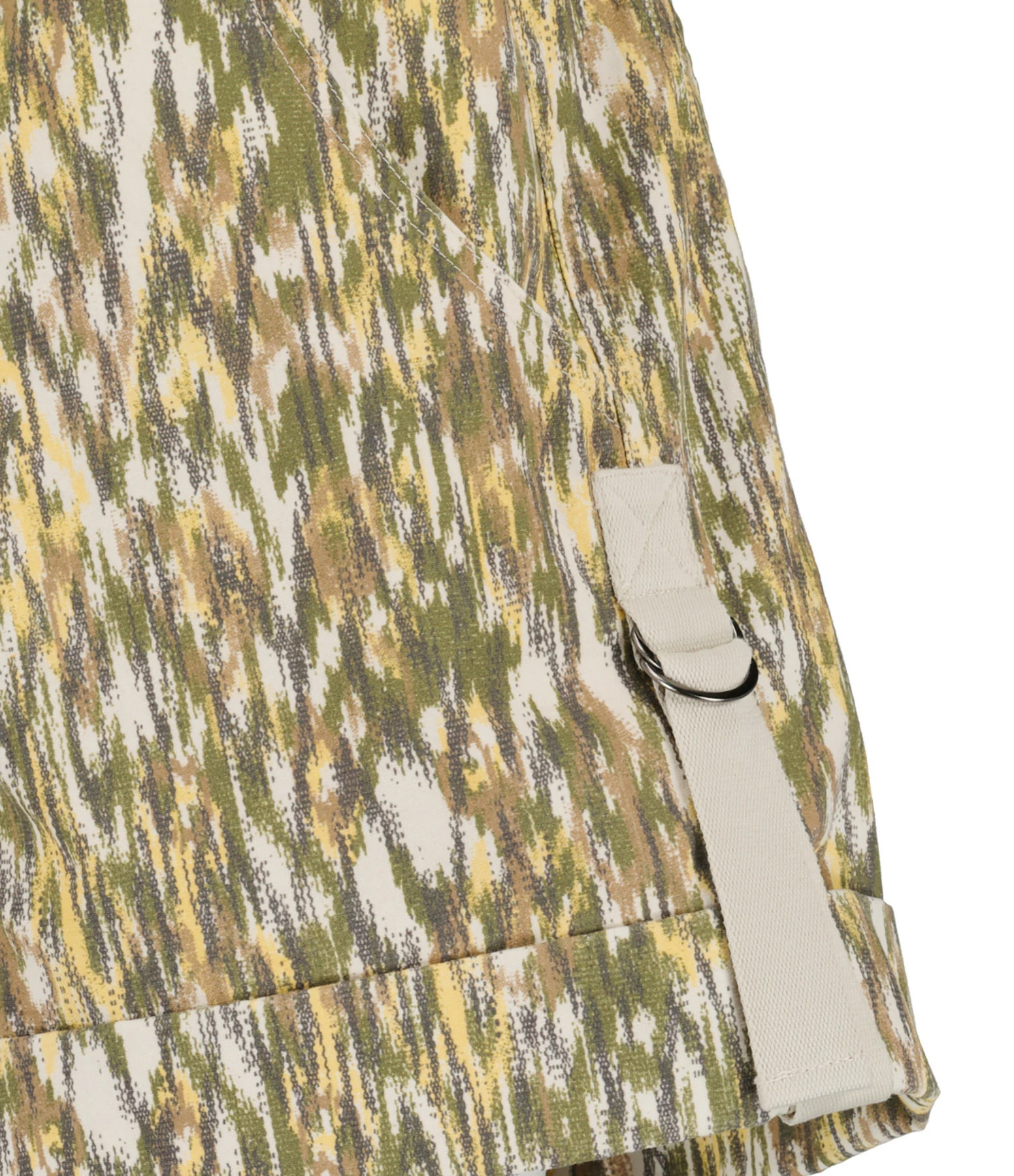 Short en coton imprimé dans des tons vert kaki. Taille haute avec ceinture amovible. Passants pour ceinture. Braguette zippée et pressionnée. Boutons pressions en métal argent. Deux poches italiennes. Deux poches plaquées pressionnées dans le dos. Sangles beiges sur les côtés. Coupe cintrée ample. Base droite. Ourlet roulé. Doublé en coton blanc.