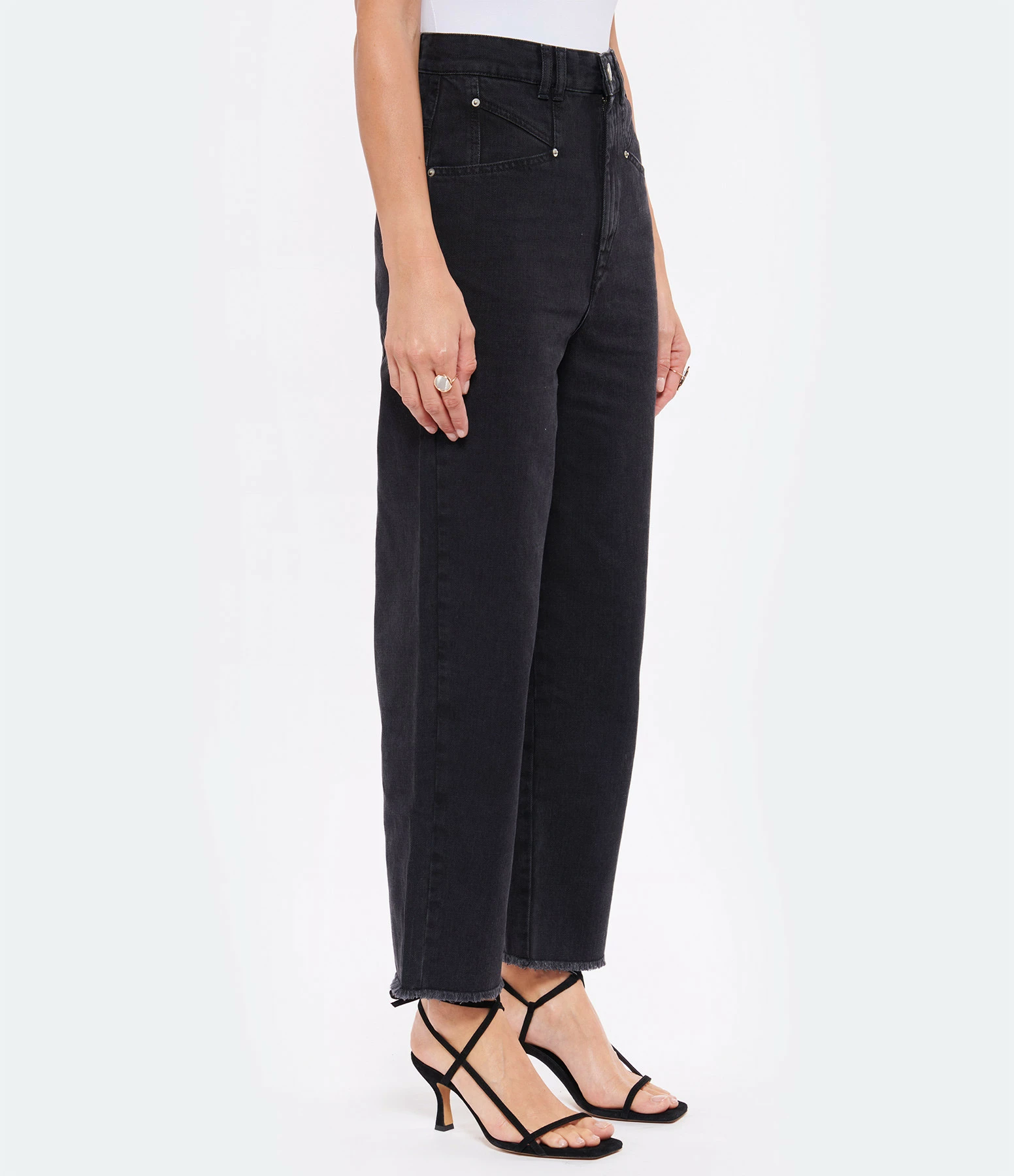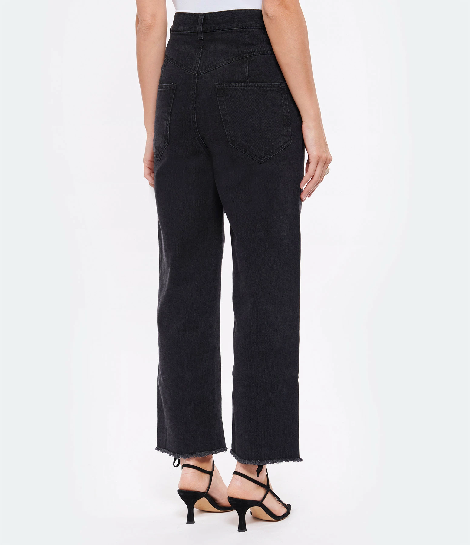 Pantalon en denim de coton noir. Taille haute. Quatre poches. Base effilochée coupée à cru. Coupe boyfriend.