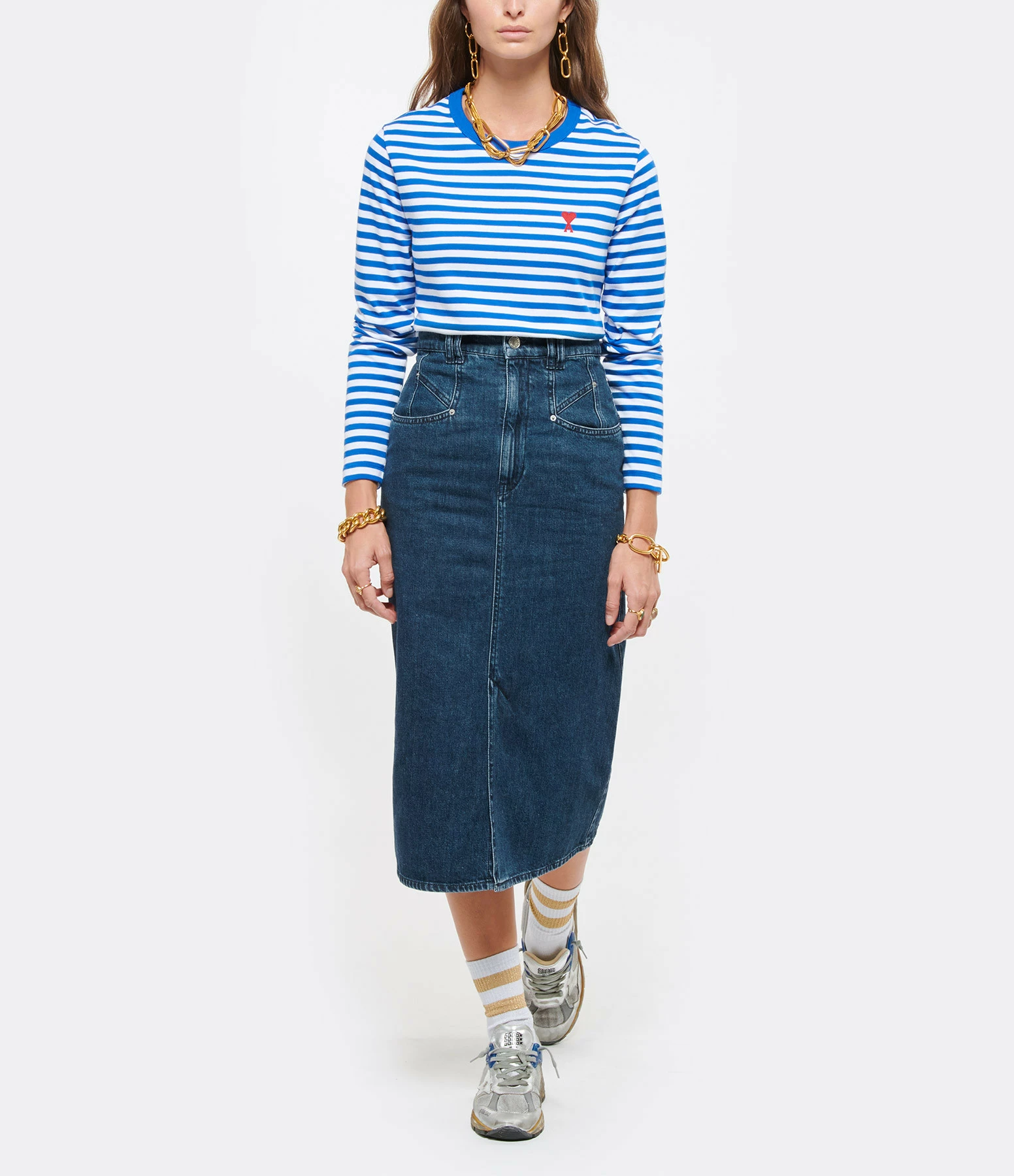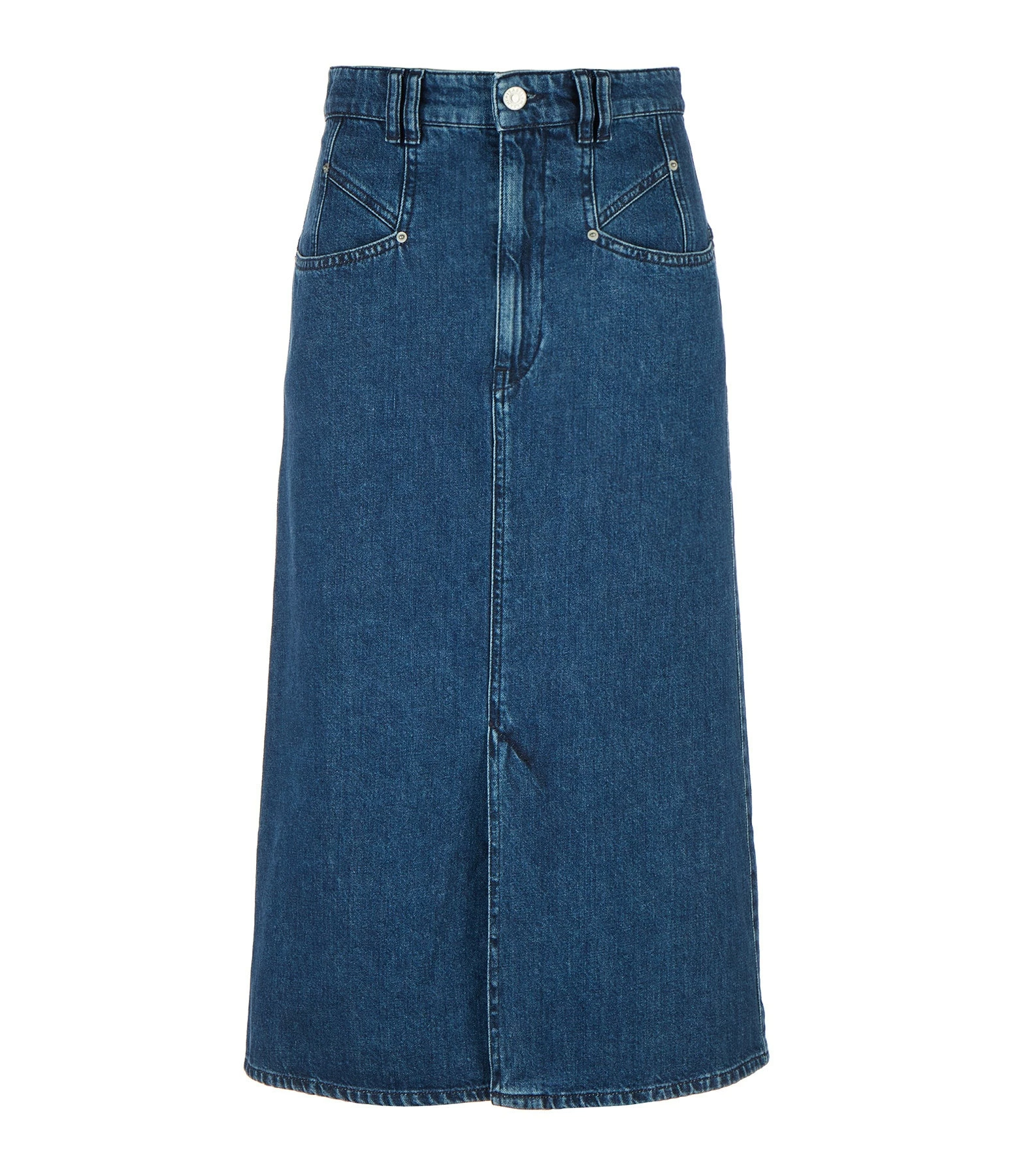 Jupe mi-longue en denim bleu. Quatre poches. Fermeture par zip et bouton. Fentes de 27 cm à l’avant. Coupe droite. Base droite.