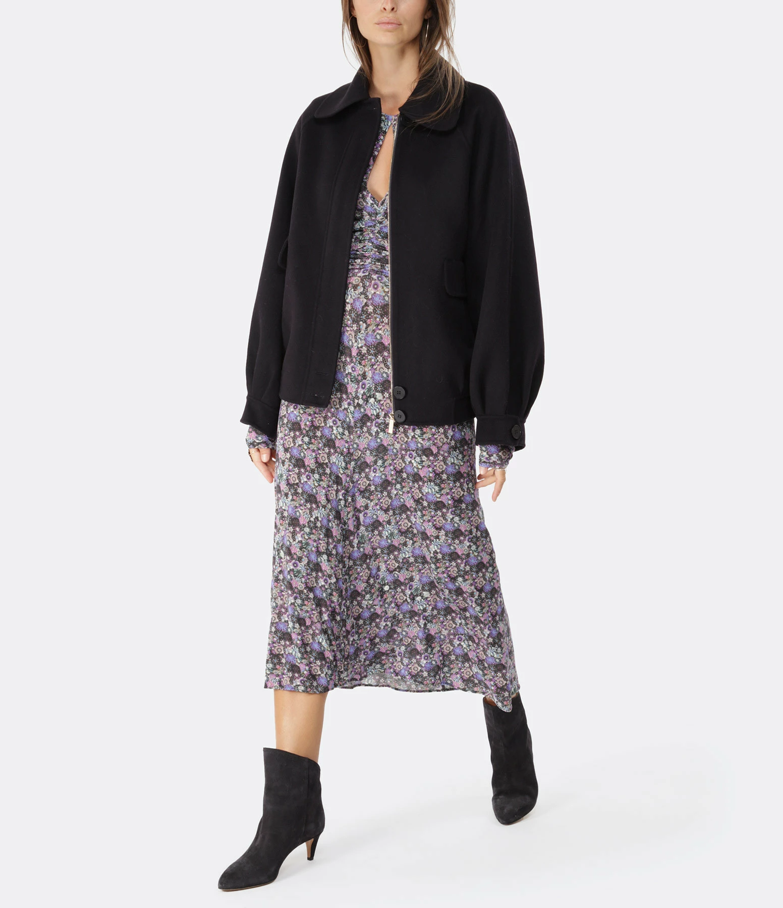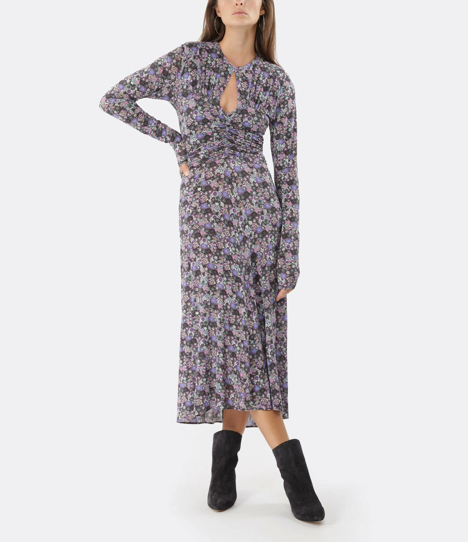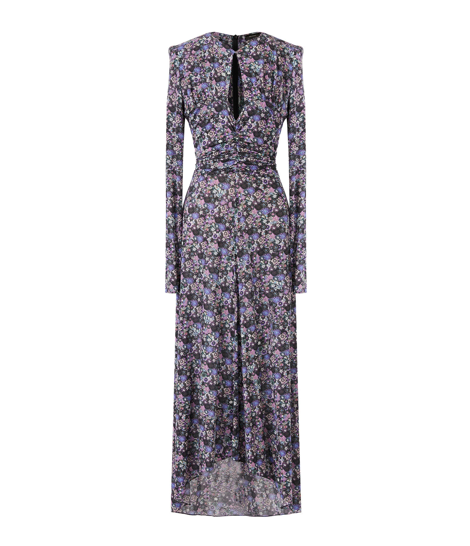 Robe longue en jersey à imprimé floral violet. Encolure en V avec ouverture goutte d’eau. Manches longues. Epaulettes. Détails de fronces sur le devant et dans le dos. Fermeture zippée invisible dans le dos. Base plus longue dans le dos que sur le devant. Non doublée.