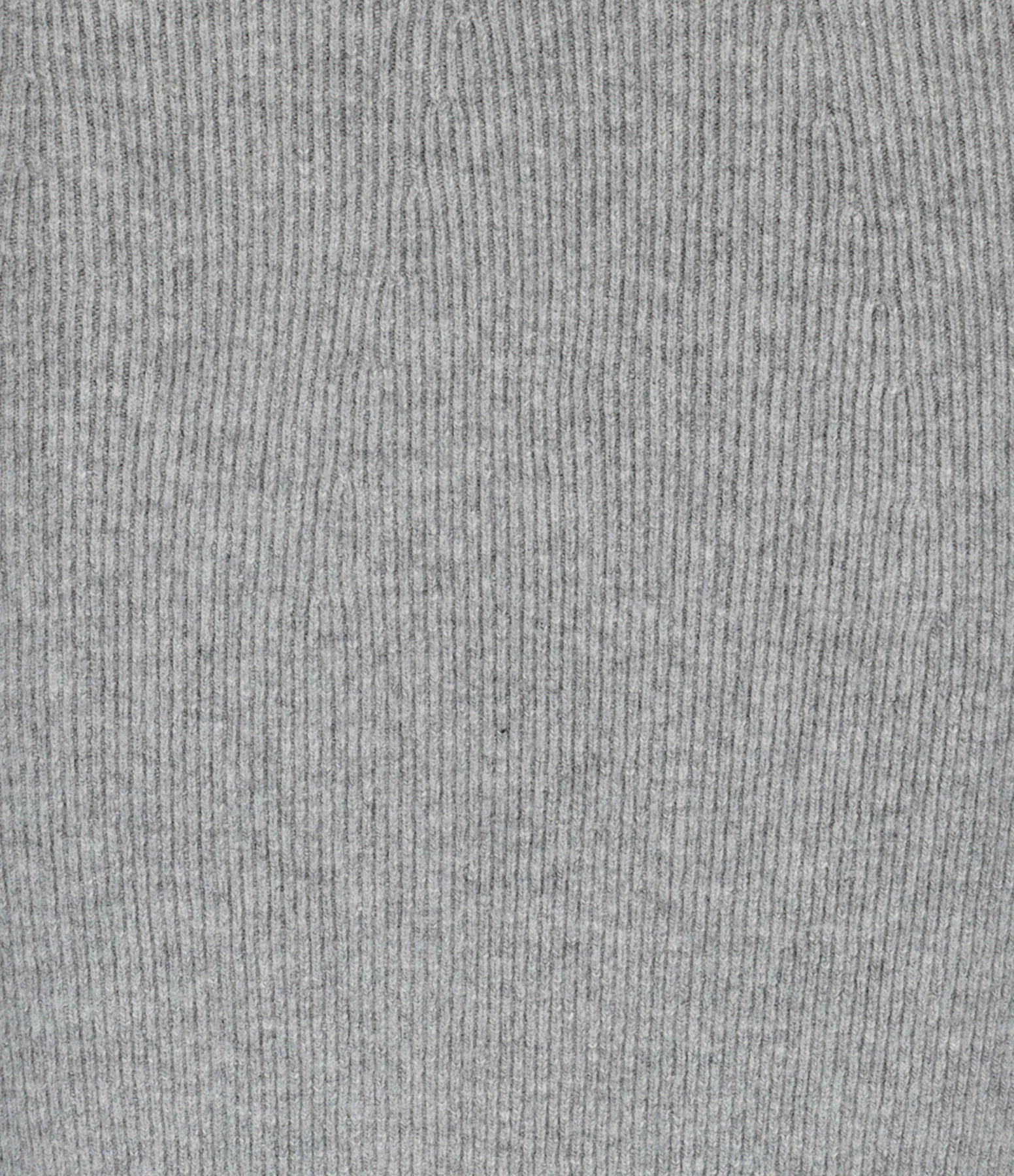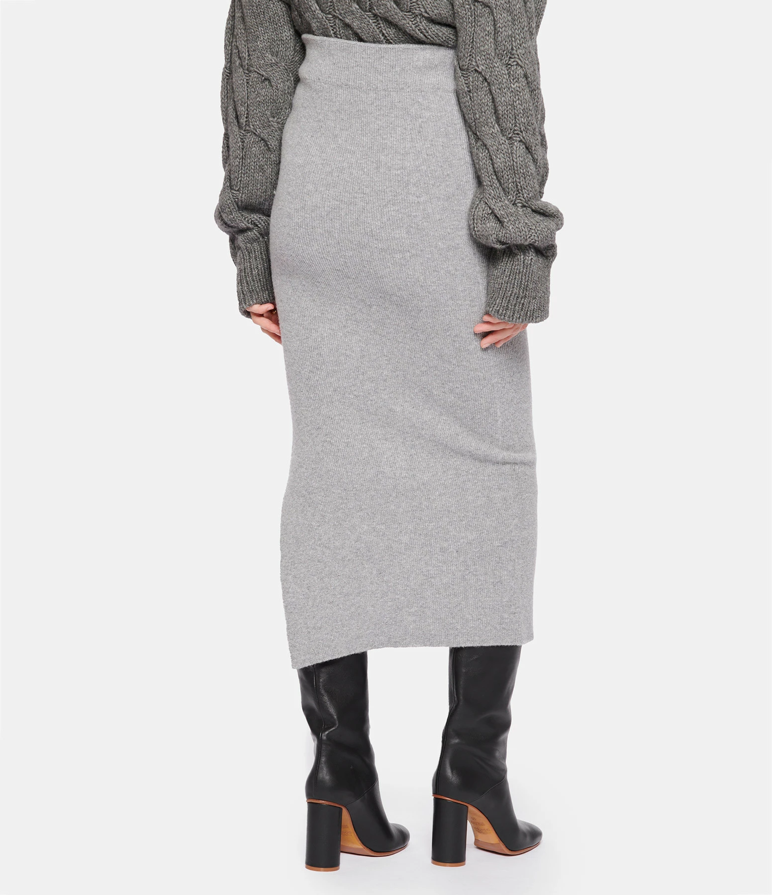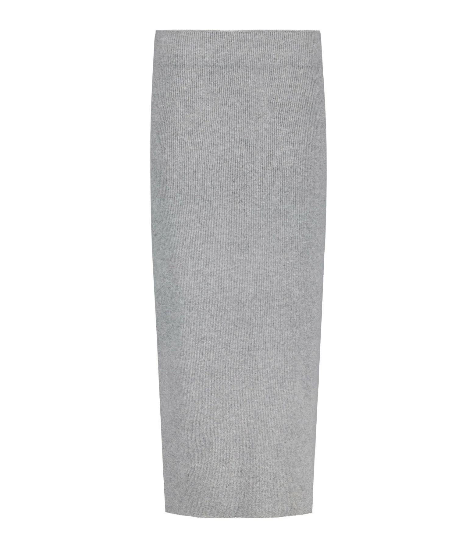 Jupe tube en tricot de laine gris. Taille élastiquée. Longueur midi. Fente sur le côté.