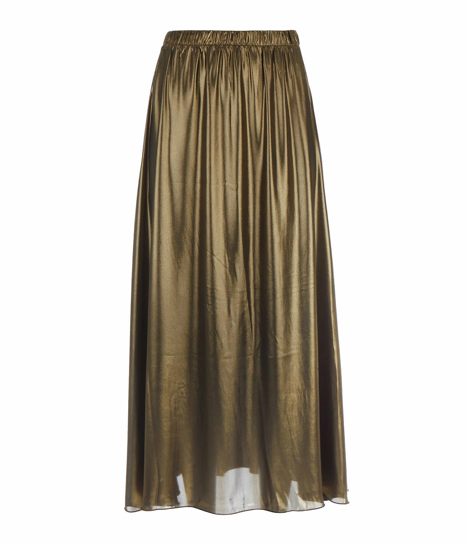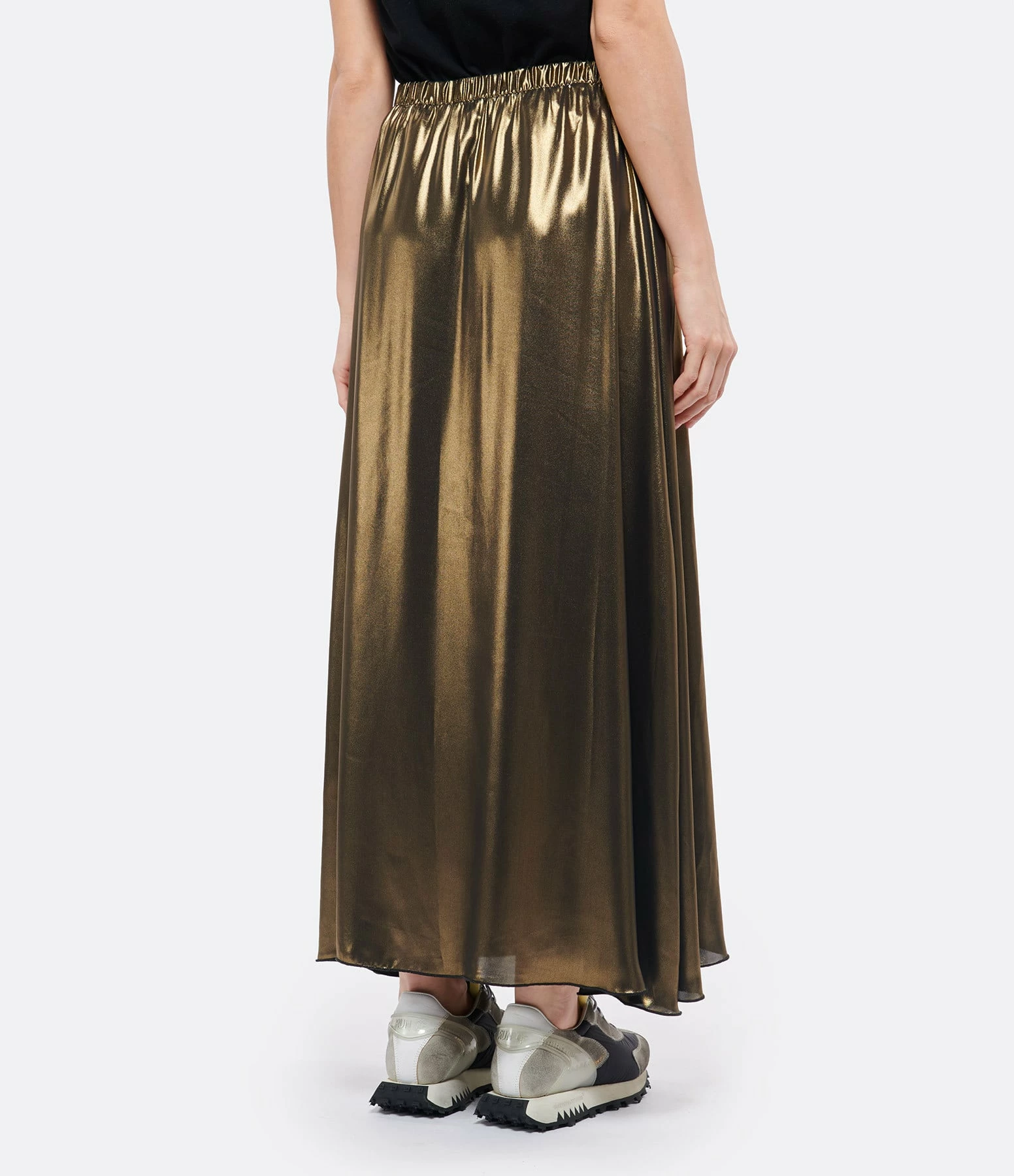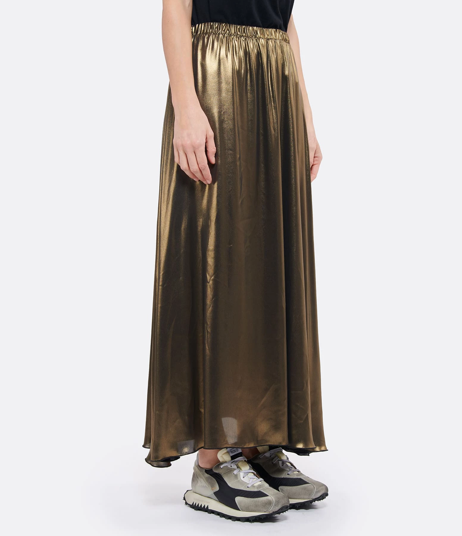 Jupe longue fluide doré. Taille élastiquée. Base droite. Coupe droite. Doublée.