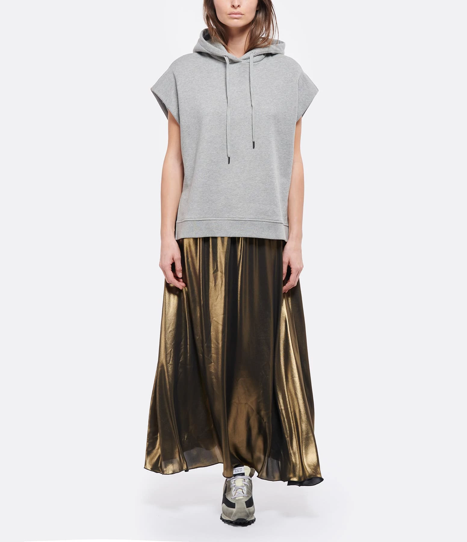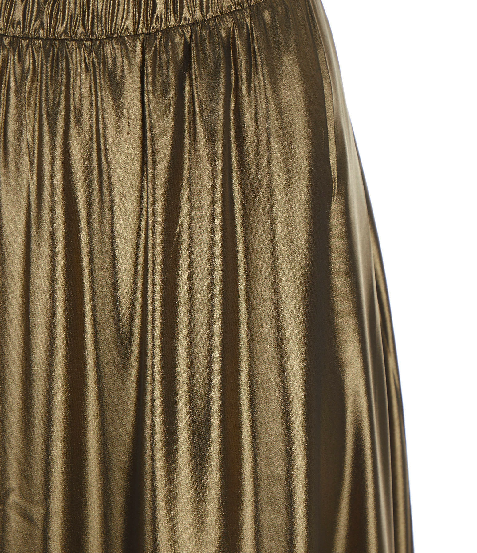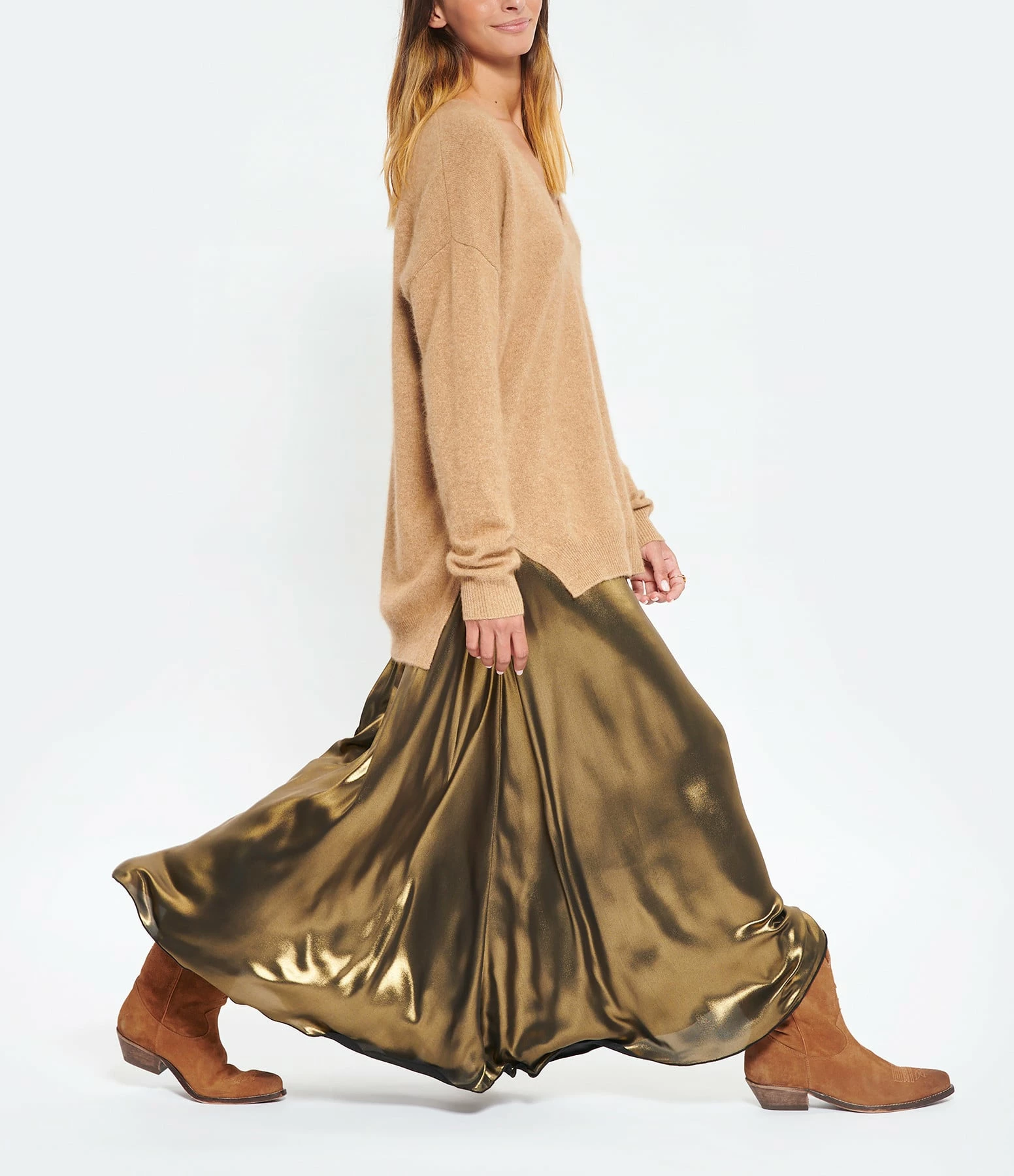 Jupe longue fluide doré. Taille élastiquée. Base droite. Coupe droite. Doublée.