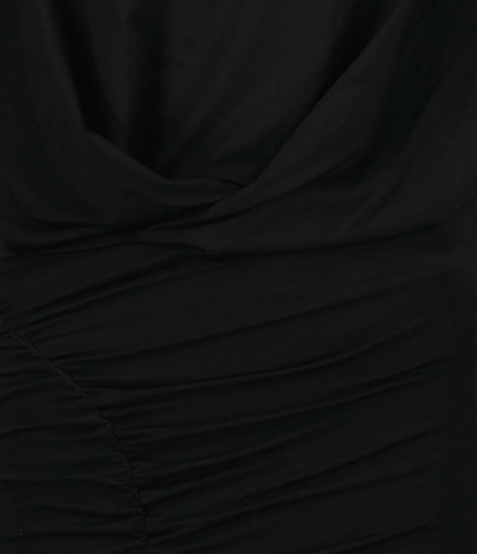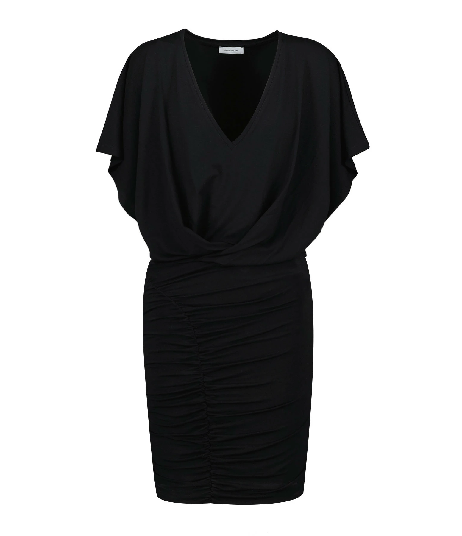 Robe courte noire. Col V effet cache-cœur. Manches courtes. Fronces sur le bas de la robe. Coupe près du corps. Base droite.