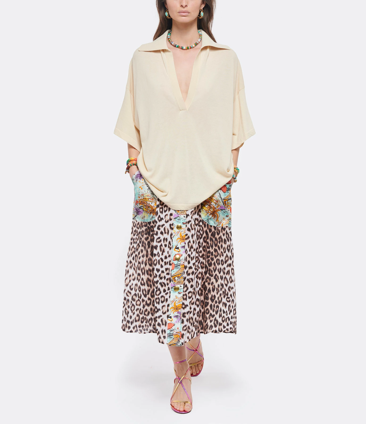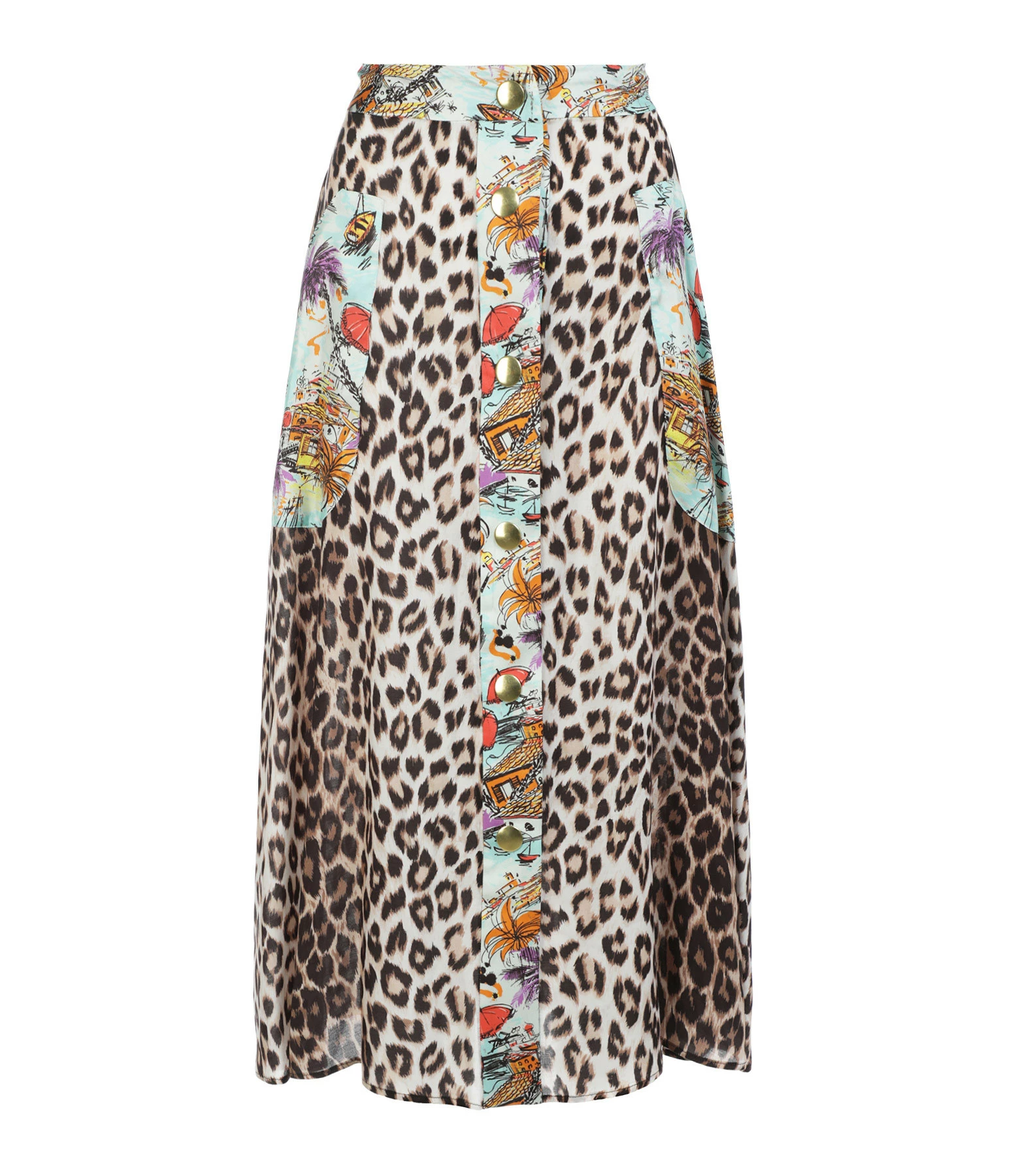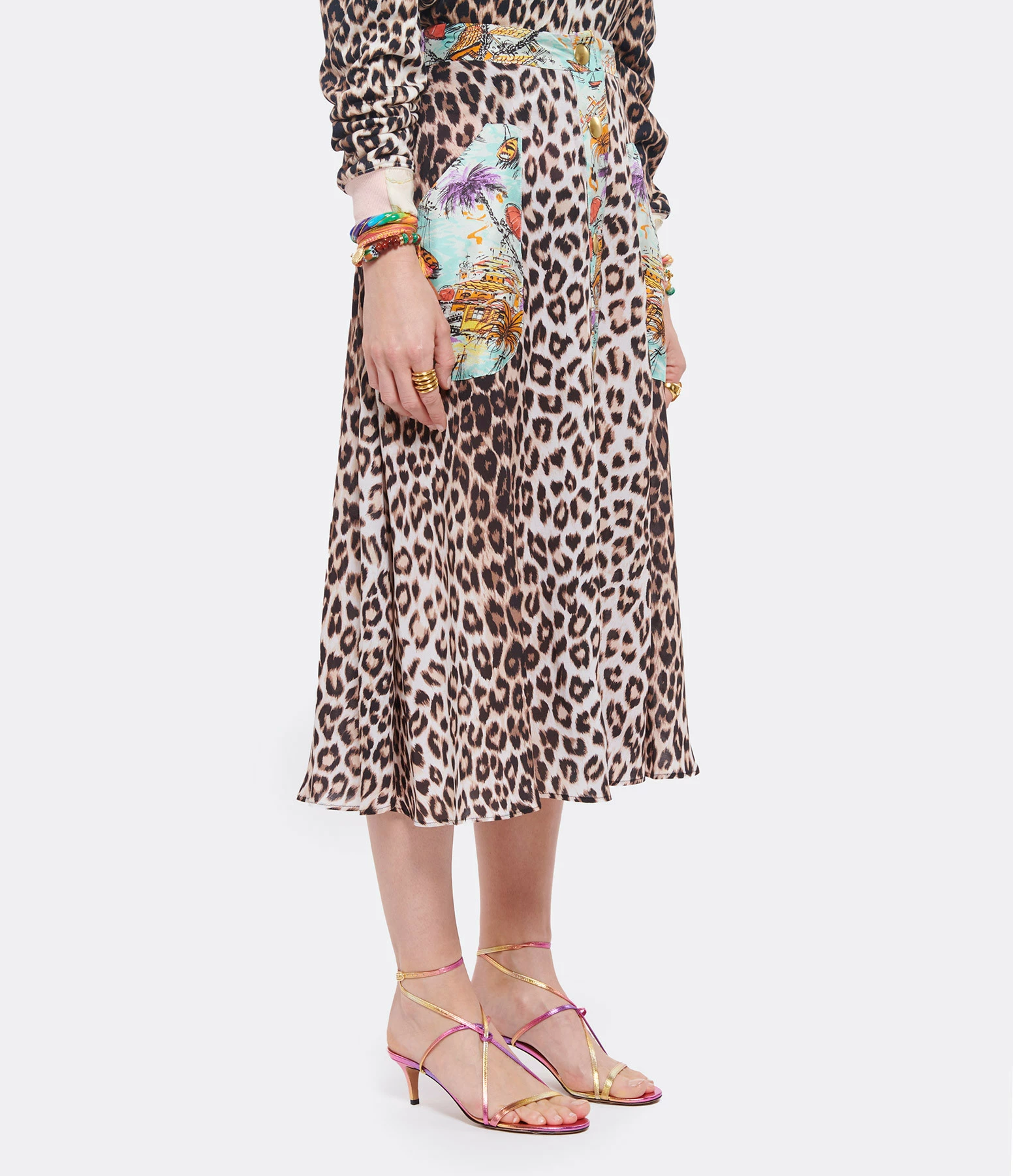 Jupe longue fluide en soie imprimée léopard et illustrations. Taille haute élastiquée. Poches sur le devant. Boutons pression dorés. Coupe légèrement évasée. Base droite. Non doublée.