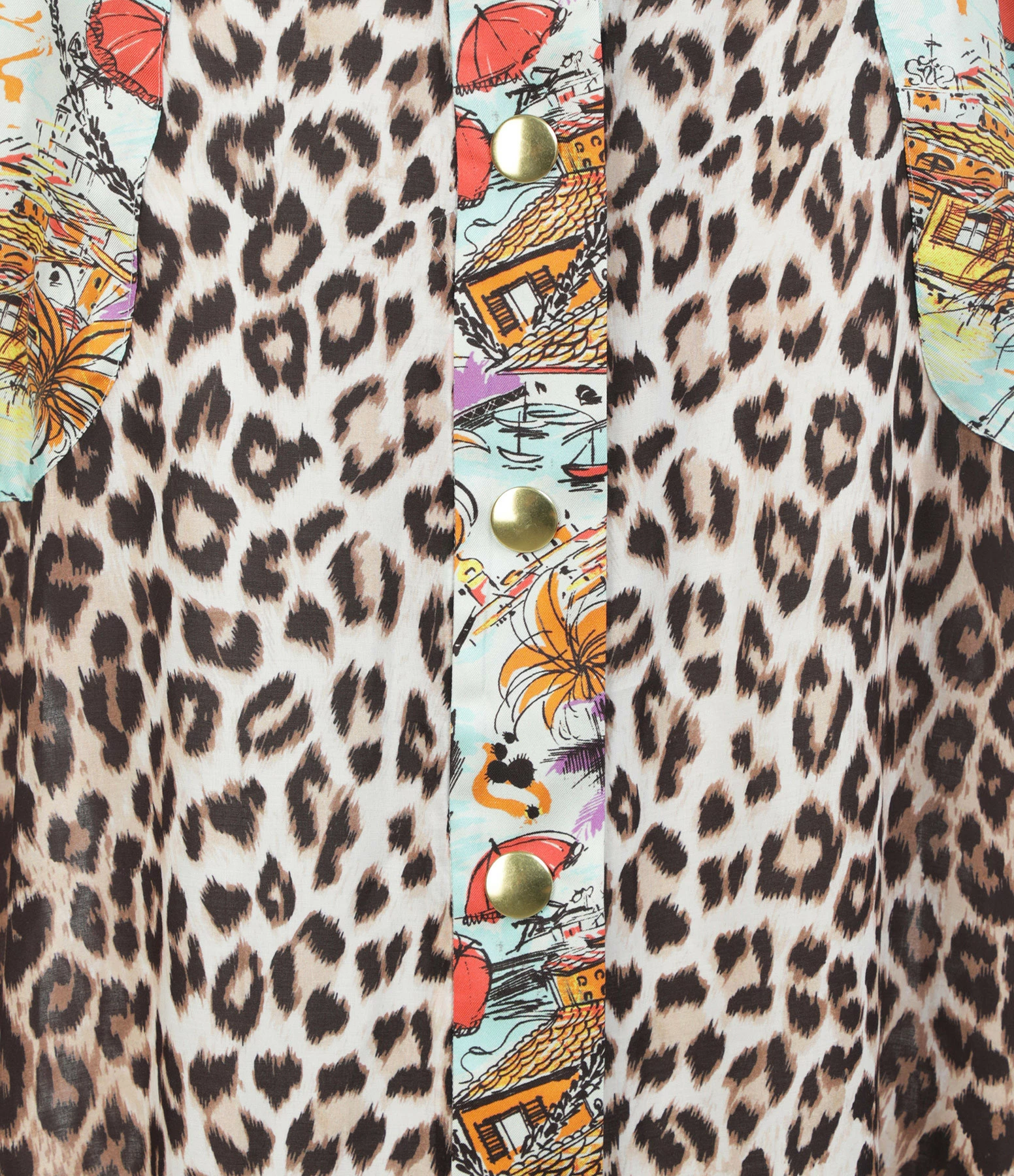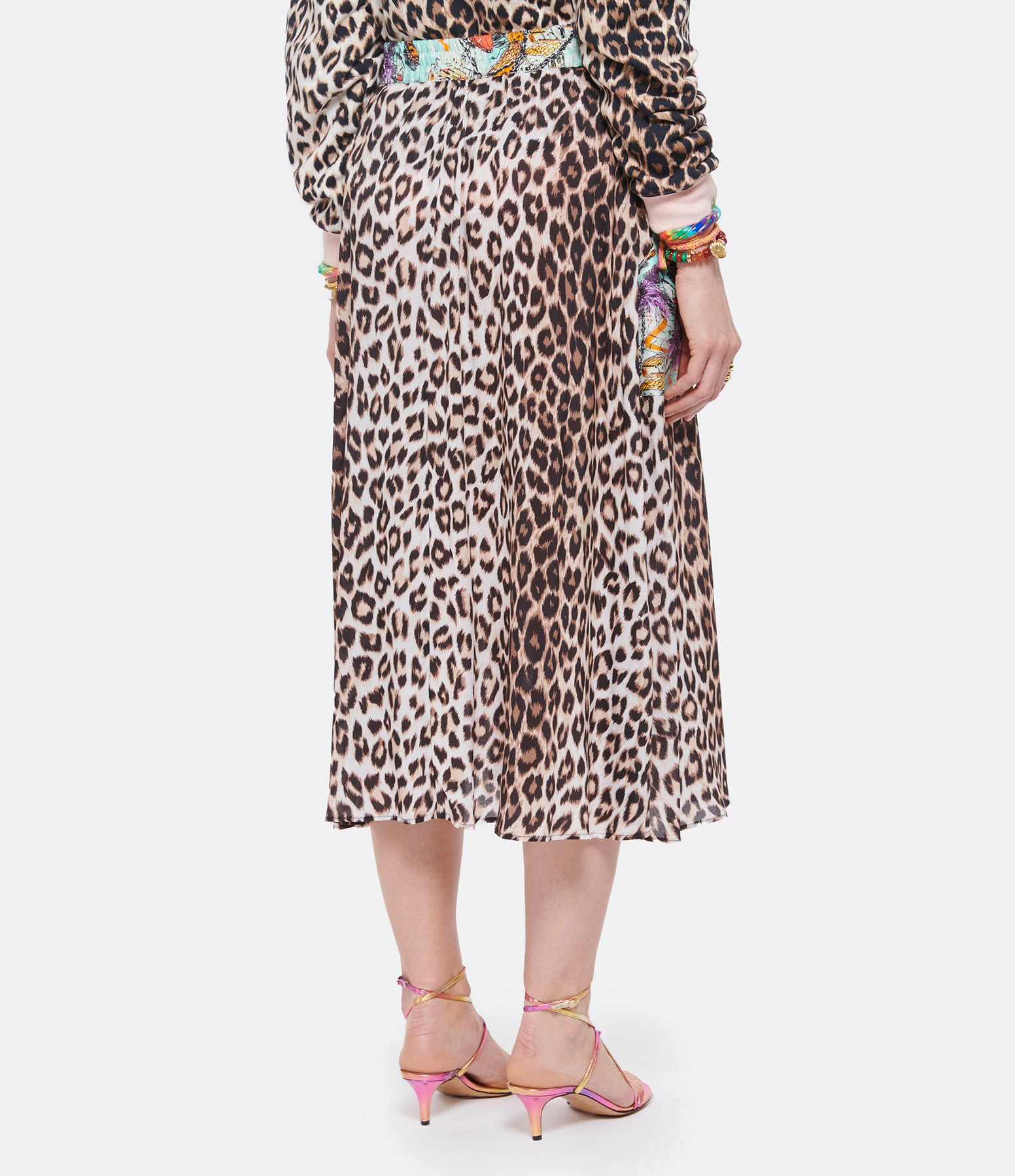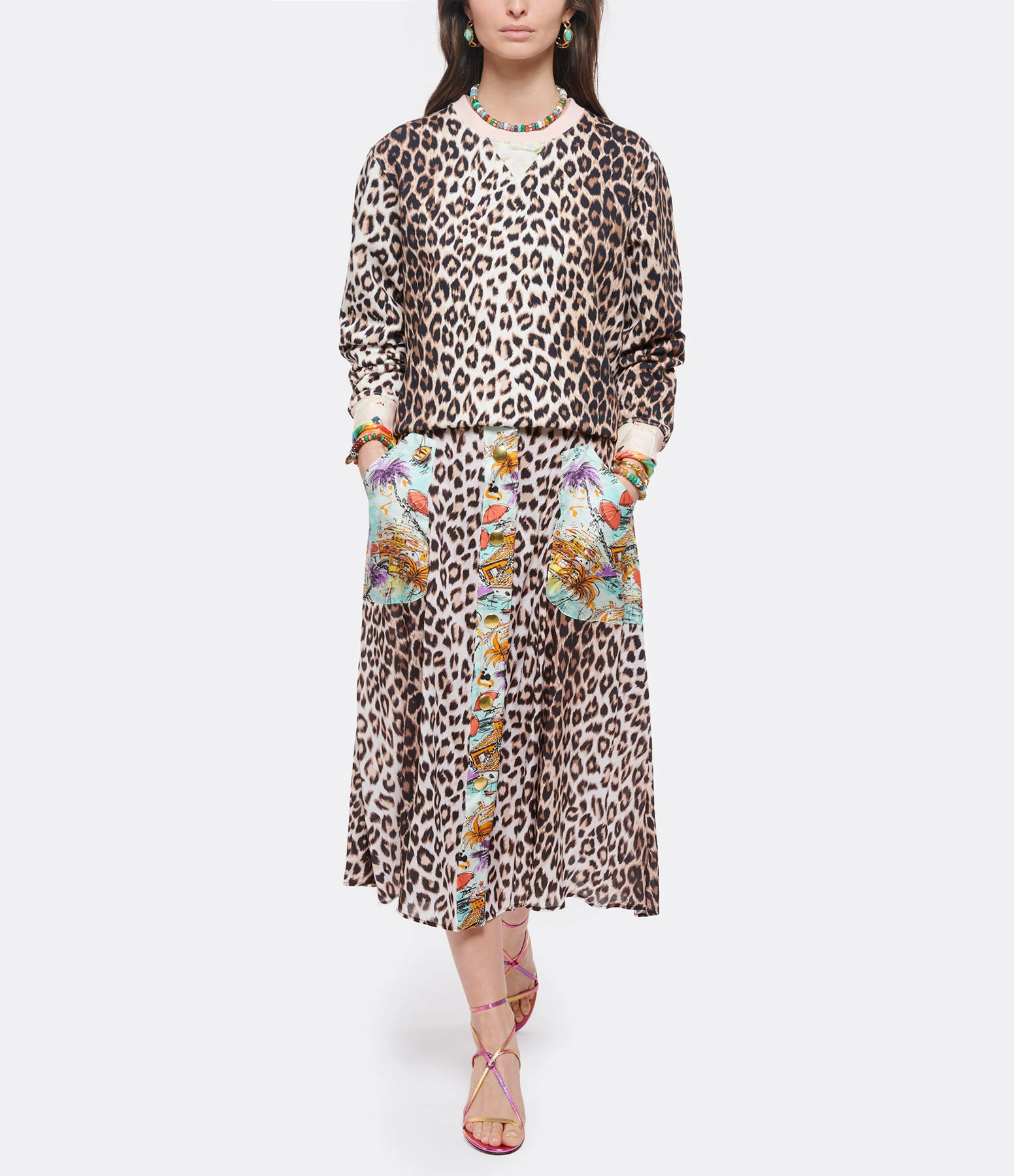 Jupe longue fluide en soie imprimée léopard et illustrations. Taille haute élastiquée. Poches sur le devant. Boutons pression dorés. Coupe légèrement évasée. Base droite. Non doublée.