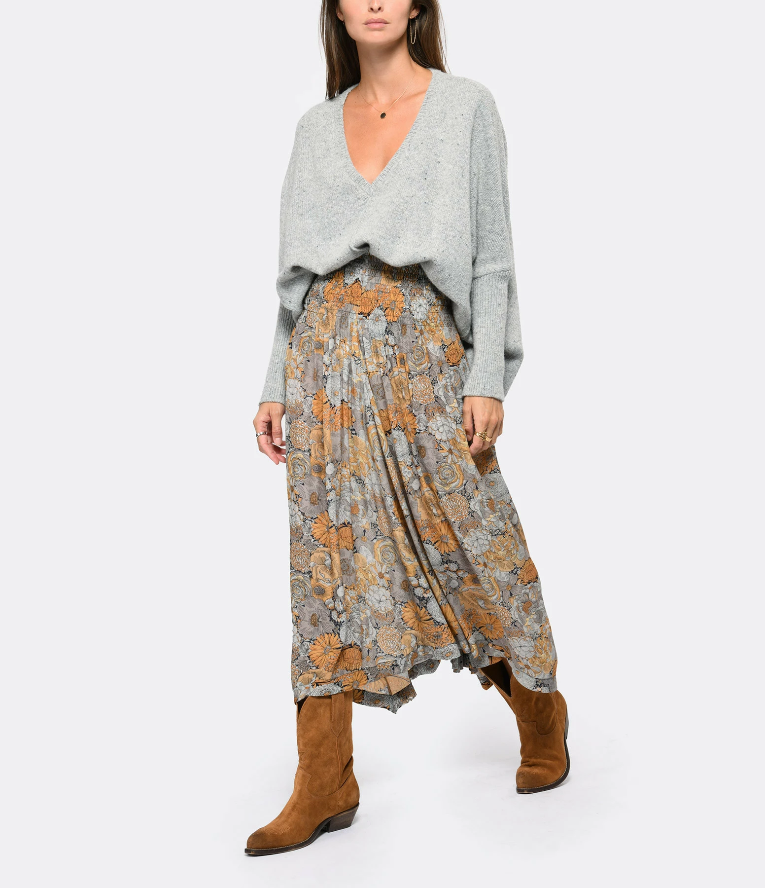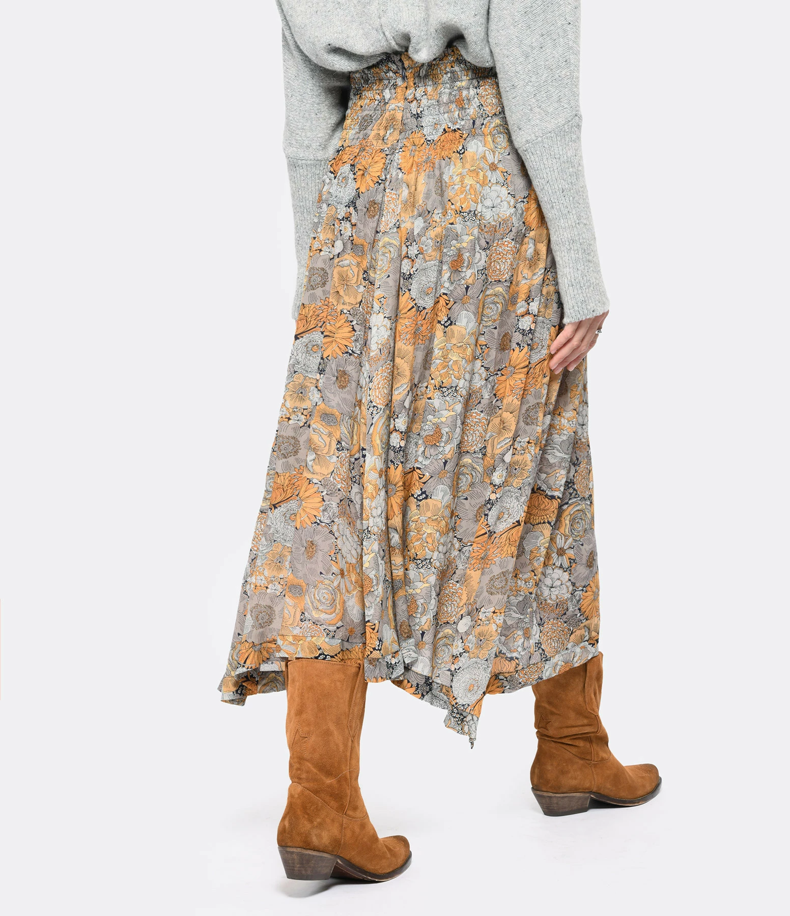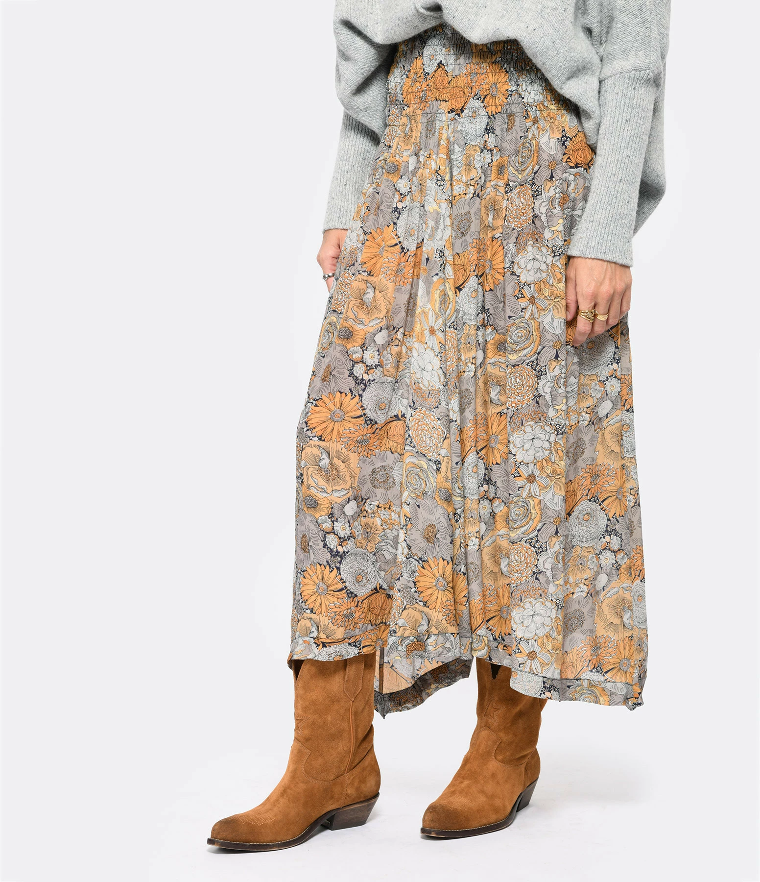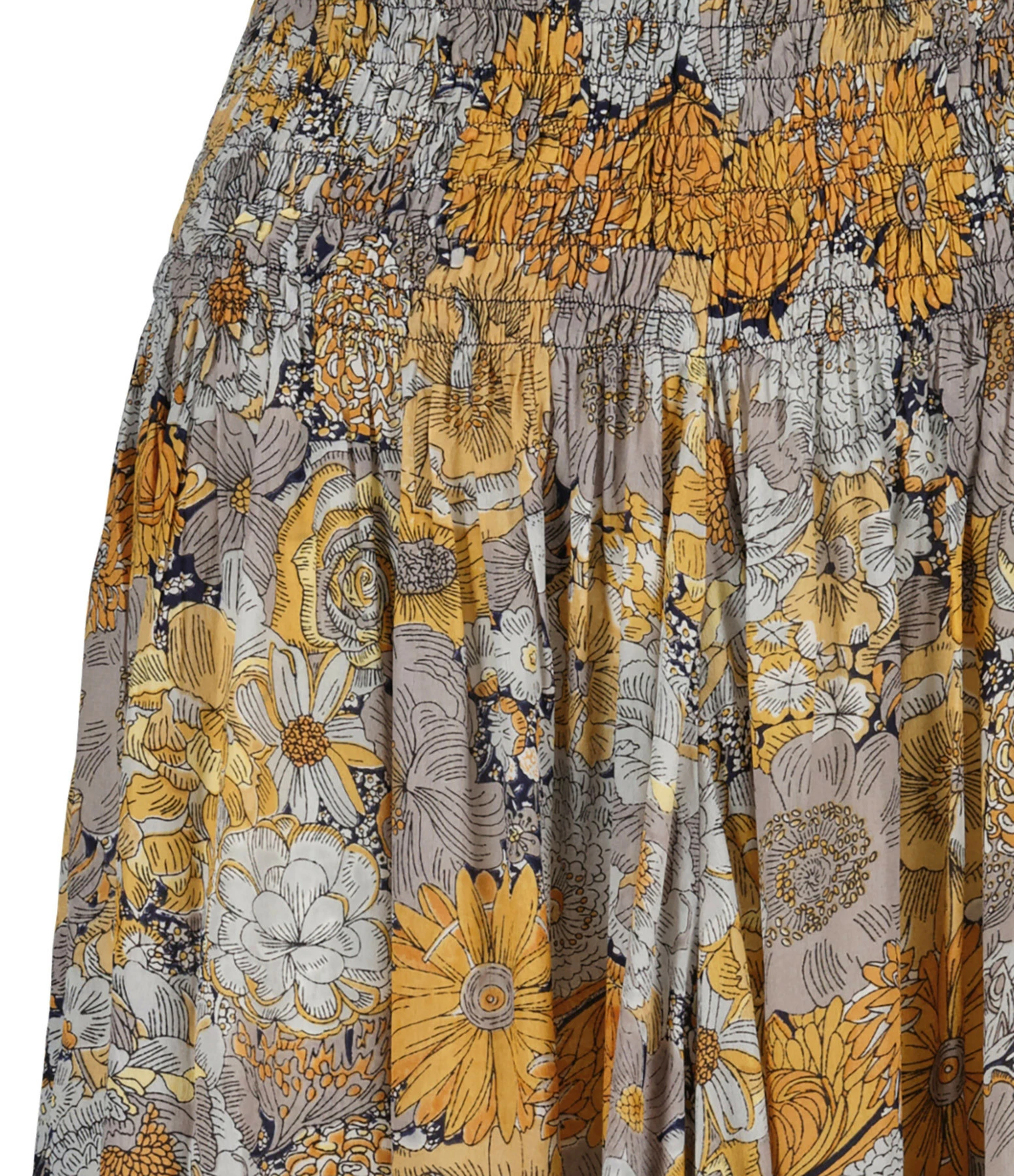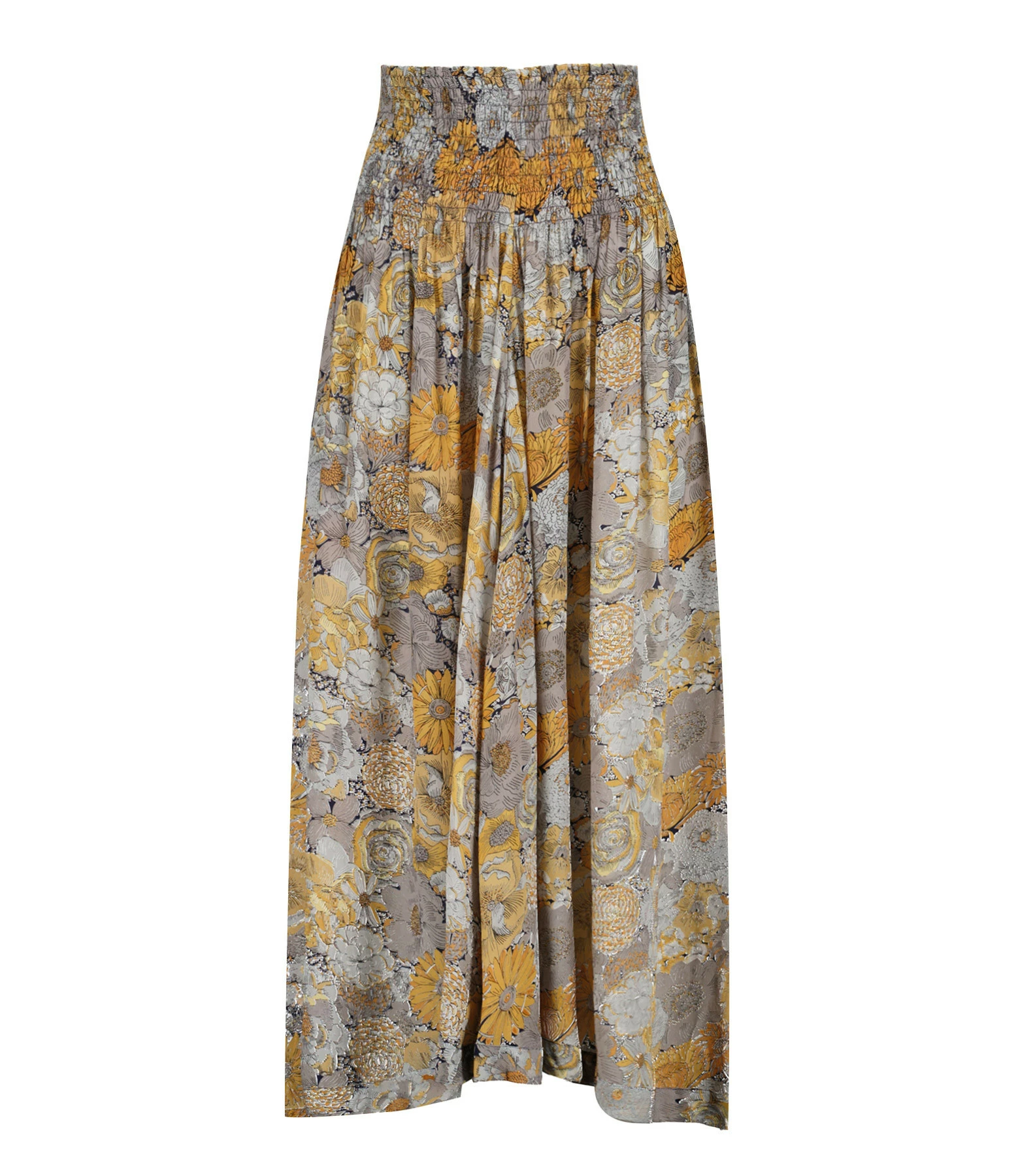 Jupe longue froncée à imprimé fleuri dans des tons gris et jaunes. Taille haute smockée. Fermeture zippée invisible dans le dos et crochet. Coupe évasée. Base droite.