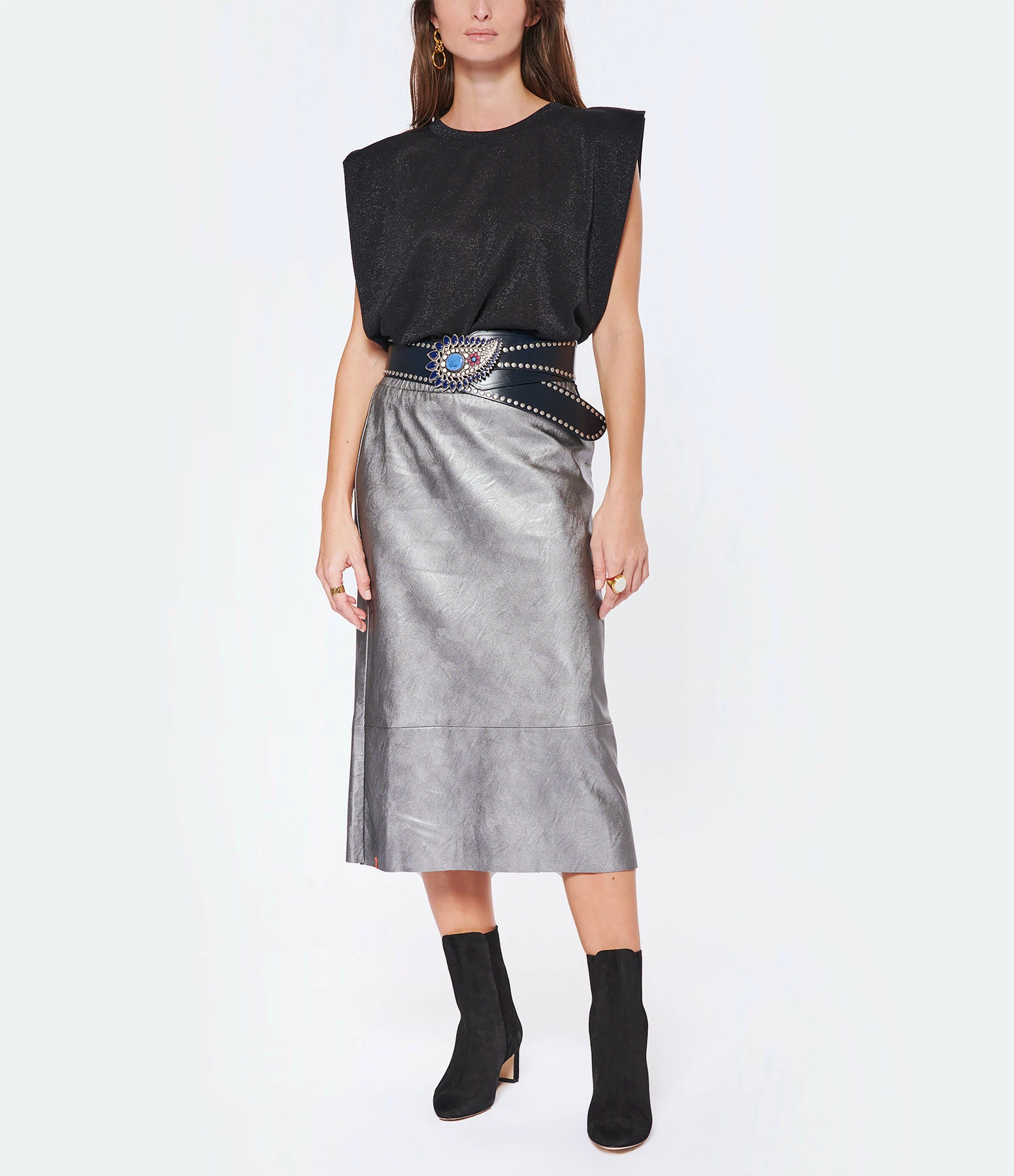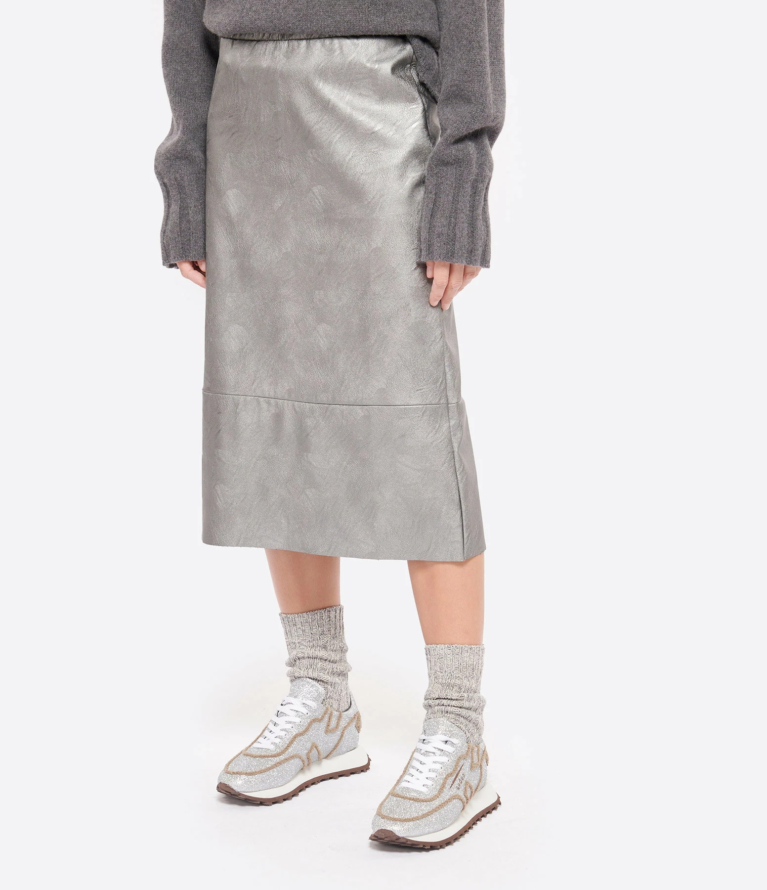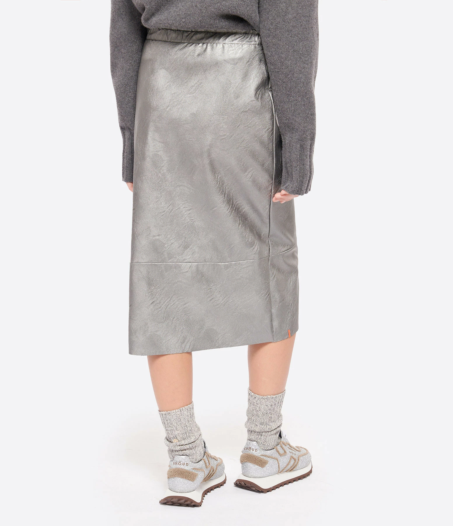 Jupe mi-longue en cuir vegan argenté. Taille élastiquée. Coupe droite. Base droite.