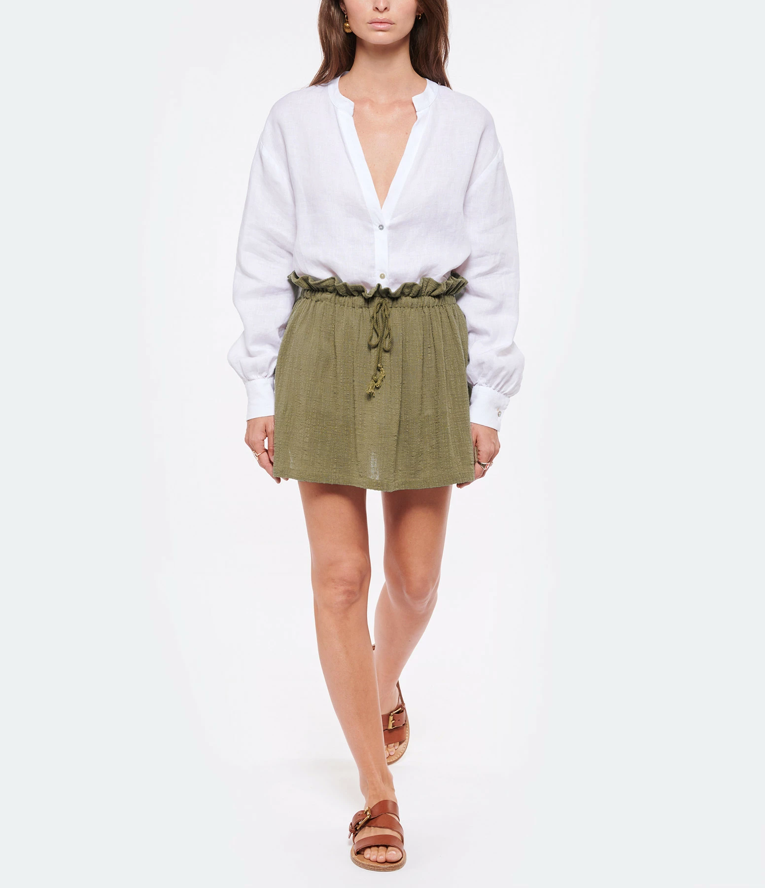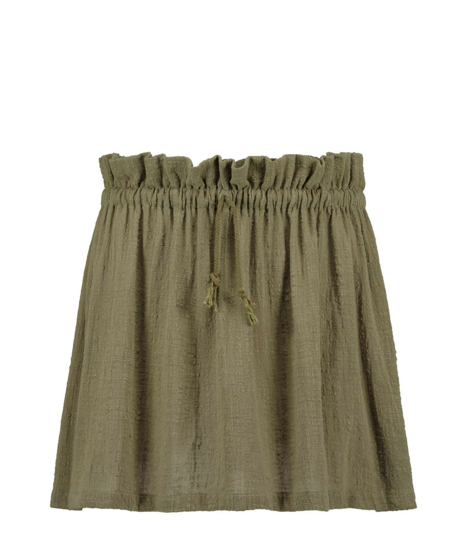 Jupe courte en coton vert kaki. Taille élastiquée avec cordon de serrage. Coupe évasée. Base droite.