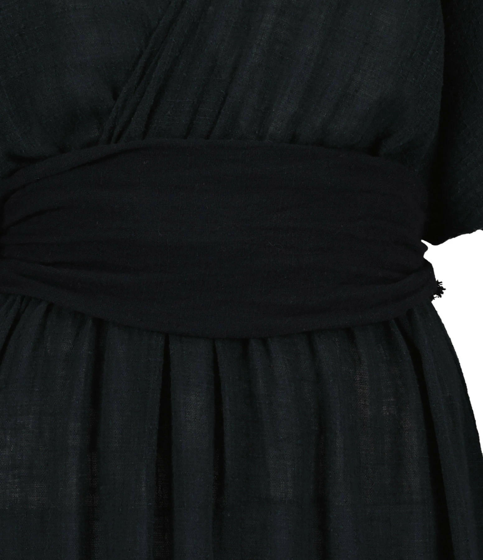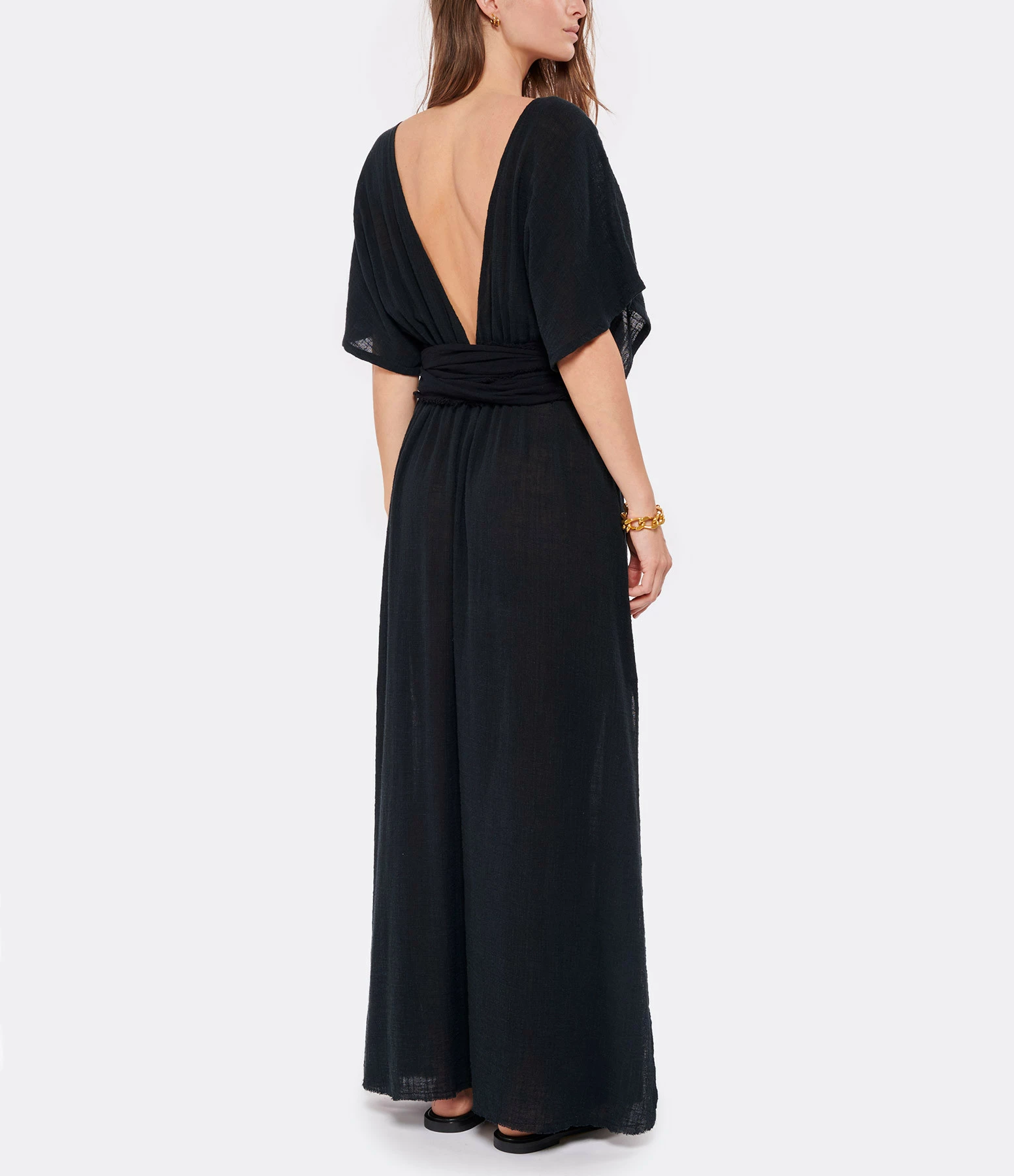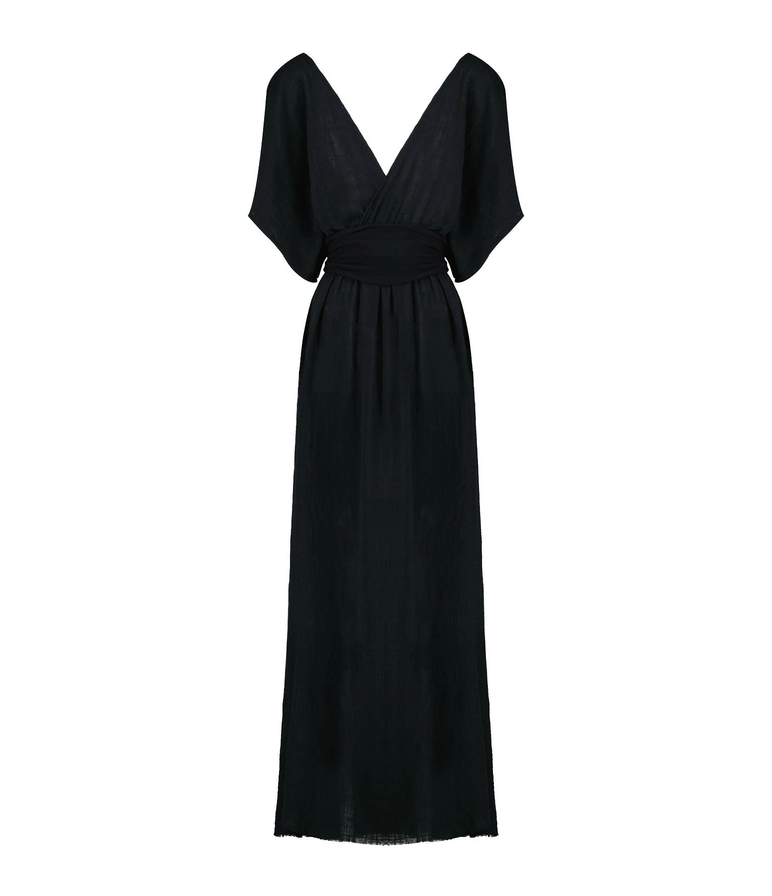 Robe longue en coton noir. Col en V plongeant devant et derrière. Manches courtes. Taille élastiqué. Ceinture amovible à nouer à la taille. Non doublé. Coupe ample. Base droite.