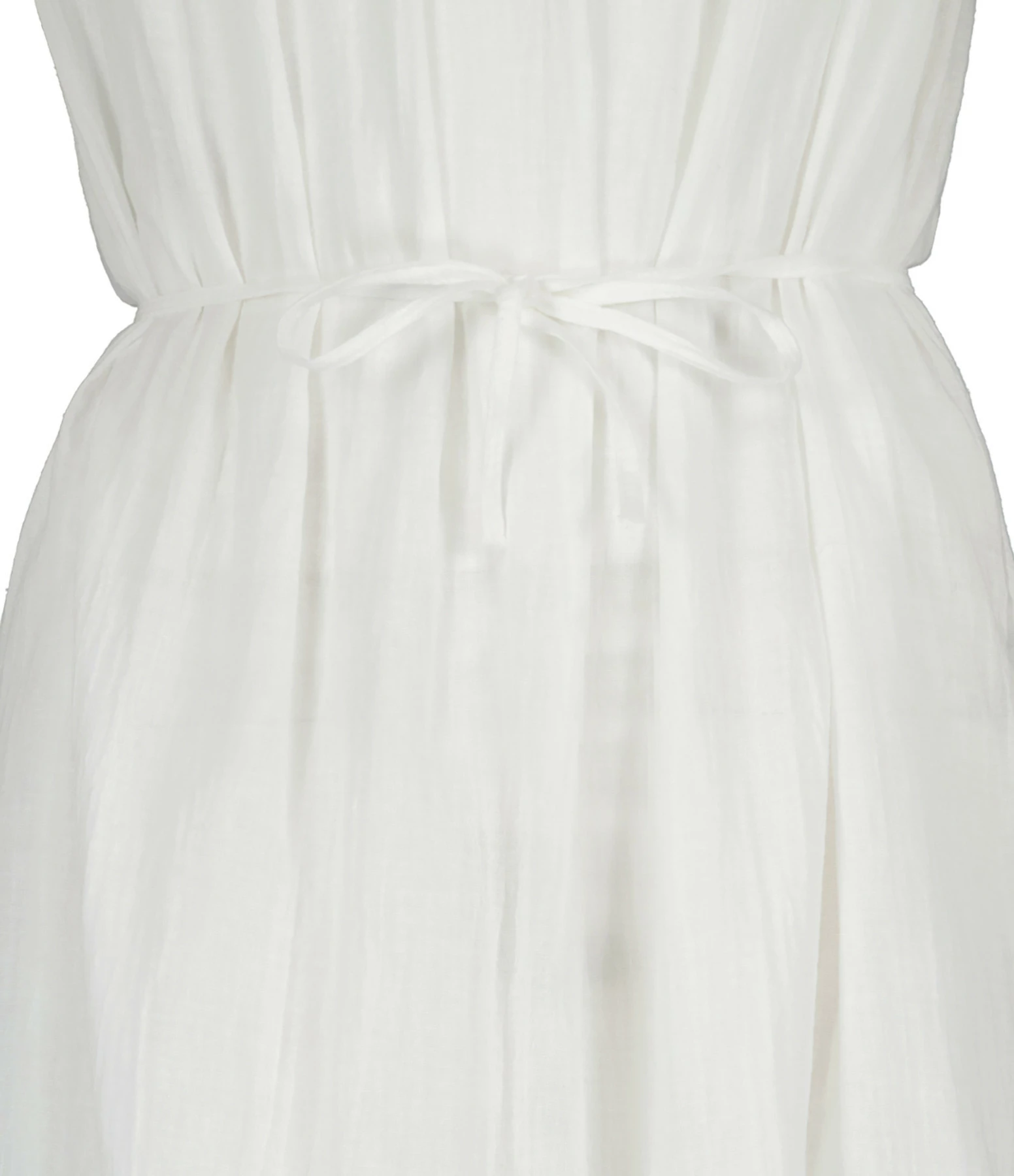 Robe longue en coton blanc. Col rond. Sans manches. Fines bretelles. Dos nu en U froncé avec lanières d’ajustement pouvant être nouées autour de la taille. Coupe droite ample. Base droite. Finitions brutes. Non doublée. Tissu respirant légèrement transparent.