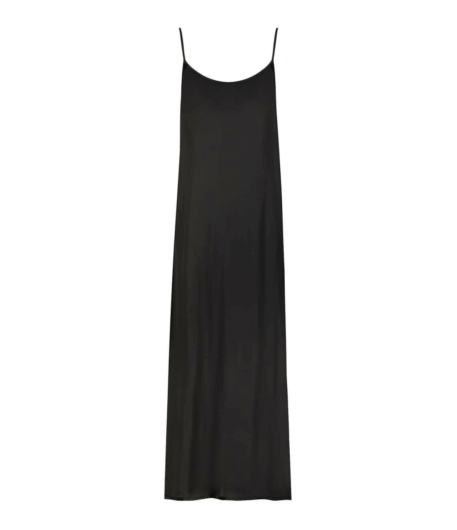 Robe longue dos nu en viscose noire. Fines bretelles réglables. Dos nu en V avec fermeture éclair fine. Fendue sur les côtés au niveau de la cuisse. Non doublé. Coupe ample. Base droite.