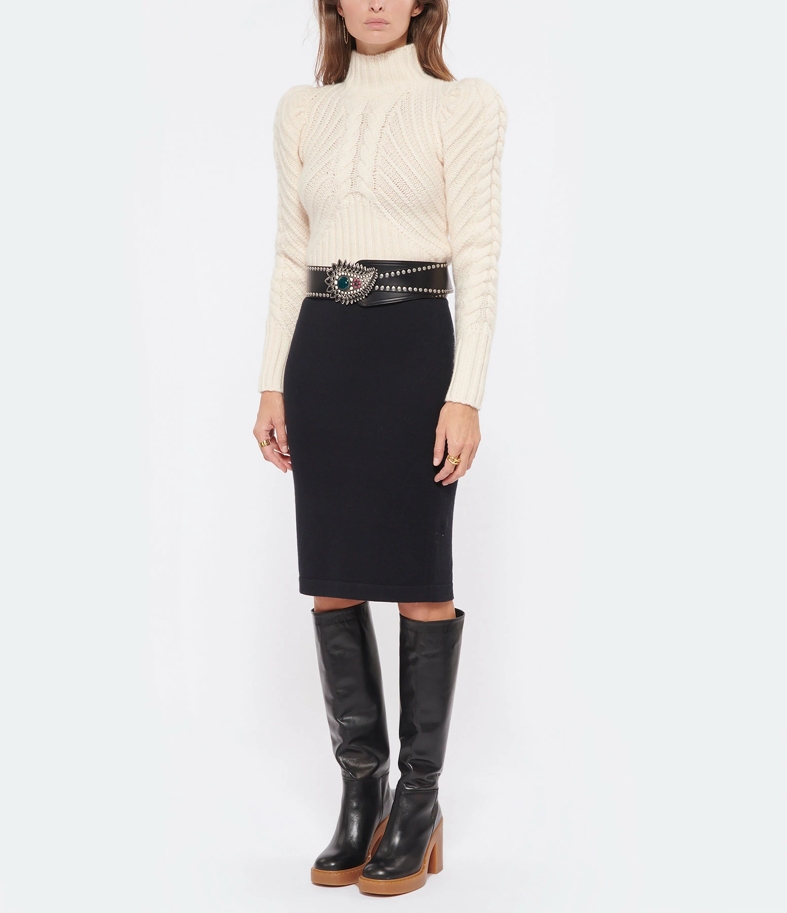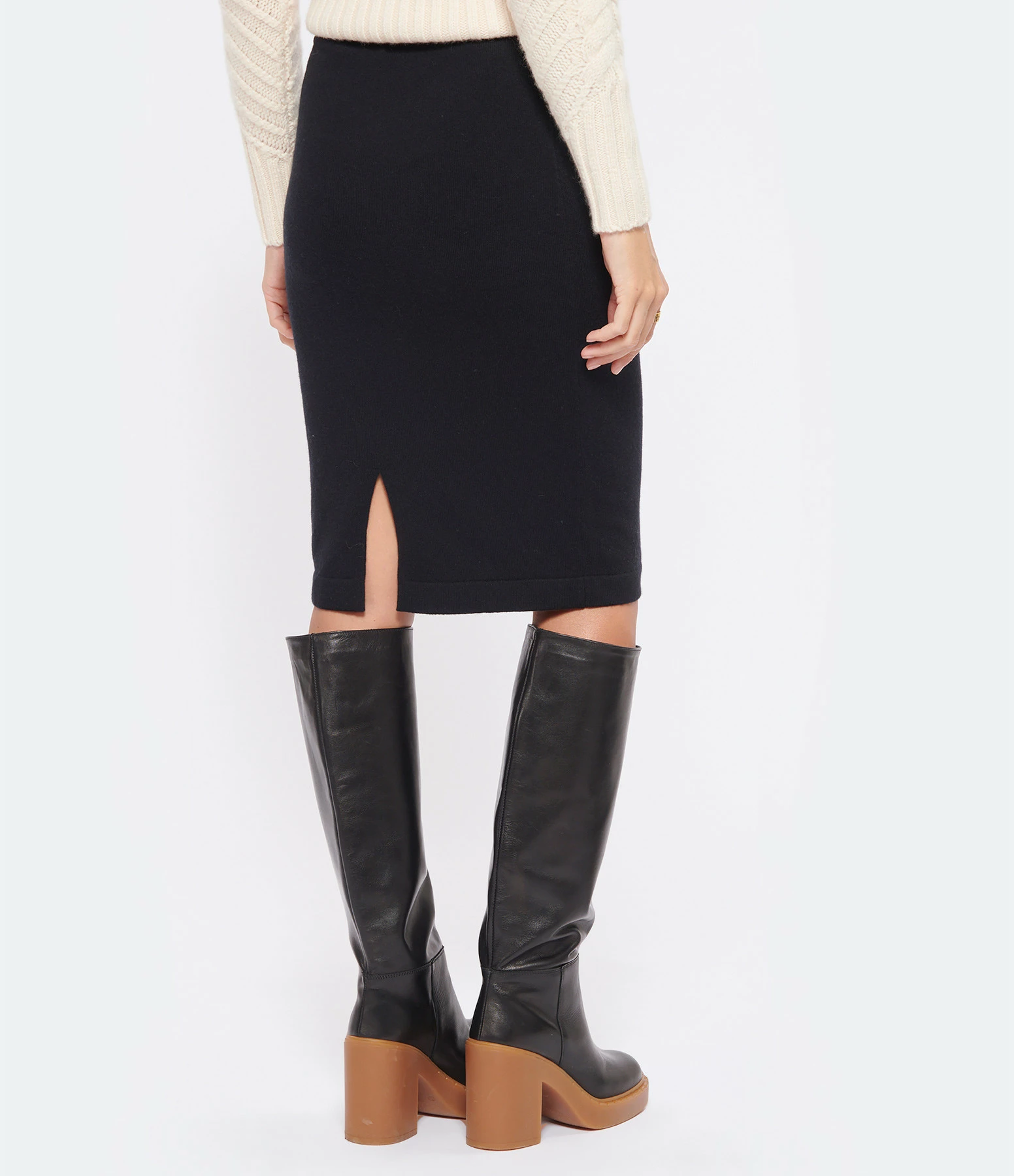 Jupe mi-longue en cachemire noir. Taille élastiquée. Fente arrière. Coupe droite. Base droite.